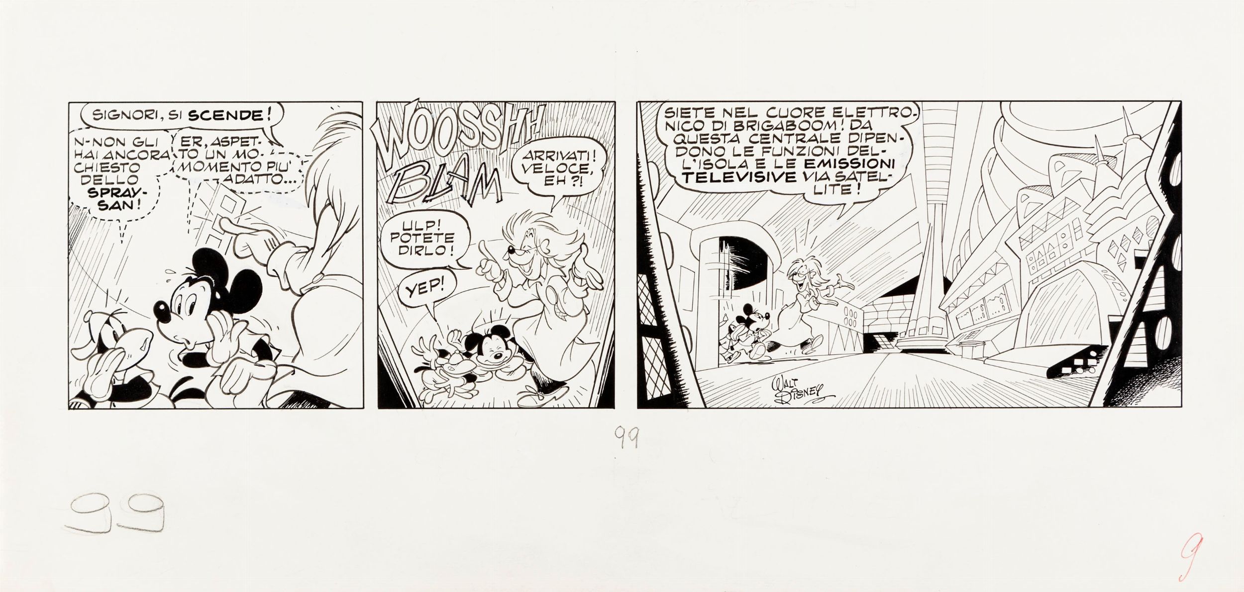 1990 Tavola originale realizzata da Scarpa per la strip-story 'Topolino e l‘enigma di Brigaboom', tav. 99 edita su Topolino n. 1787 nel Febbraio 1990.