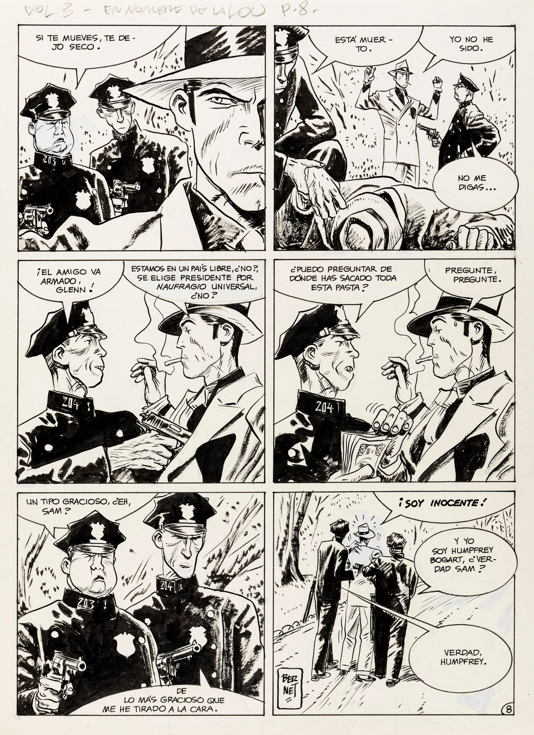 matita e china su cartoncino, 31,5 x 43 cm 1985 Tavola originale realizzata da Bernet per 'In nome della Lou', episodio n. 29 di Torpedo edita per la prima volta in Spagna con il titolo 'En nombre de la Lou' sulla rivista Comix Internacional n. 59 nel 1985. Firmata.