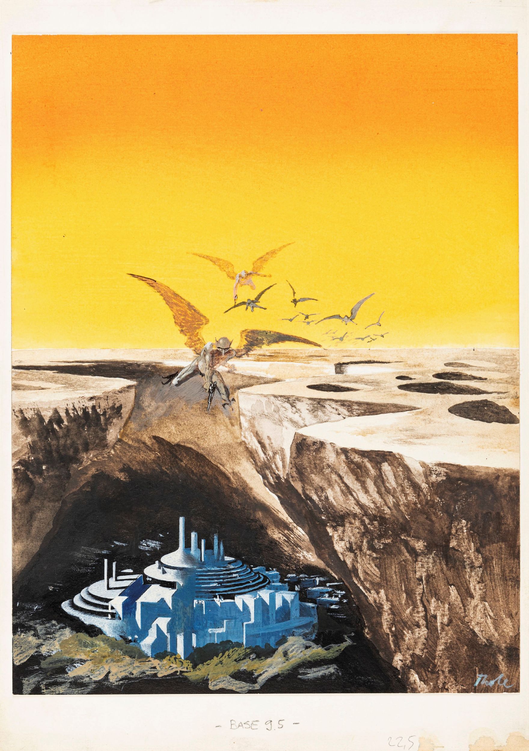 tempera su cartoncino applicato a cartone, 24 x 31,5 cm 1980 Originale di copertina realizzato da Thole per il romanzo 'Cronache della Lega Polesotecnica' di Poul Anderson, edito nella collana Cosmo n. 105 dalla Editrice Nord nel 1980. Successivamente ristampato per il romanzo 'I danzatori del crepuscolo' di Jack Chalker nella celebre collana Urania n. 1065 nel 1988. Firmato.