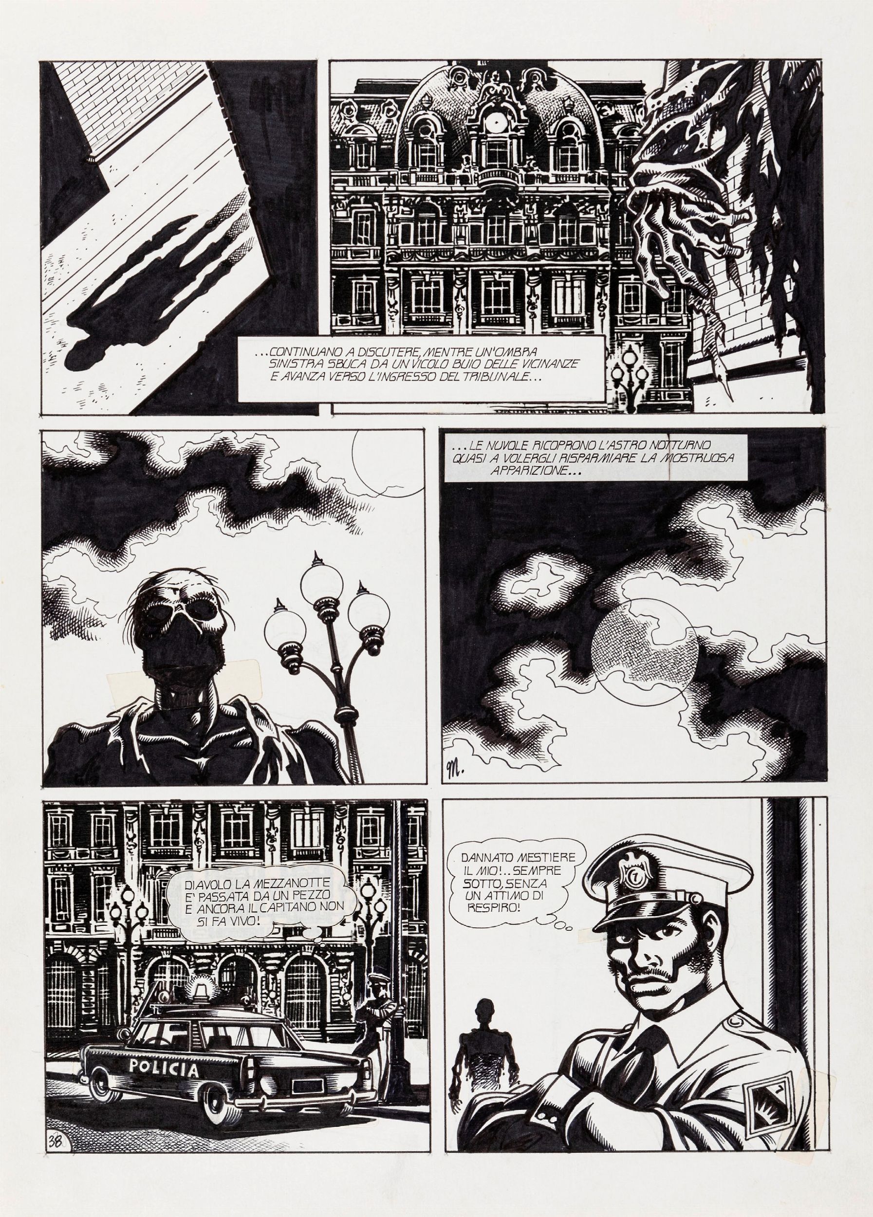 matita, china e pennarello su cartoncino, 29 x 40 cm 1979 Tavola originale realizzata da Magnus per 'Vendetta Macumba' edita a pag. 38 dalla Edifumetto nel 1979. Una delle pagine di maggior pathos dell'intero albo, una sequenza cinematografica che immortala perfettamente l'incedere inesorabile della vendetta. Nella seconda e quinta vignetta il palazzo è in fotocopia. Siglata.