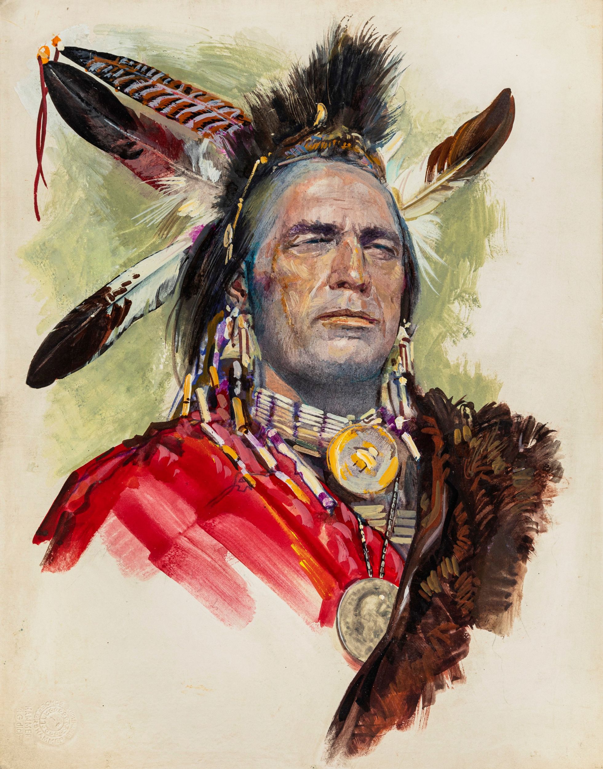 1976 Illustrazione originale realizzata a quattro mani da De Gaspari e Tempesti per la figurina n. 1 raffigurante il capo indiano Pontiac, edita sull'album 'West' dalla Panini nel 1976.