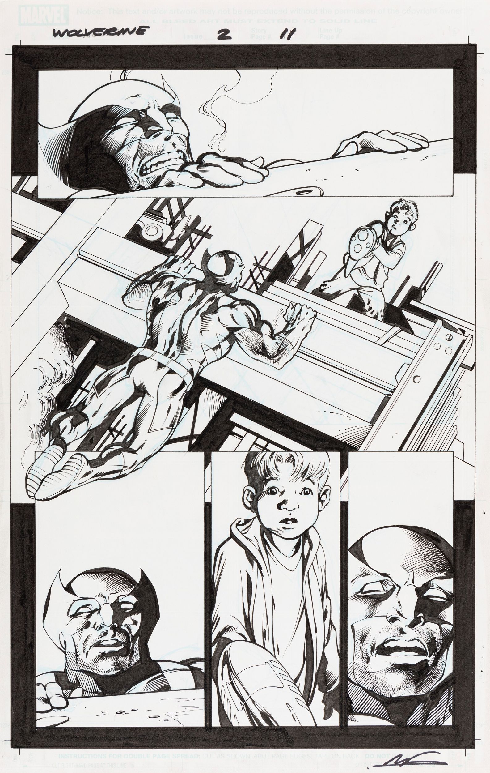 2013 Tavola originale realizzata da Davis per 'Hunting Season', edita su Wolverine n. 2 a pag. 11 dalla Marvel nel 2023. Chine di Mark Farmer. Firmata da Farmer.