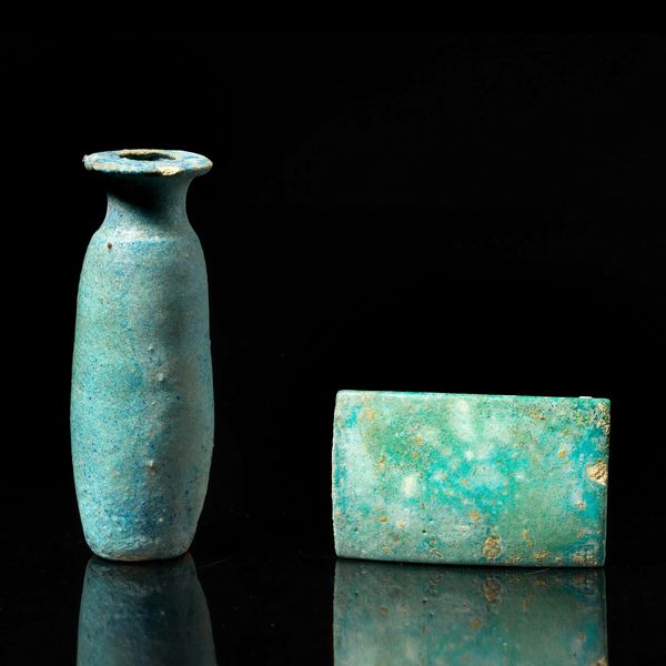 Alabastron lungo e sottile con collo stretto, orlo a tesa larga ed estroflessa e fondo piatto. Utilizzato nell'antichità per contenere olio, in particolare oli da profumo o da massaggio; piastra leggermente convessa esternamente, dotata di ulteriore sporgenza rettangolare sul rovescio, forata per la sospensione. Le piastre di faience (come questa) rivestivano diverse stanze sotterranee del complesso piramidale a gradoni della III Dinastia del Re Djoser (2613 - 2494 a.C.).