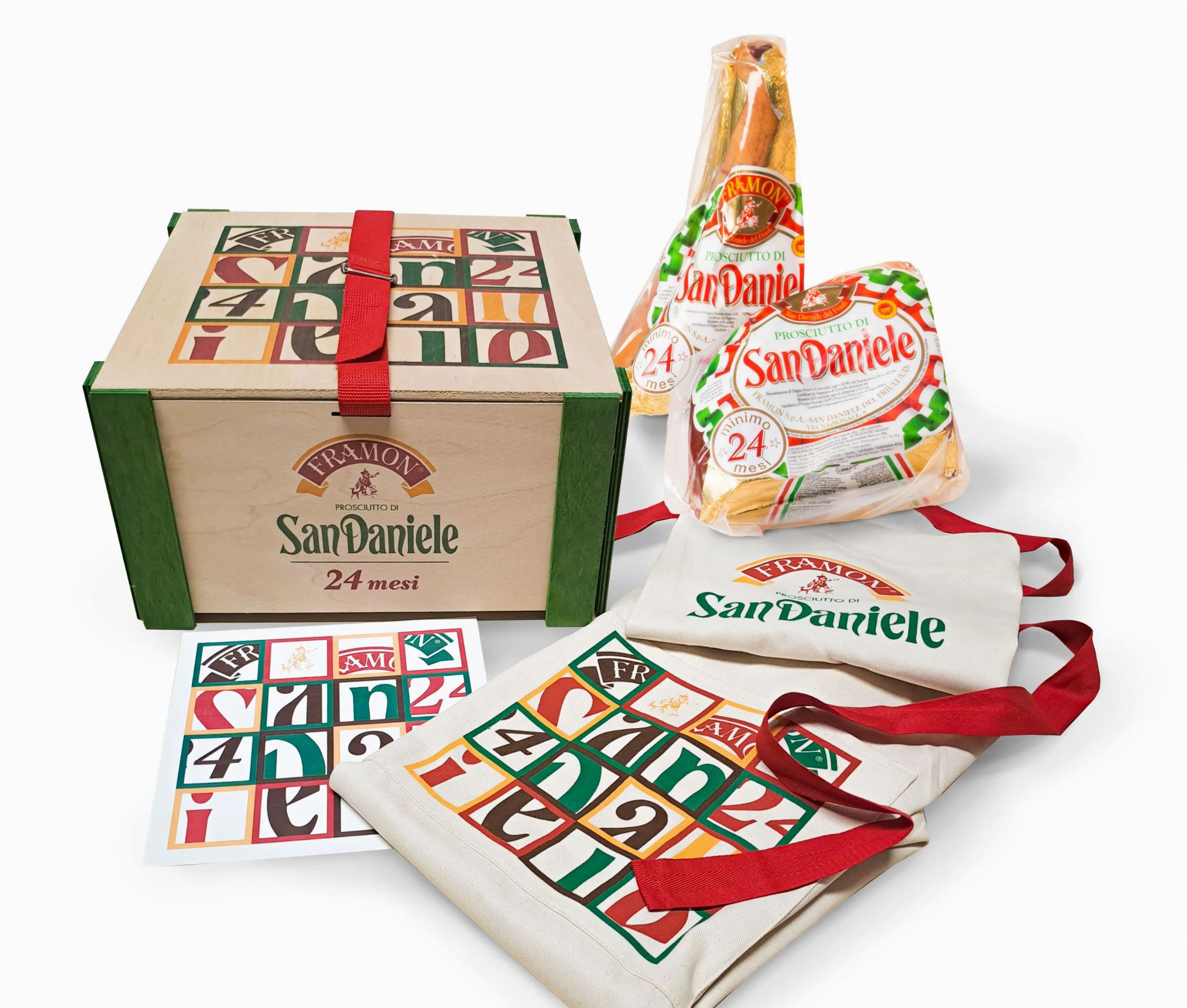 Due Cassettine in Legno Contenenti Due Tranci Prosciutto di San Daniele DOP 24 Mesi e Parannanza Peso medio prodotto: 3,3Kg (totale dei 2 tranci) Premiato con le 3 Fette Gambero Rosso nella guida Salumi Italiani Dal profumo intenso, con note elegantemente decise. L’esperienza di assaggio del San Daniele Framon si arricchisce dei sentori resinosi della Alpi Carniche, che incontrano le brezze dell’alto Adriatico sul letto del fiume Tagliamento. Nella cassettina in legno, una parannanza in morbido cotone, stampa futurista
