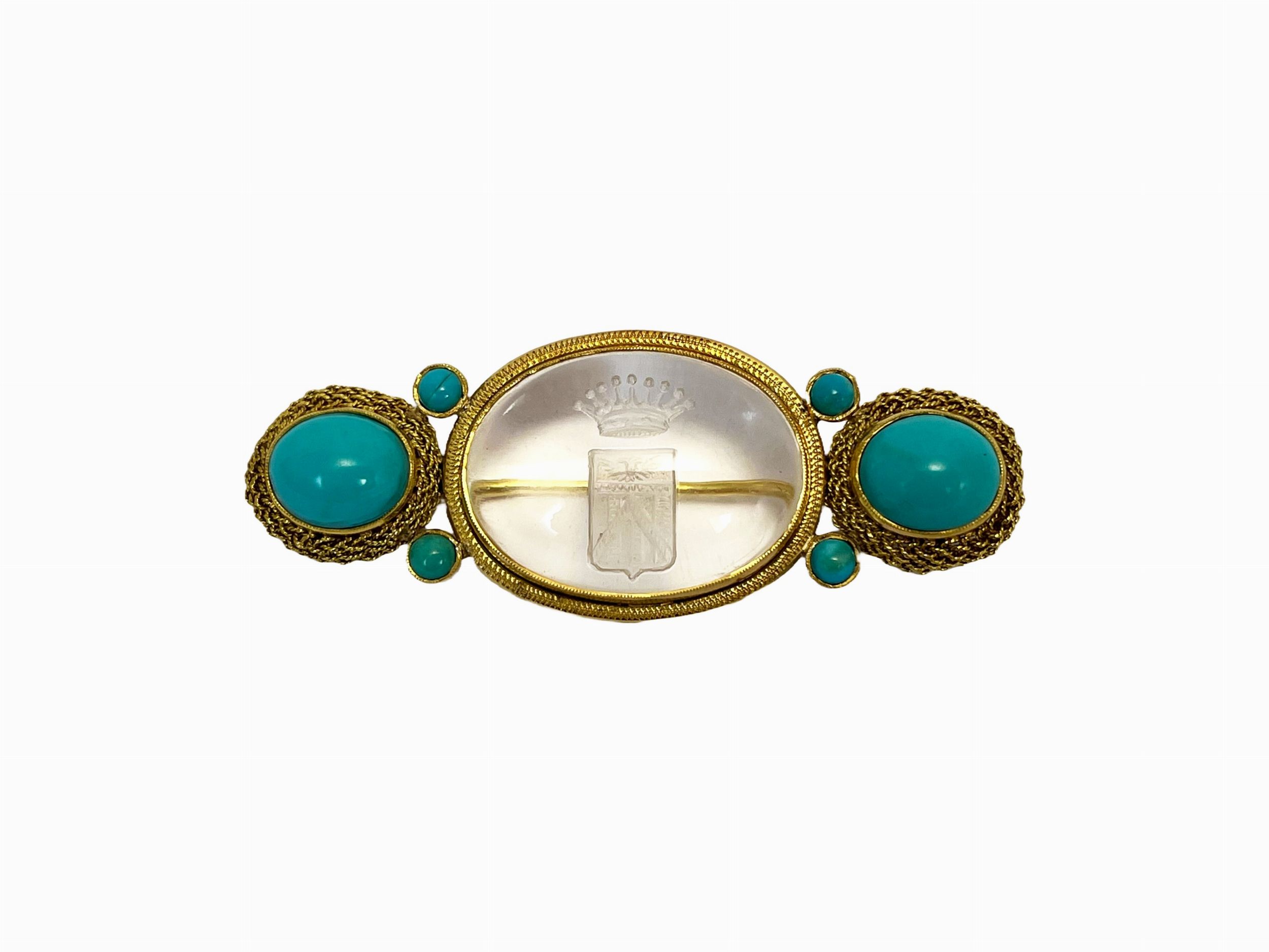 Spilla in oro giallo con turchesi e cristallo di Rocca inciso