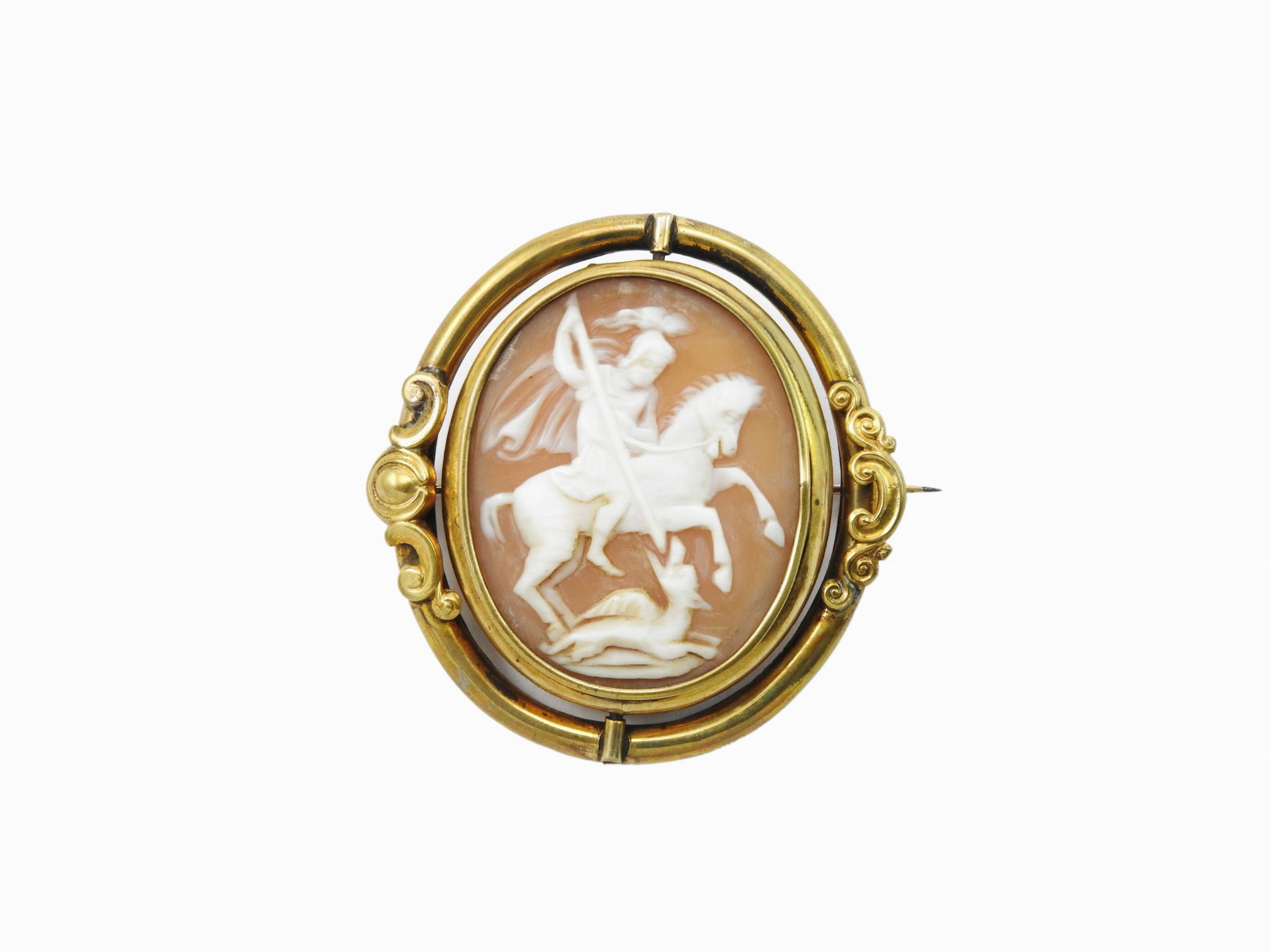 Spilla portaritratto in oro a basso titolo con cammeo in conchiglia
