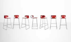 Policarbonato stampato con struttura e poggiapiedi in acciaio, 99 x 50,8 x 53,5 cm 1990s Set di 7 panche Maxima [..]