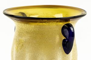 Vetro, 14 x 13,5 cm Metà del XX secolo Anfora di vetro vintage Vetro color ambra con manici blu e base in vetro [..]