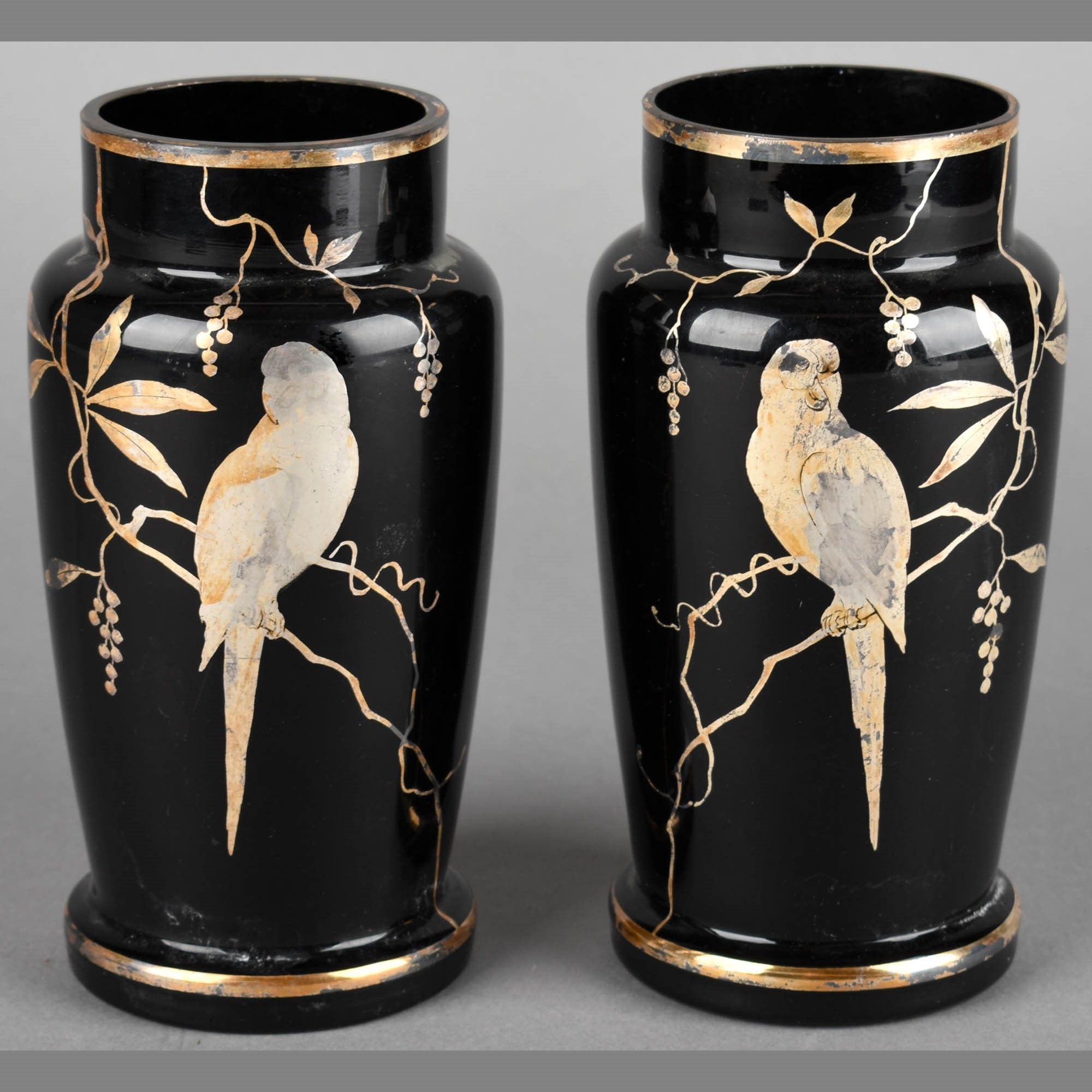 1920s/1930s Coppia di vasi Art Déco in vetro nero con supporto svasato ad alta parete cilindrica, collo leggermente rientrante, bordo decorato in oro.