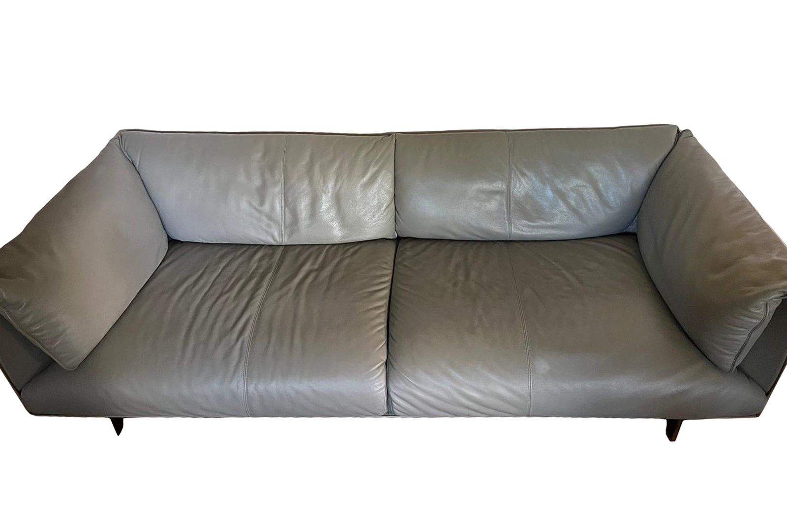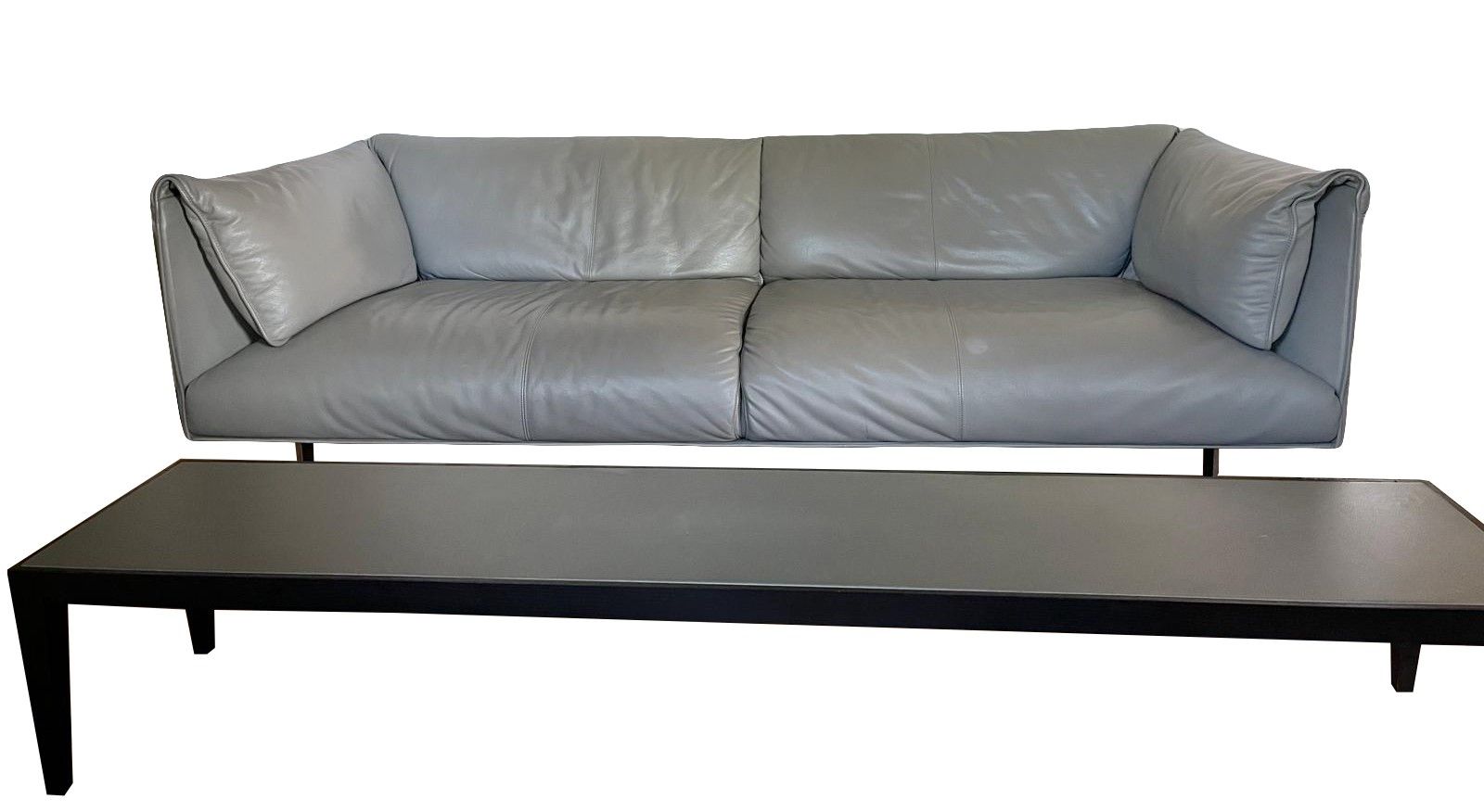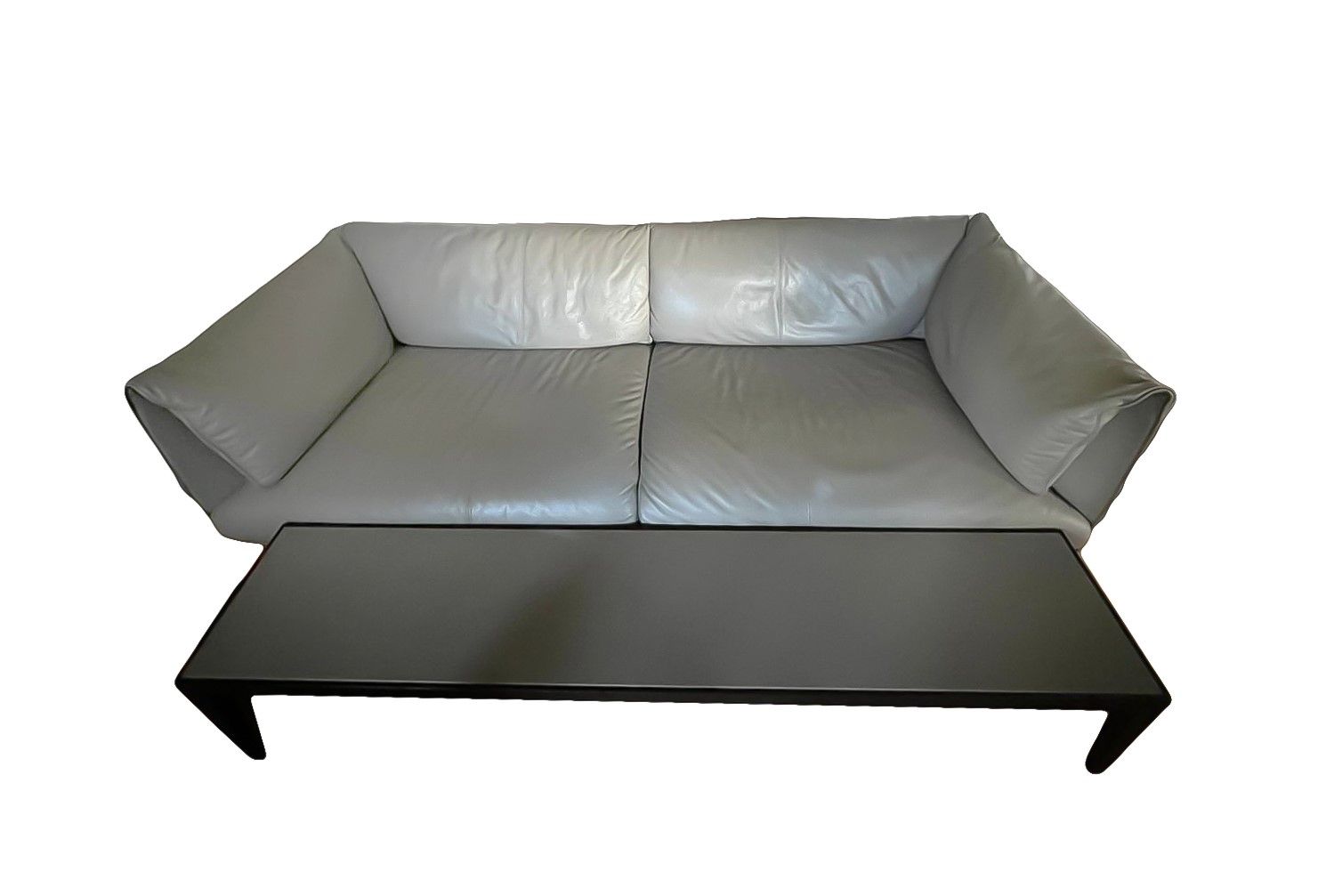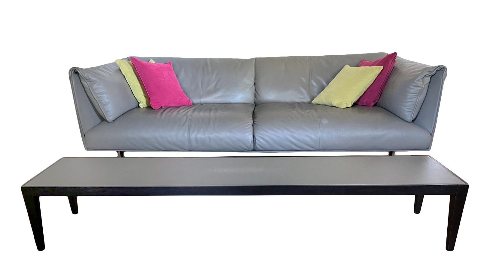 Divano: 200x90x H 68 cmTavolino: 185 x 35 cm 1980s Divano a tre posti e tavolino vintage John John Leather è un oggetto di design realizzato da Jean Marie Massaud per Poltrona Frau, anni Ottanta. Struttura in faggio massiccio con traversa centrale in ferro. Schienale e braccioli: con imbottitura in poliuretano espanso e ovatta di poliestere, sono in faggio e pioppo massiccio con pannelli in multistrato di pioppo e betulla. Cuscini imbottiti in morbida piuma d'oca e rivestiti sul retro in Pelle Frau® microforata. Piedi in alluminio. Il tavolo ha una struttura in legno e un piano in pelle. Ottime condizioni, tranne una macchia e un lievissimo scolorimento