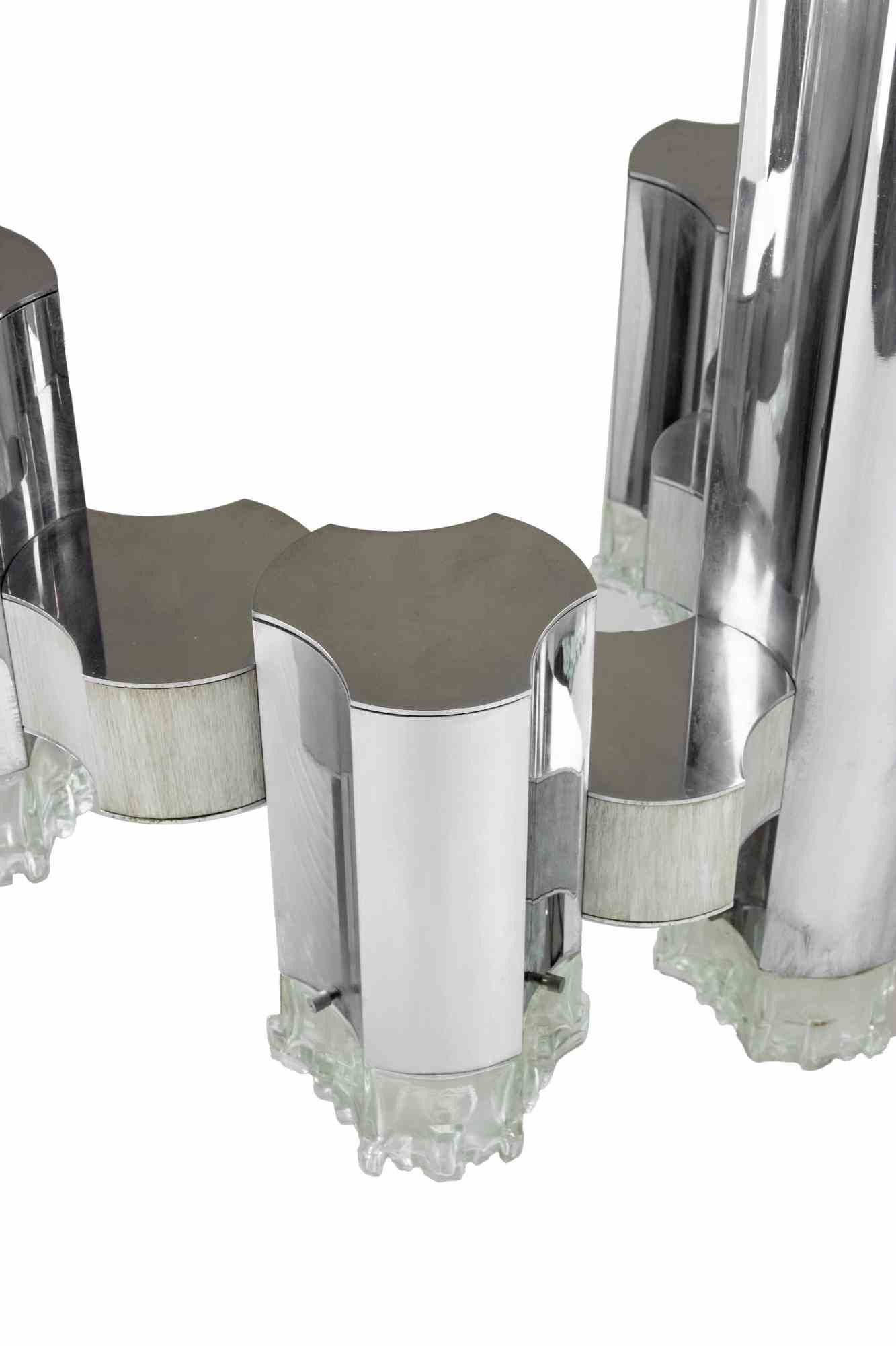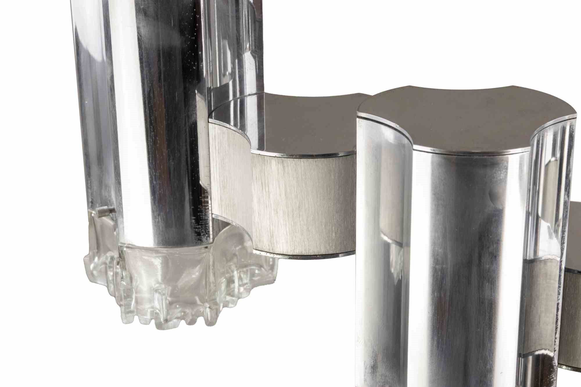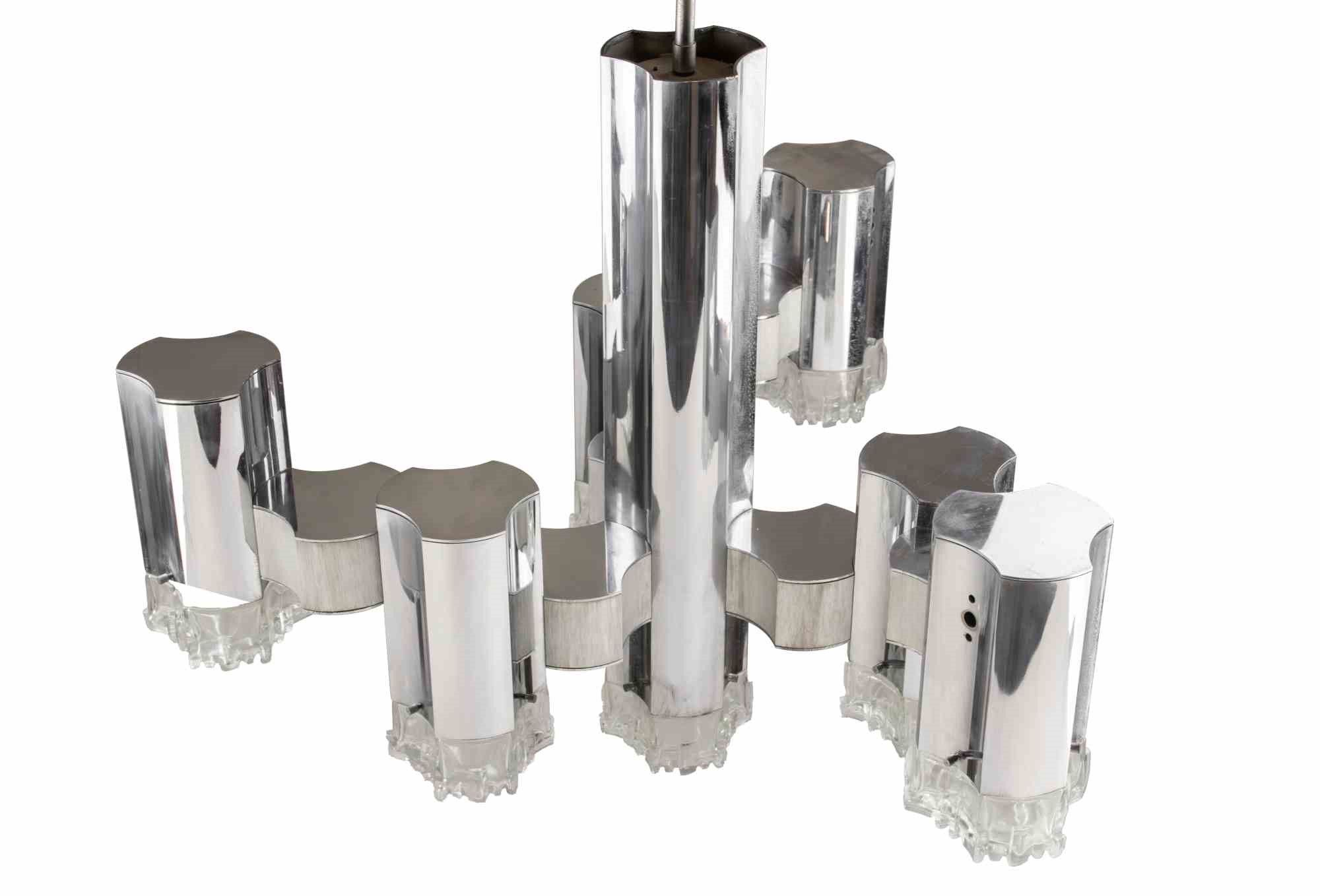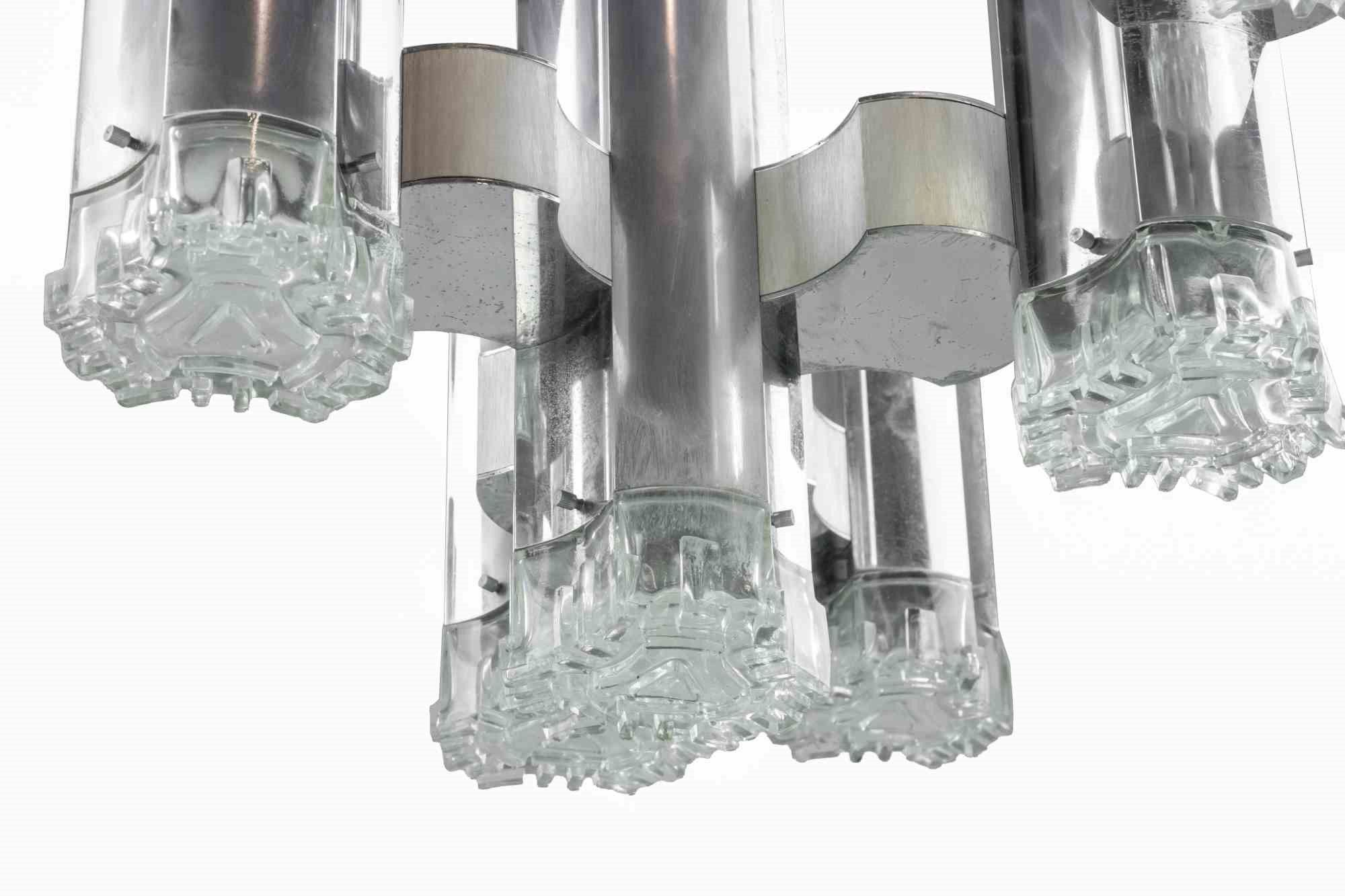 Lampadario “modernista” attribuito a Gaetano Sciolari e realizzato negli anni Settanta. Metallo, vetro, plastica. Good condition.