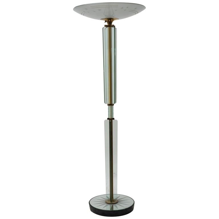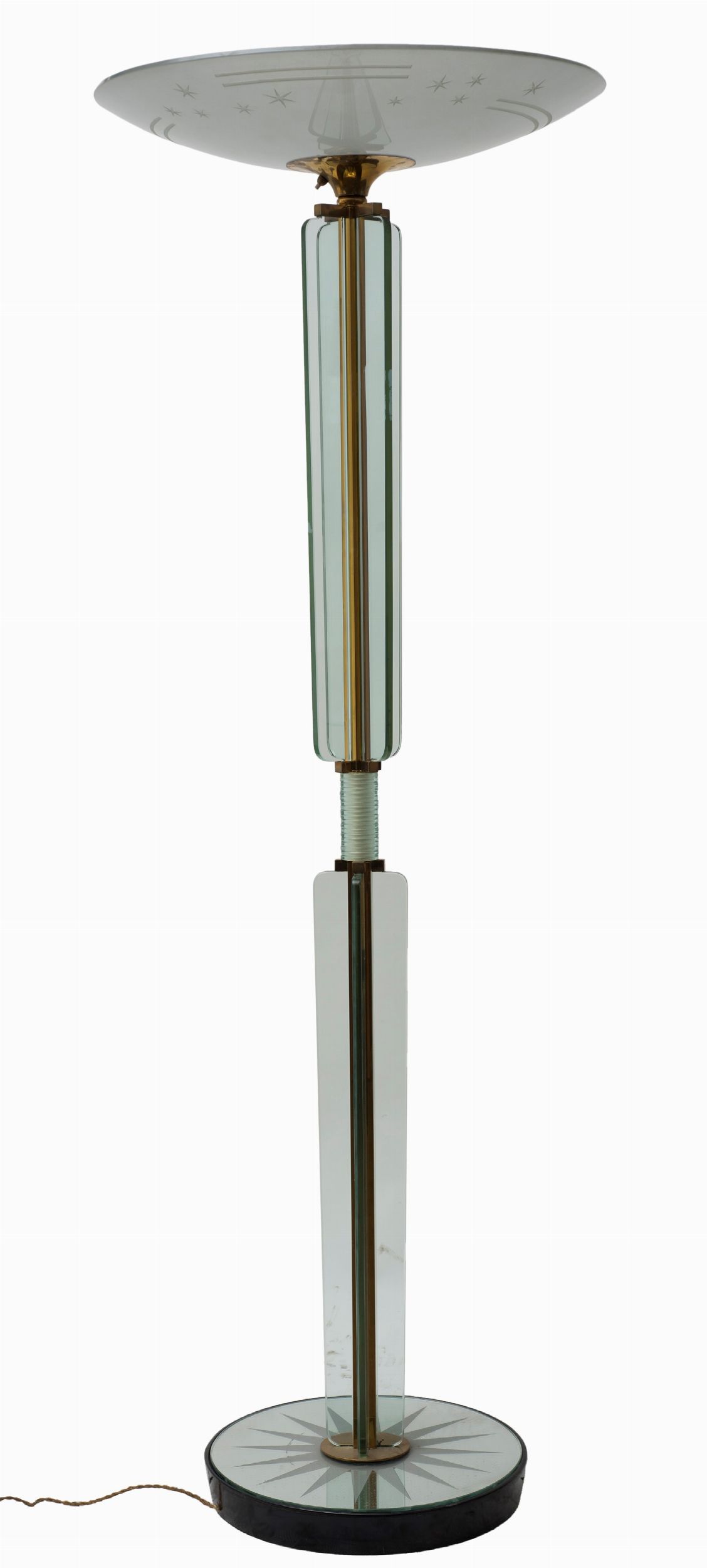 Lampada da terra in vetro con base in legno e struttura in ottone