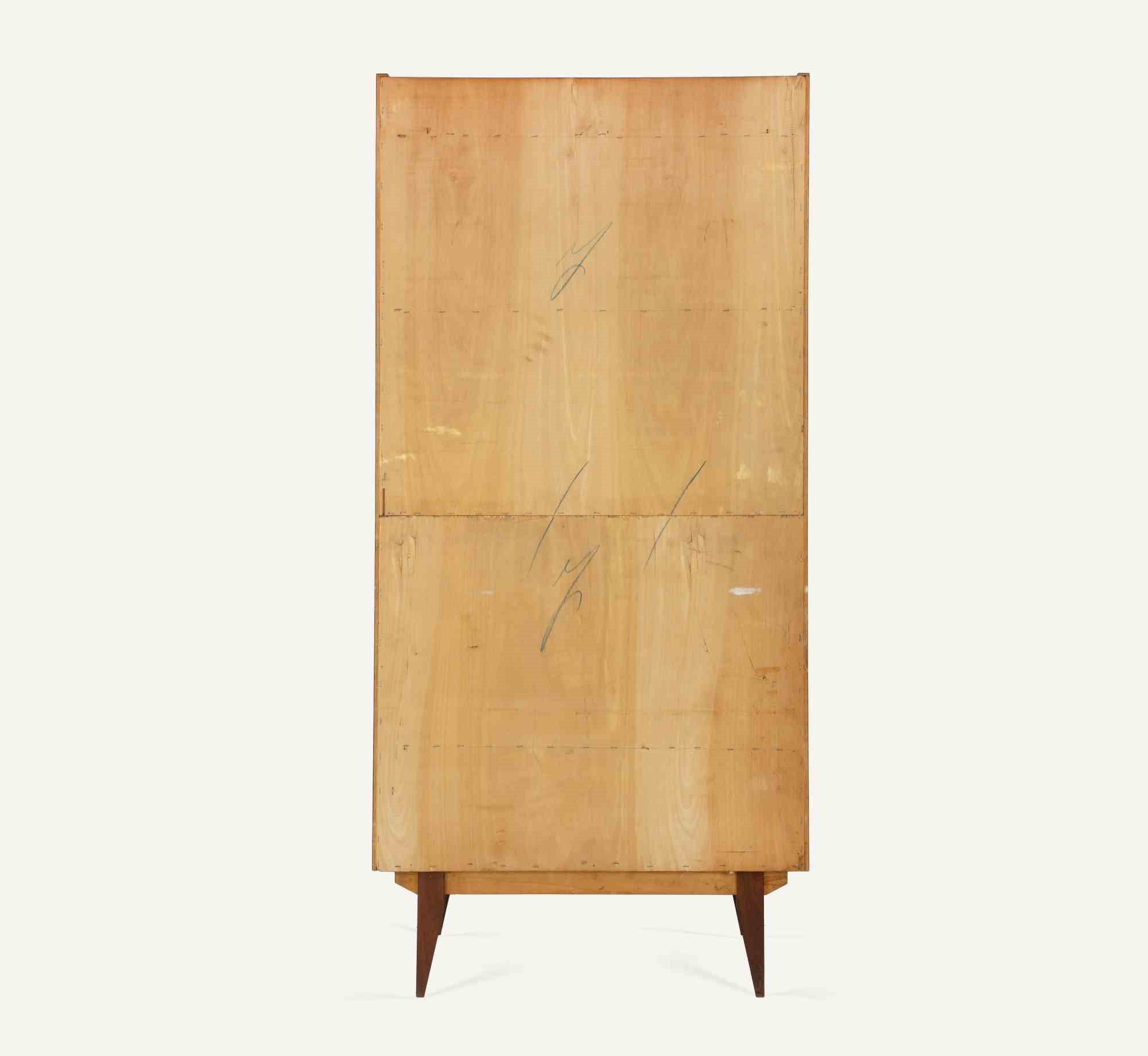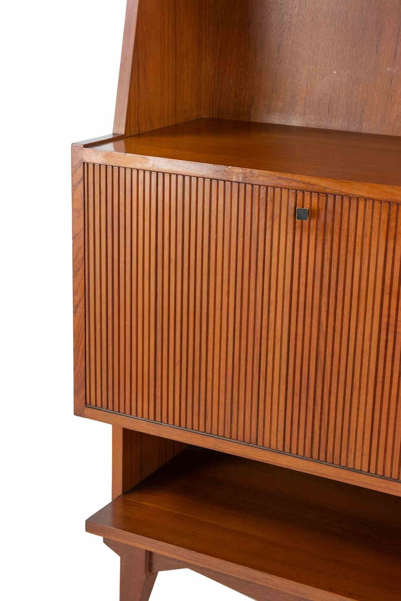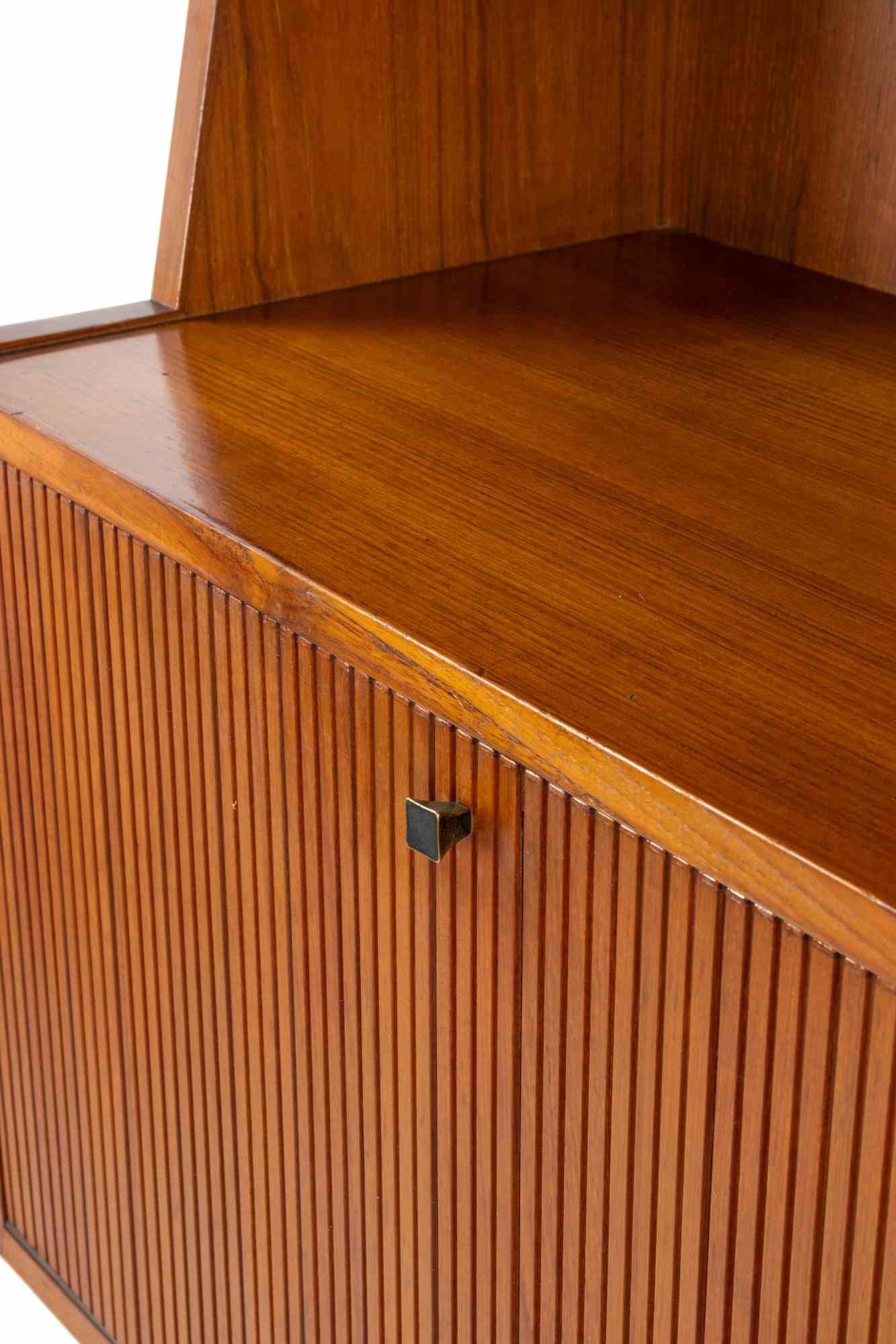 168 x 80 x 41 (cm) Libreria d'epoca con mobile a ribalta e vani a giorno attribuita a Dassi Mobili Moderni e realizzata negli anni Cinquanta. Legno e ottone. Ottimo stato di conservazione.