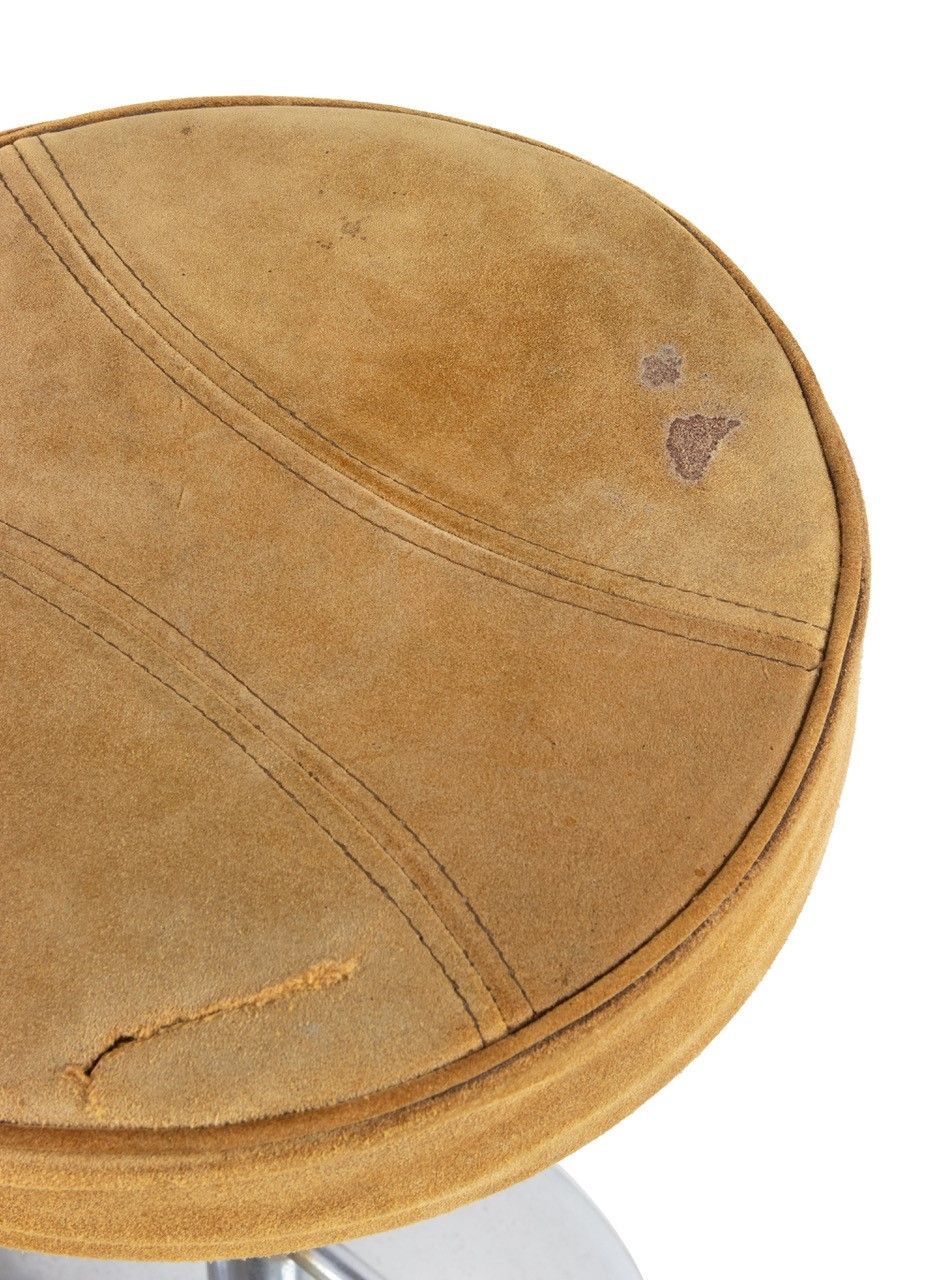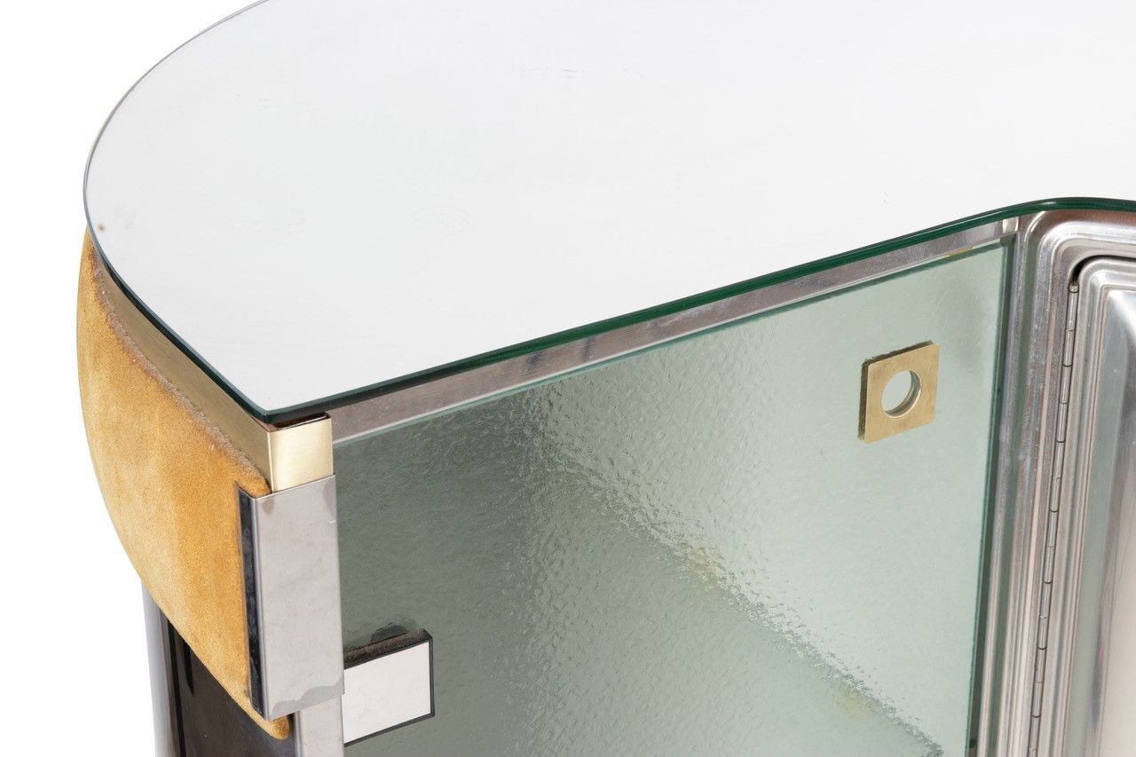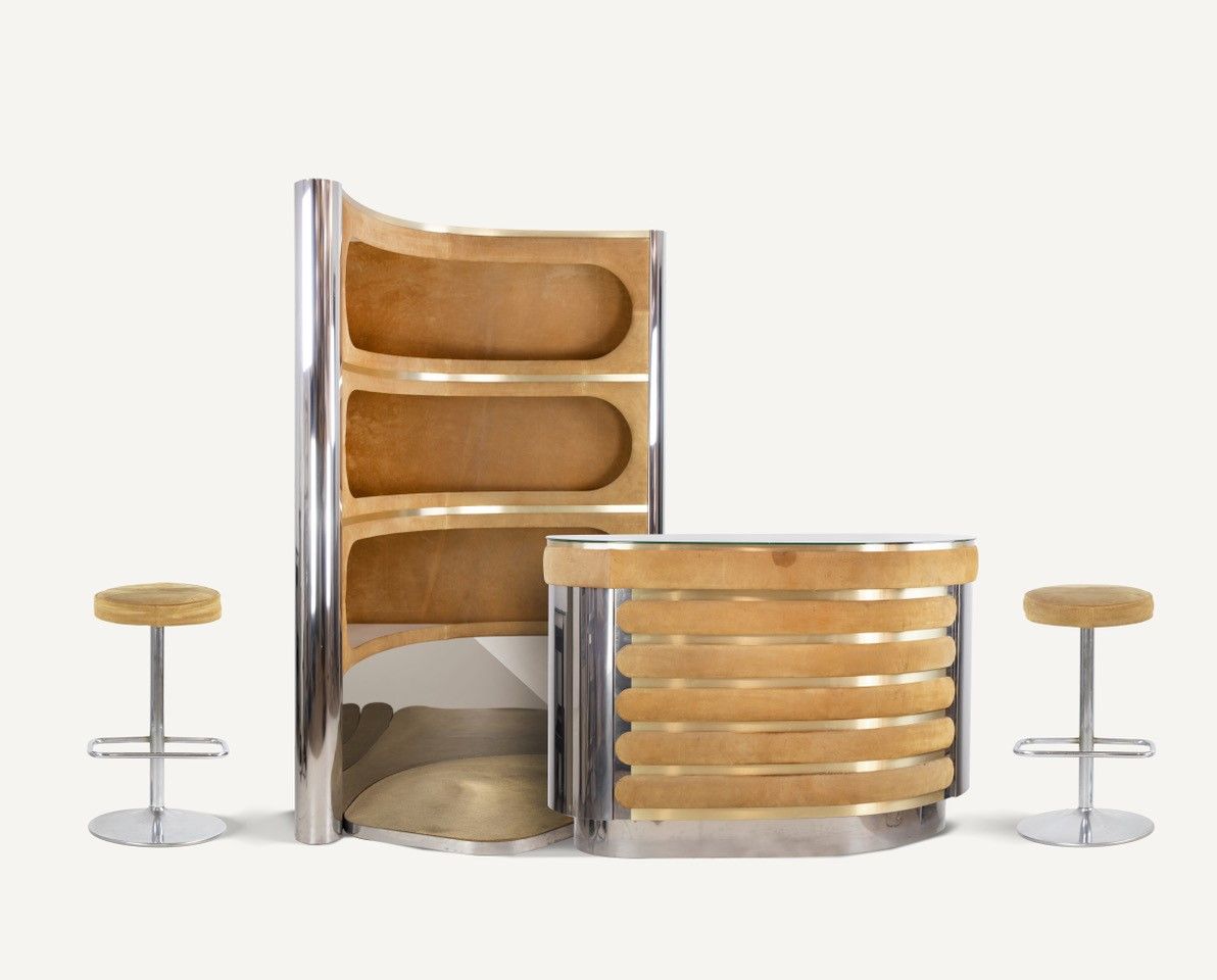 1970 Raro e bellissimo dry bar vintage disegnato da Willy Rizzo negli anni Settanta. Camoscio senape, barre in metallo cromato. Set completamente originale, completo della sua pedana originale e di uno specchio personalizzato da posizionare sul lato sinistro dello schienale. Il set comprende anche: mensole illuminate, un bancone con piano in vetro specchiato, fianchi cromati, un pannello frontale in pelle scamosciata e due sgabelli con sedute originali in pelle scamosciata. Dimensioni del ripiano: H. 75,98 in. / 193 cm; lati 59,06 x 47,24 x 37,01 pollici / 150 x 120 x 94 cm. Dimensioni del piano di lavoro: H 35,04 x 53,15 20,87 in. / 89 x 135 x 53 cm. Dimensioni dello schienale: H 34,65 x 50,39 x 31,50 in. / H 88cm x 128cm x 80cm. Condizioni molto buone, ad eccezione di una macchia nella striscia superiore del camoscio del piano d'appoggio, di una scheggiatura molto lieve nel vetro del piano d'appoggio e di uno strappo nel camoscio di uno degli sgabelli.