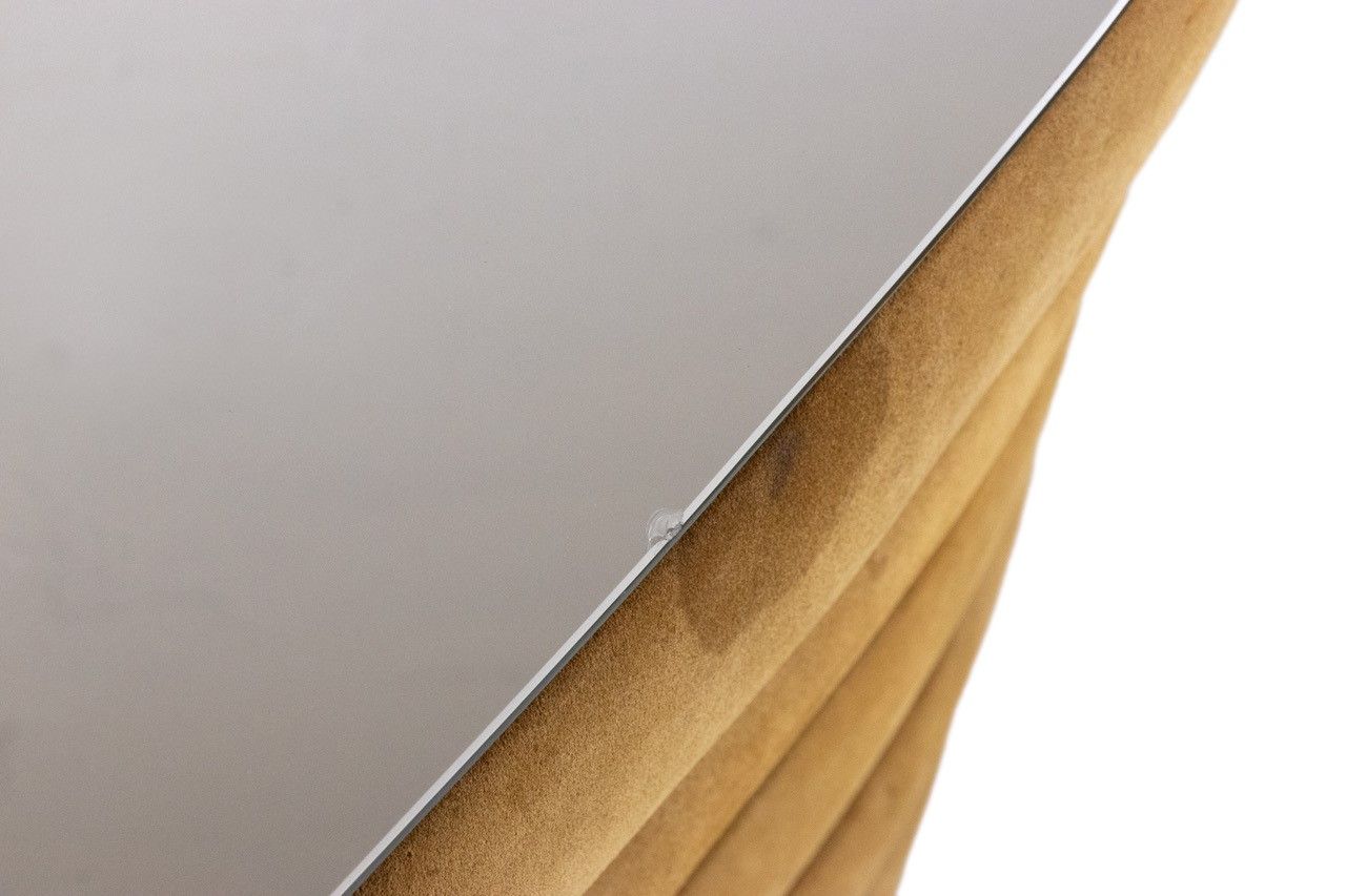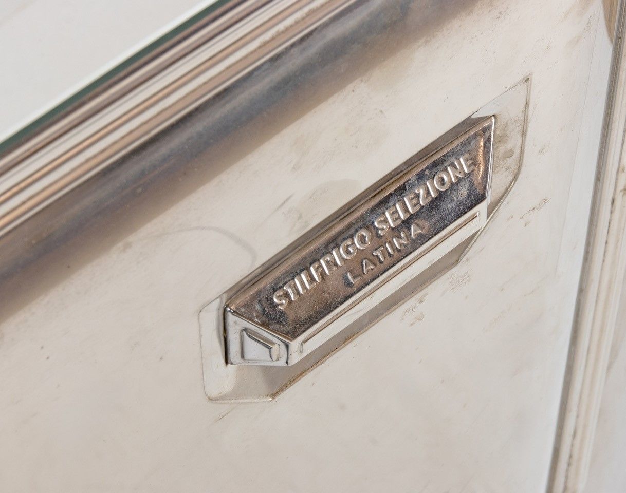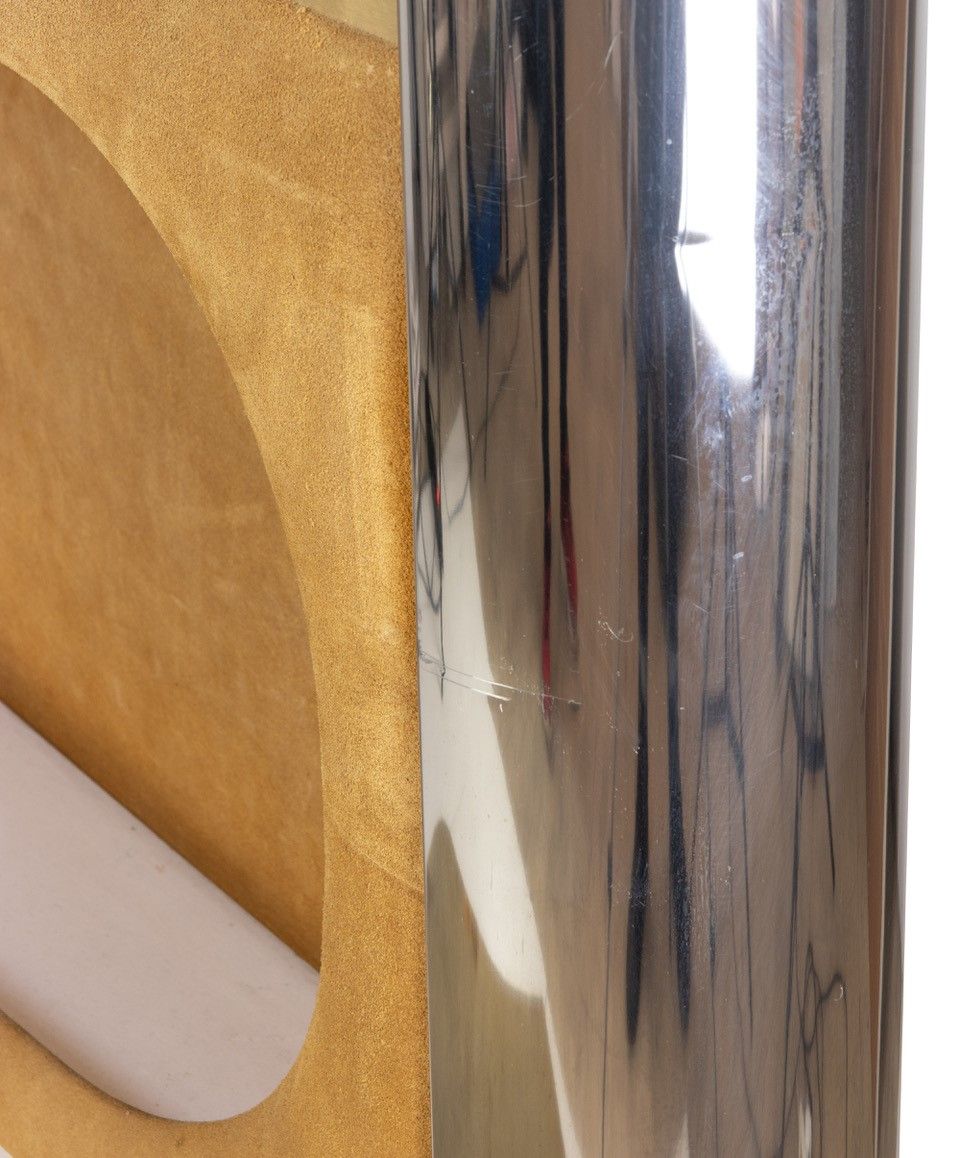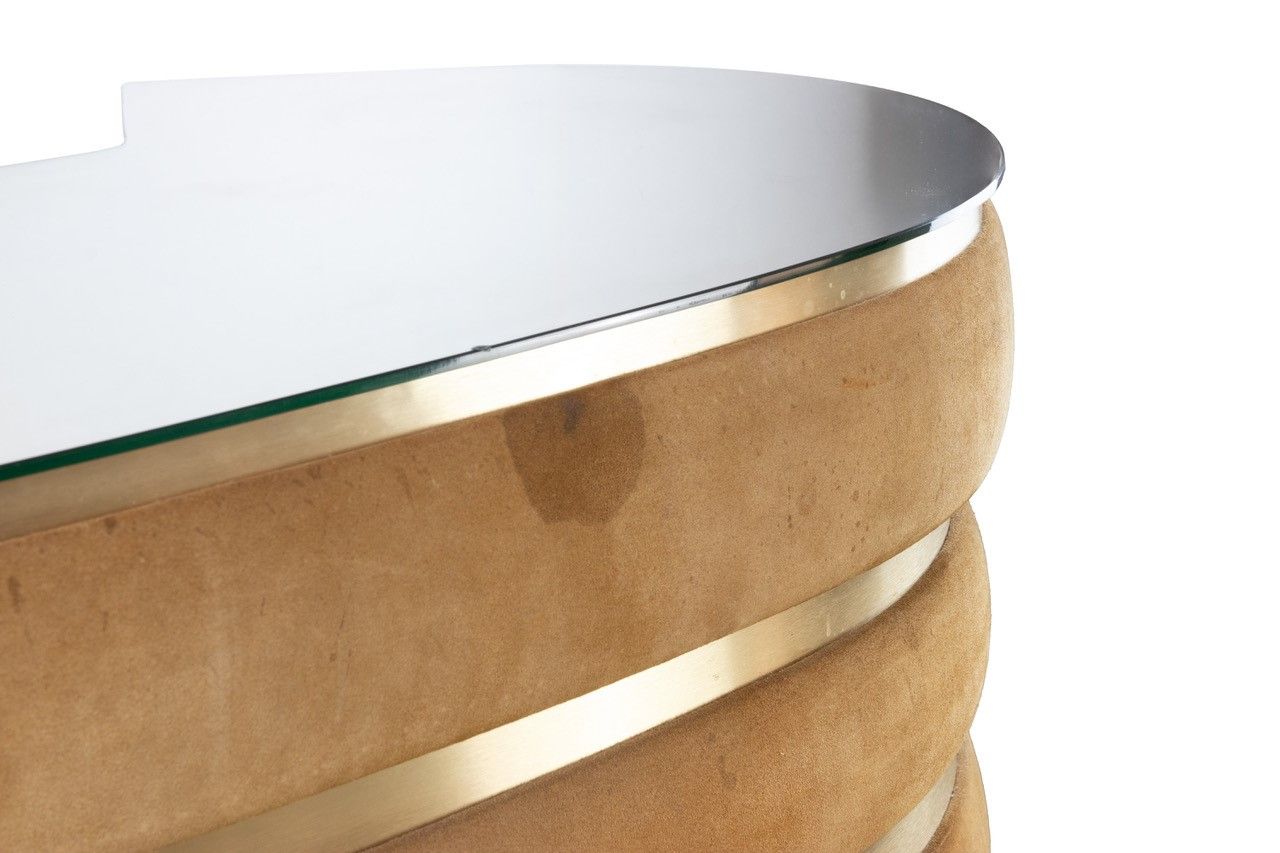 1970 Raro e bellissimo dry bar vintage disegnato da Willy Rizzo negli anni Settanta. Camoscio senape, barre in metallo cromato. Set completamente originale, completo della sua pedana originale e di uno specchio personalizzato da posizionare sul lato sinistro dello schienale. Il set comprende anche: mensole illuminate, un bancone con piano in vetro specchiato, fianchi cromati, un pannello frontale in pelle scamosciata e due sgabelli con sedute originali in pelle scamosciata. Dimensioni del ripiano: H. 75,98 in. / 193 cm; lati 59,06 x 47,24 x 37,01 pollici / 150 x 120 x 94 cm. Dimensioni del piano di lavoro: H 35,04 x 53,15 20,87 in. / 89 x 135 x 53 cm. Dimensioni dello schienale: H 34,65 x 50,39 x 31,50 in. / H 88cm x 128cm x 80cm. Condizioni molto buone, ad eccezione di una macchia nella striscia superiore del camoscio del piano d'appoggio, di una scheggiatura molto lieve nel vetro del piano d'appoggio e di uno strappo nel camoscio di uno degli sgabelli.