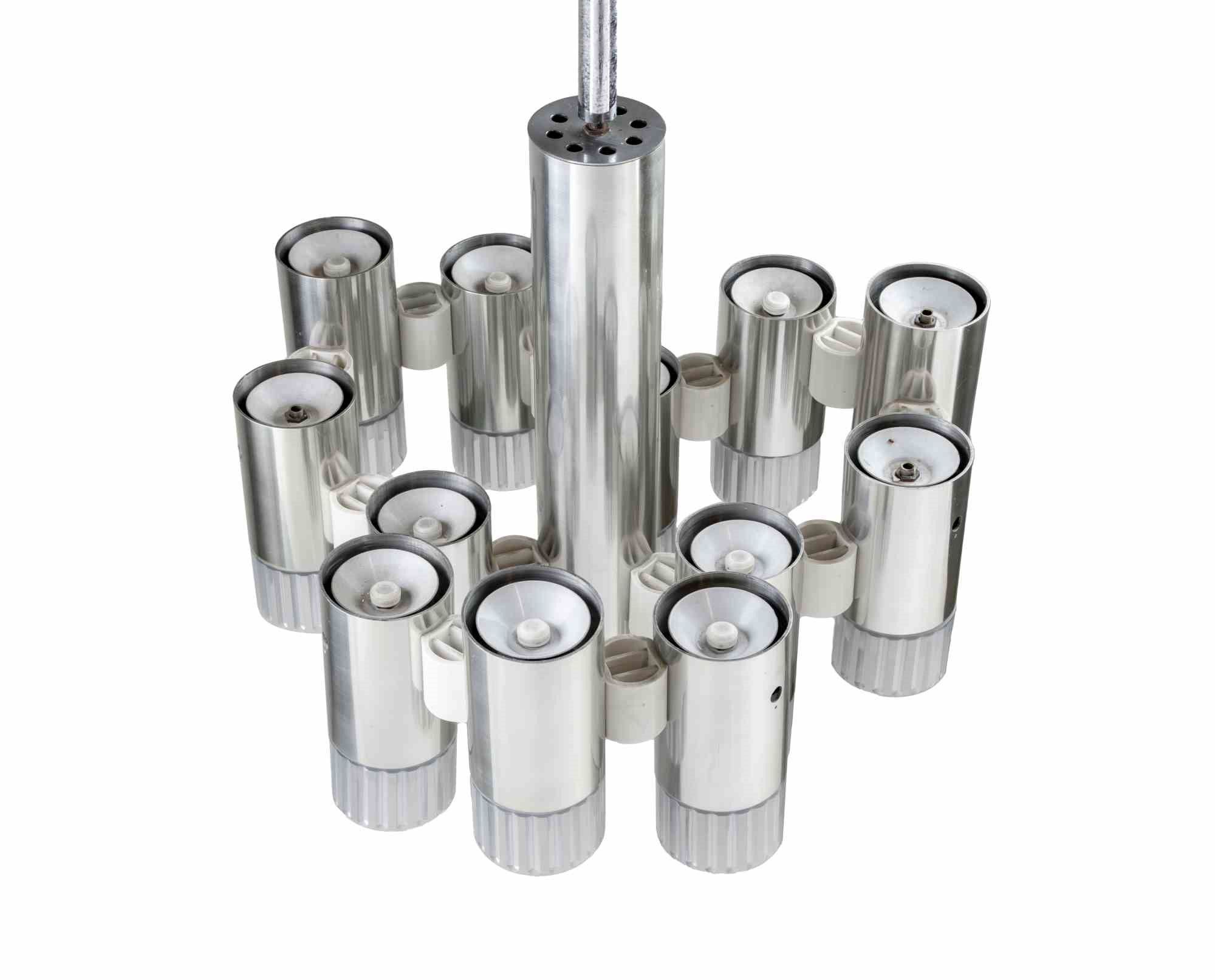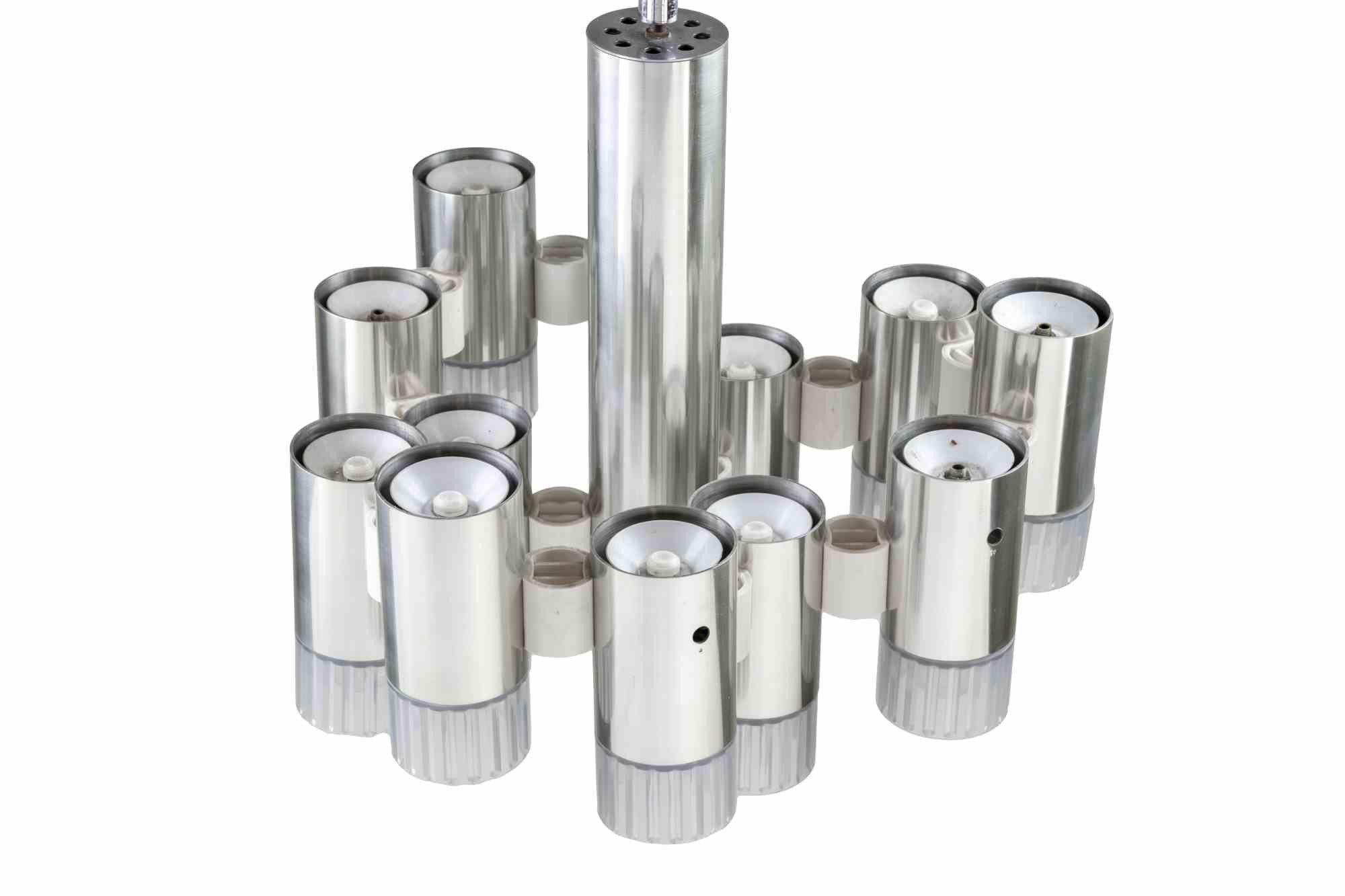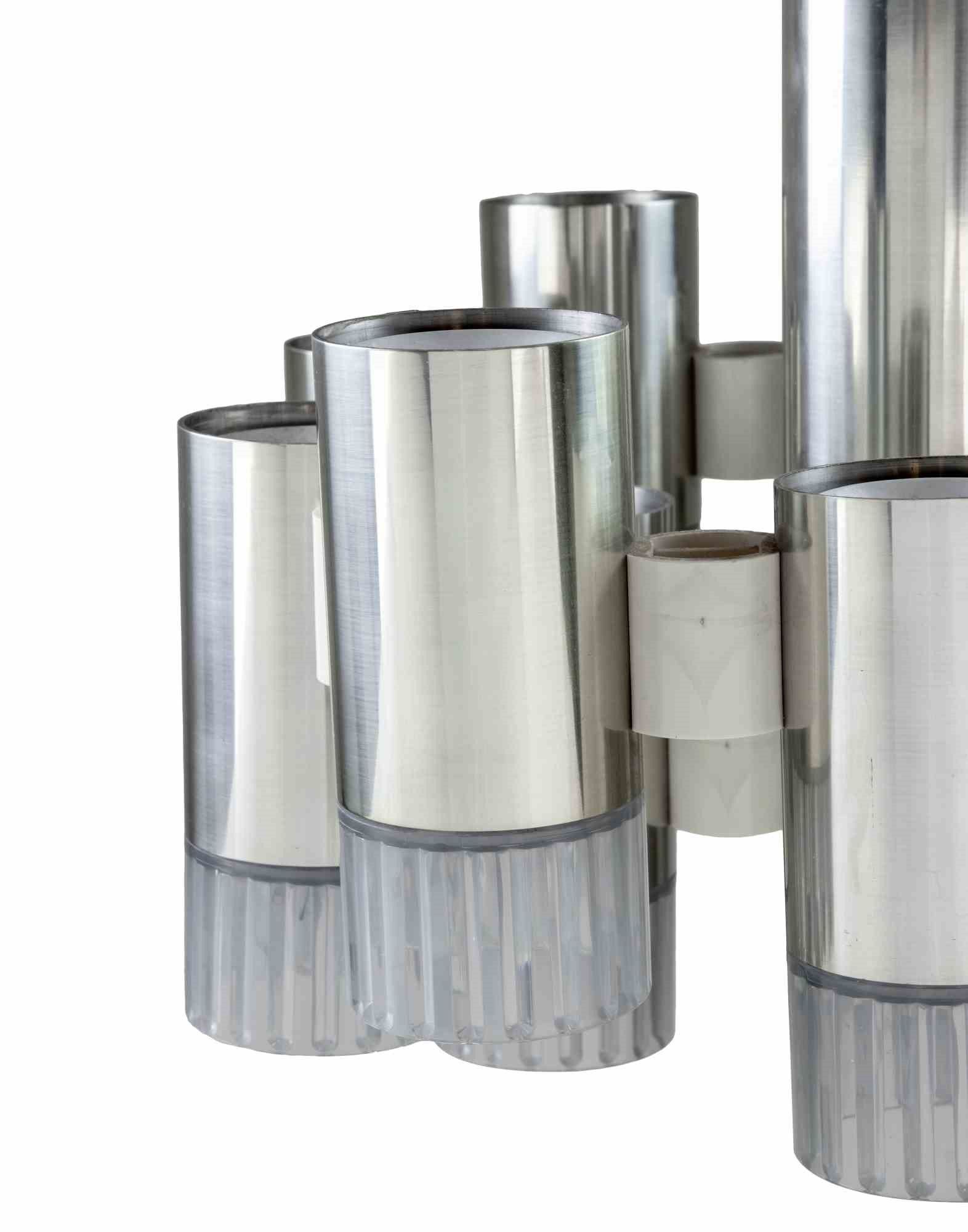 Lampadario “modernista” attribuito a Gaetano Sciolari. Metallo, vetro e plastica. Ottime condizioni.