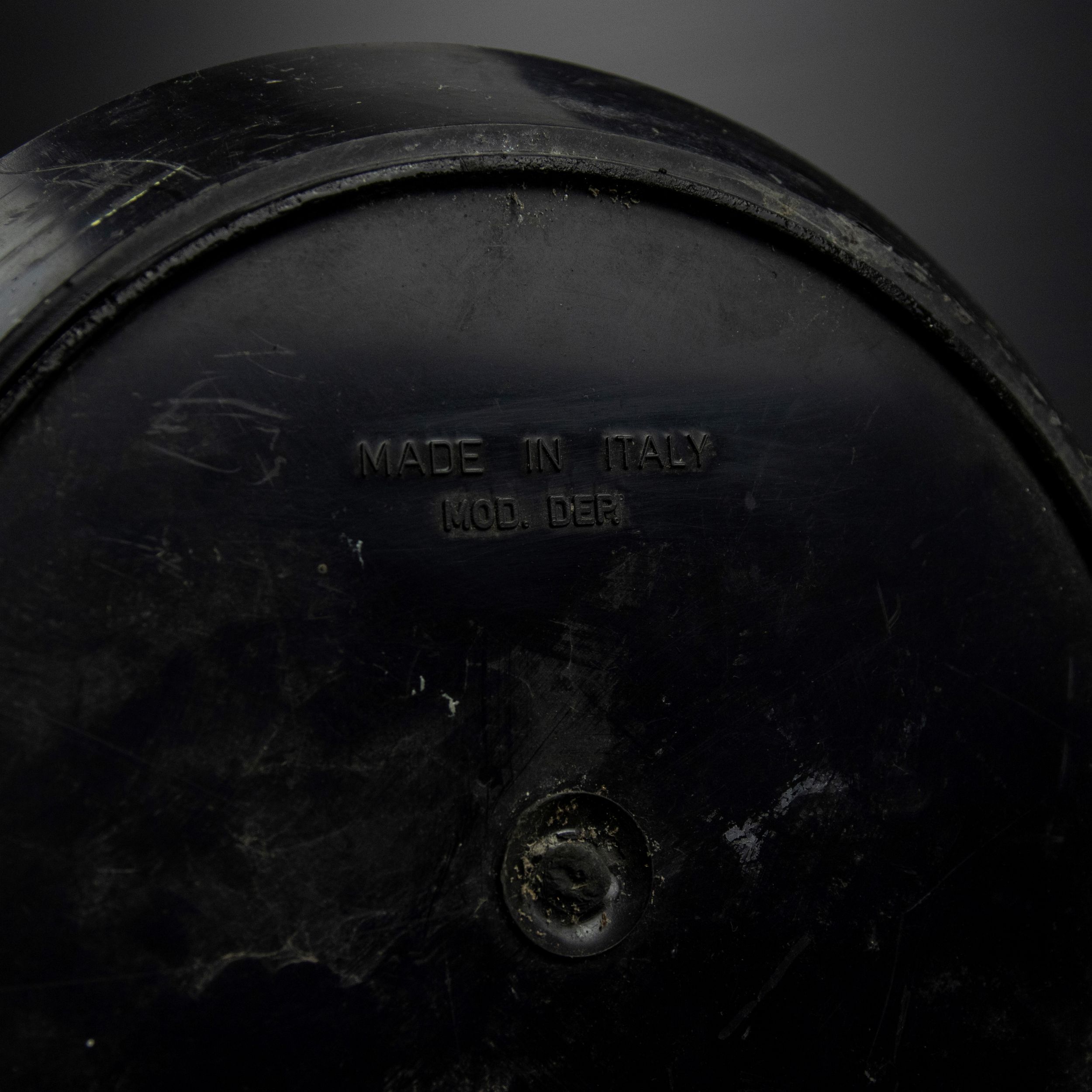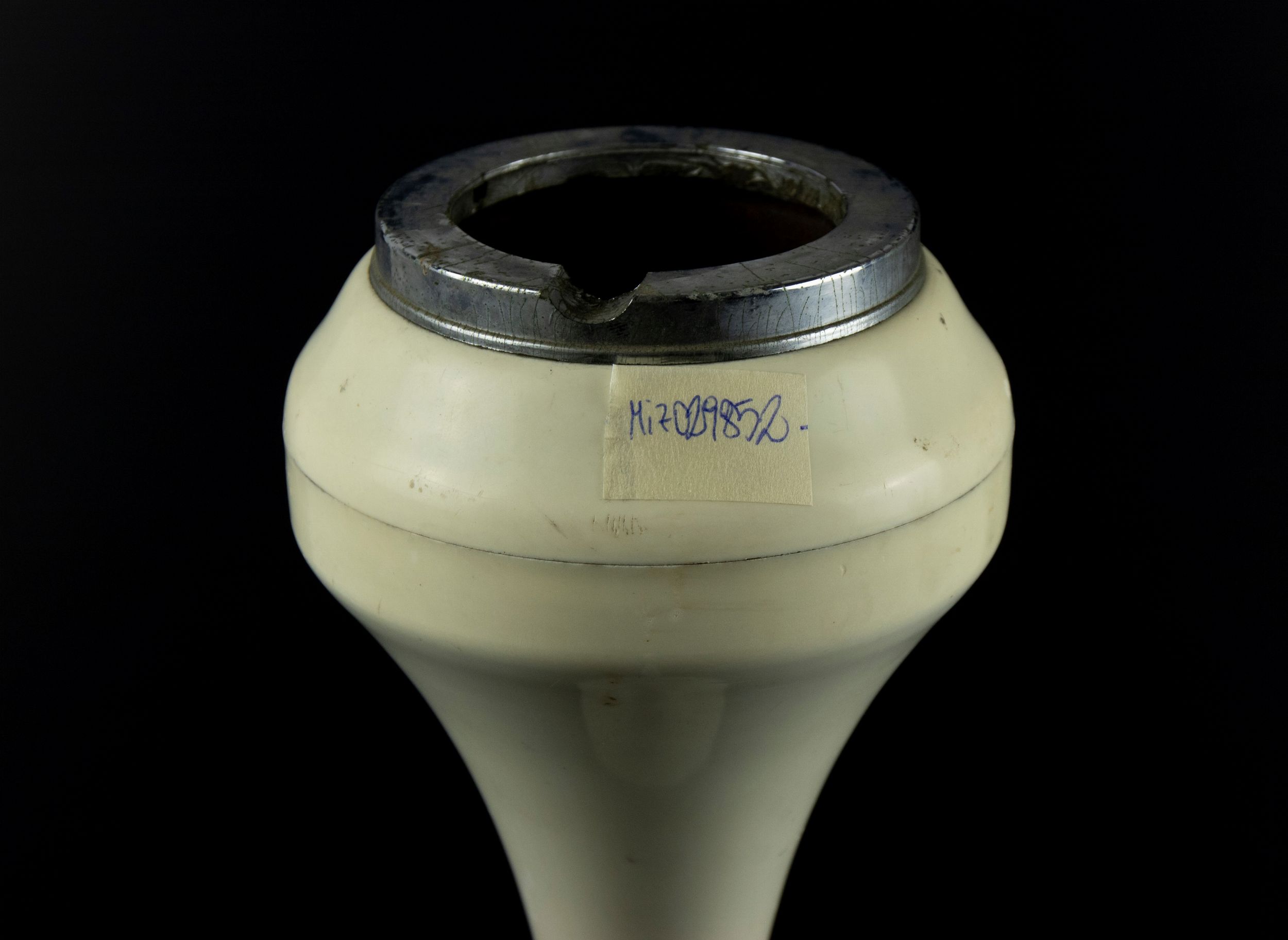 Interamente realizzato in resina chiara; la parte superiore del posacenere è in metallo.