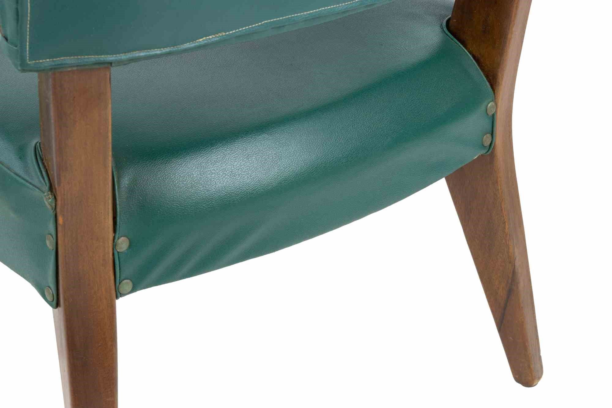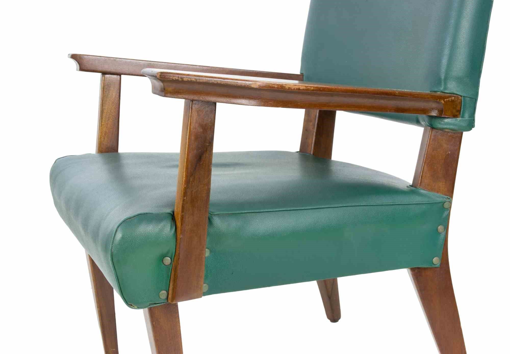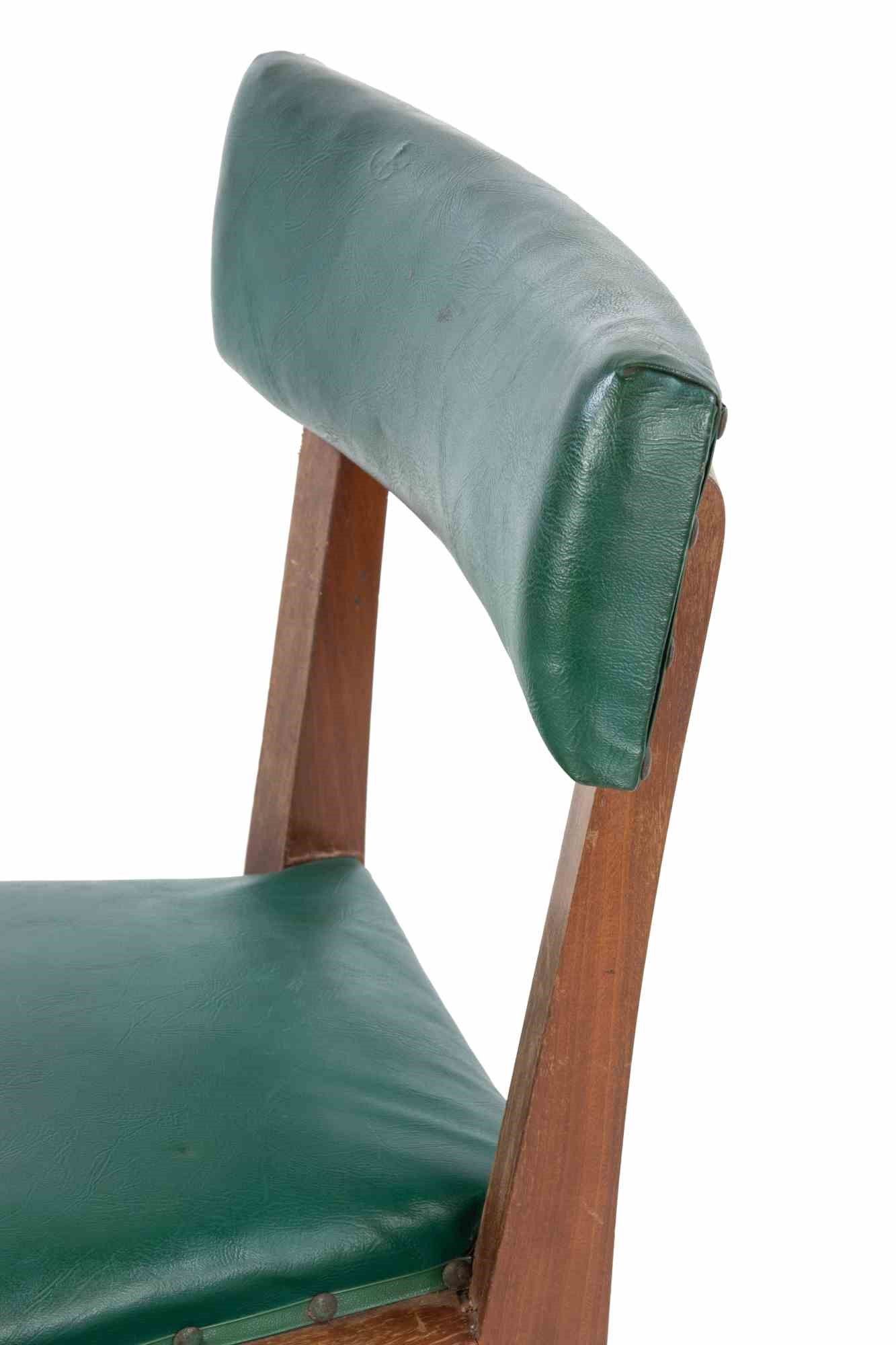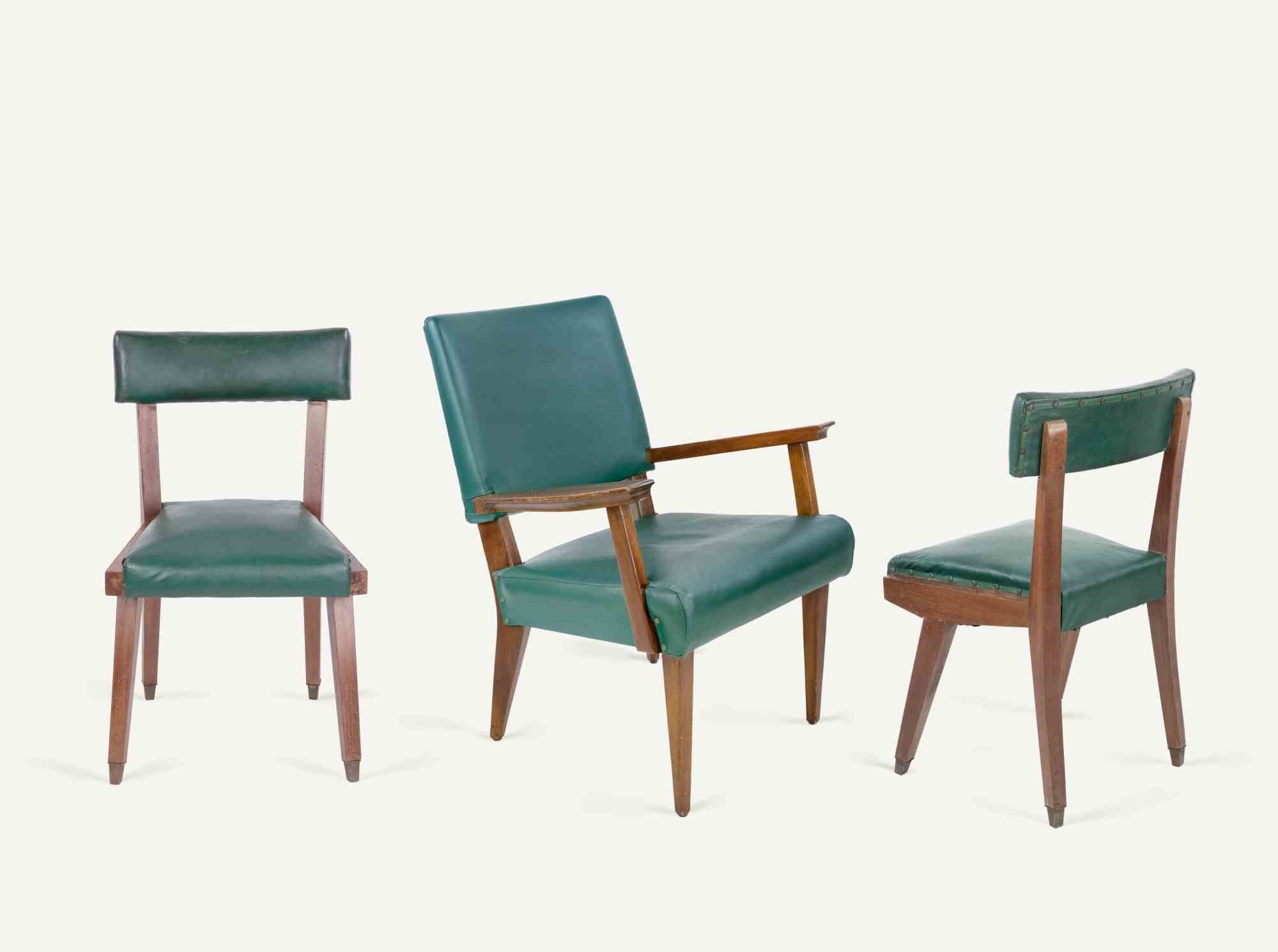 Set vintage di 1 poltrona e 2 sedie in legno e pelle vinilica imbottita. Alcuni segni d'uso ma nel complesso buone condizioni. Dimensions armchair: 83x65x44 cm. Dimensions chairs: 79.5x46x45 cm.