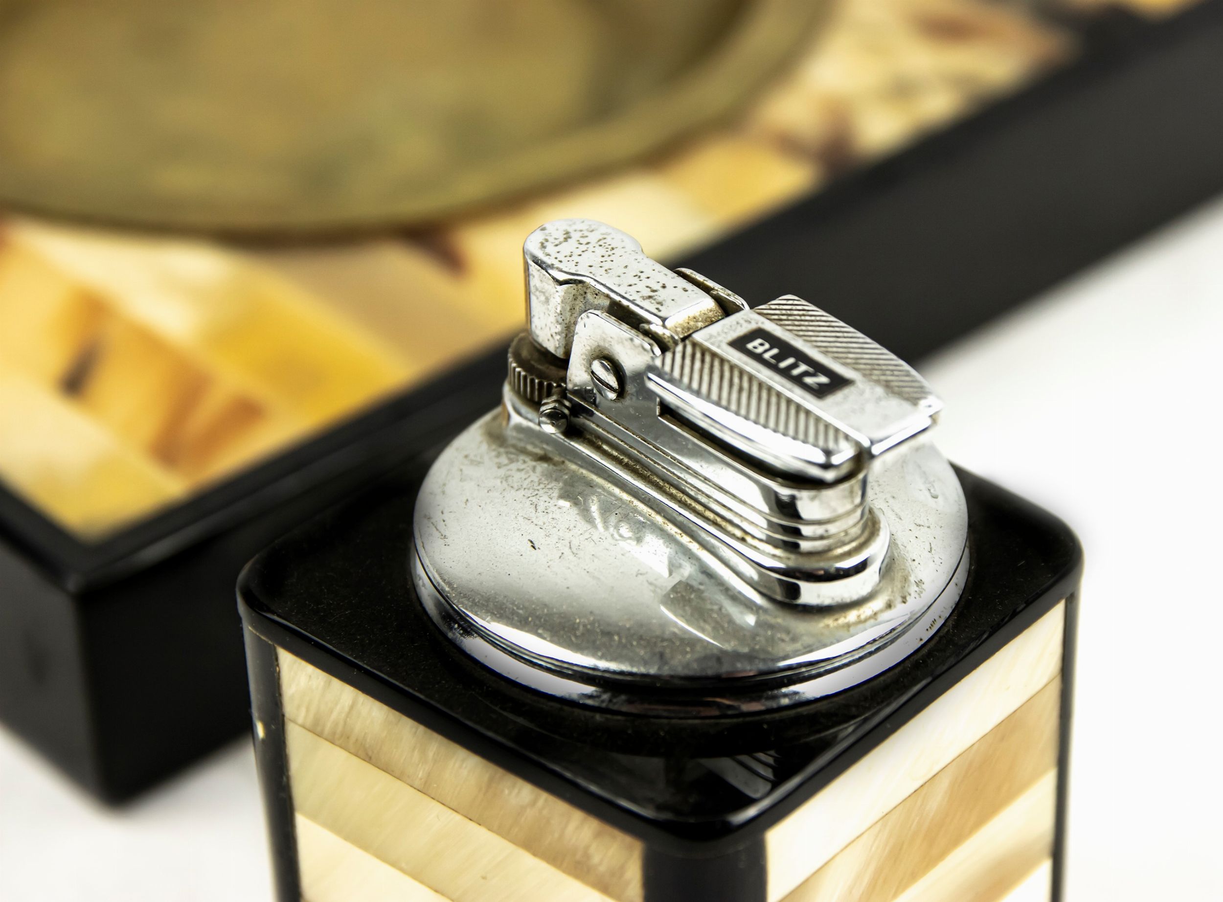Posacenere e accendino in ottone e metallo, con la superficie che riproduce un effetto madreperla