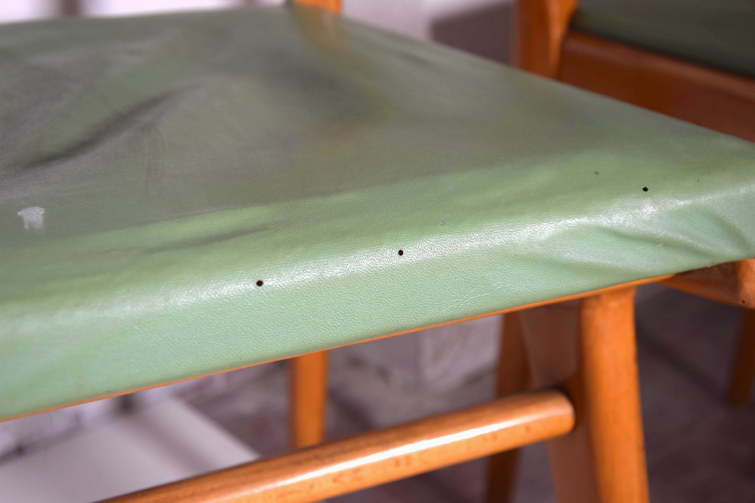 Set di sei sedie verdi e un mobile di design della metà del secolo scorso.