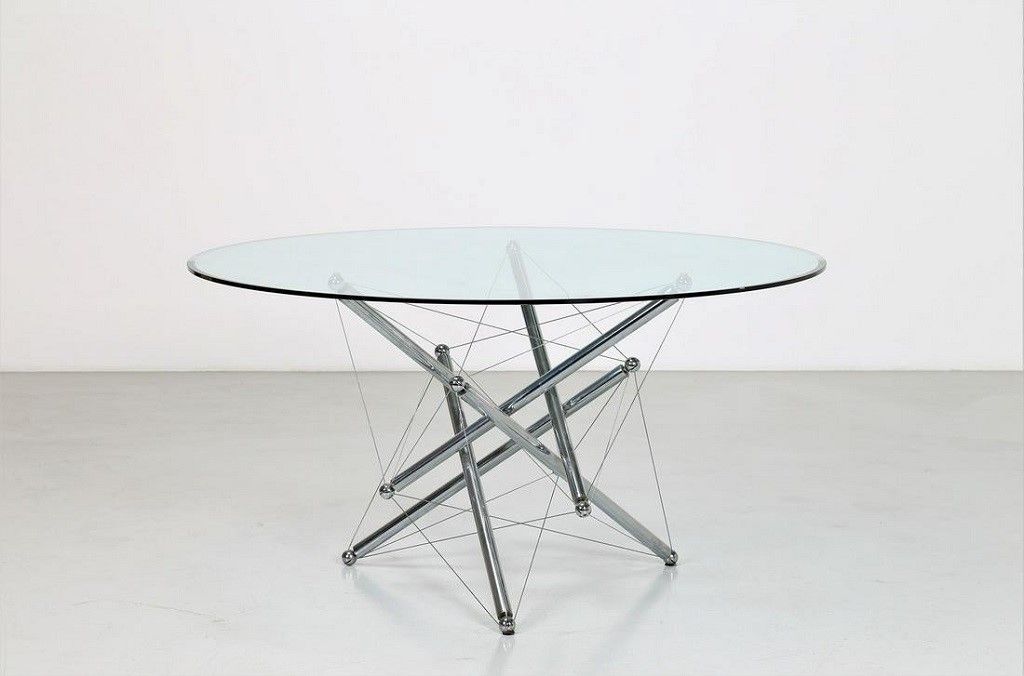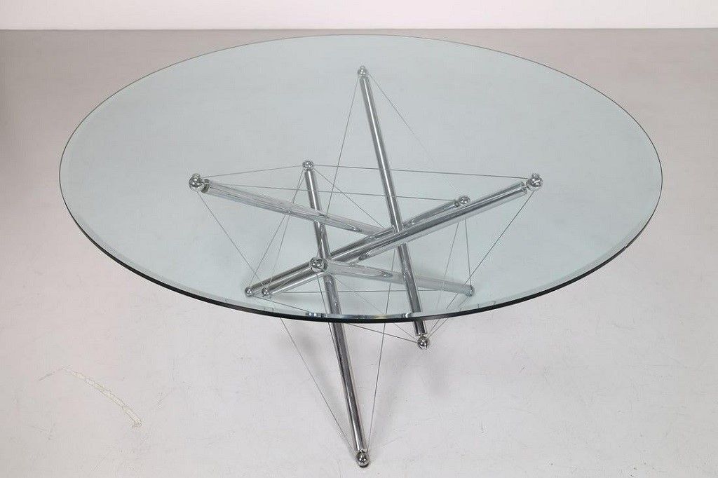 Modello 713 Tavolo realizzato in metallo cromato e cristallo.