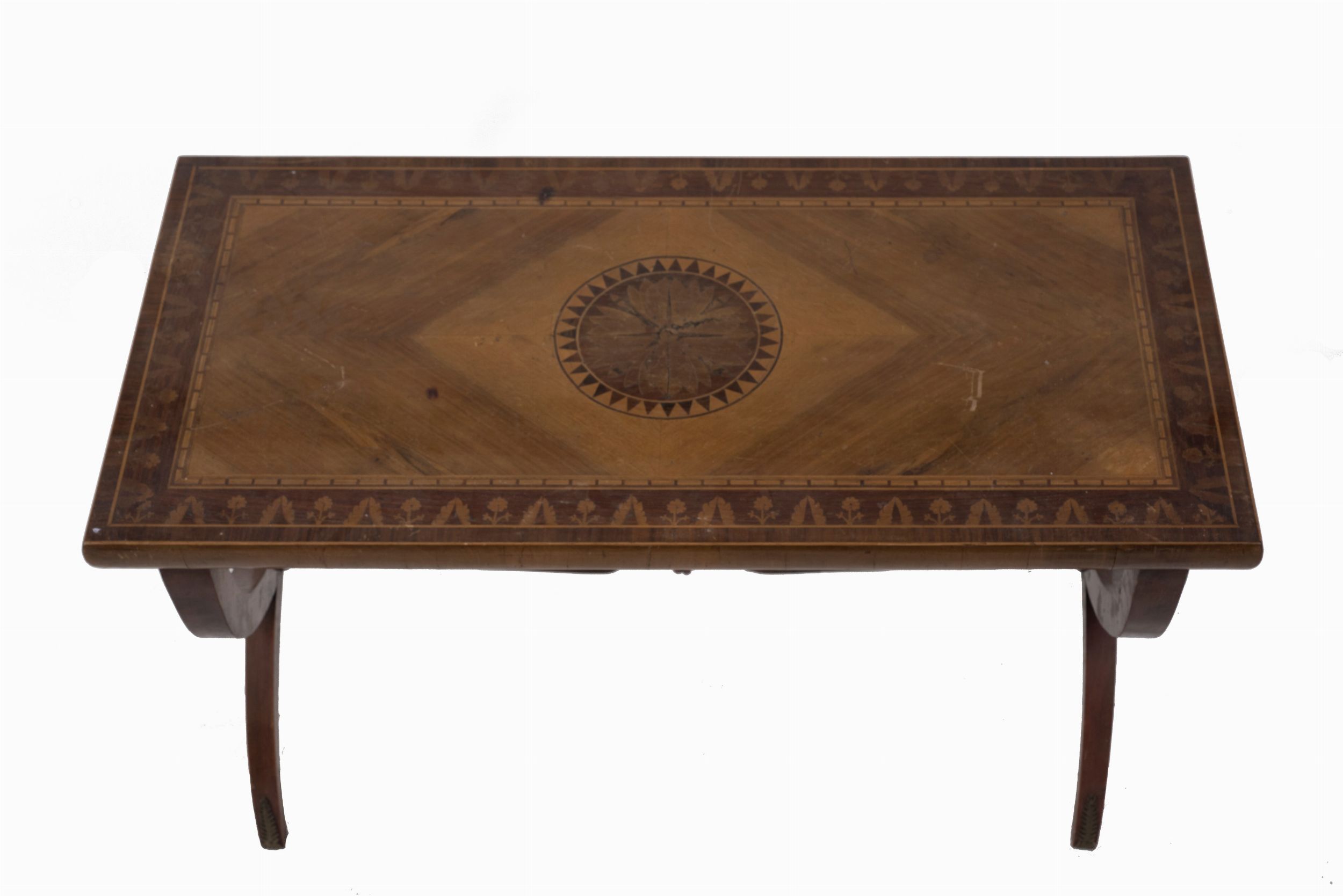 Legno di noce con piano intarsiato in acero ed ebano., 48 x 90 x 46 cm Primi anni del XX secolo Tavolino vintage Manifattura italiana Elegante tavolino realizzato in stile Restoration. Legno di noce con piano intarsiato in acero ed ebano. Gambe a gondola. Buone condizioni