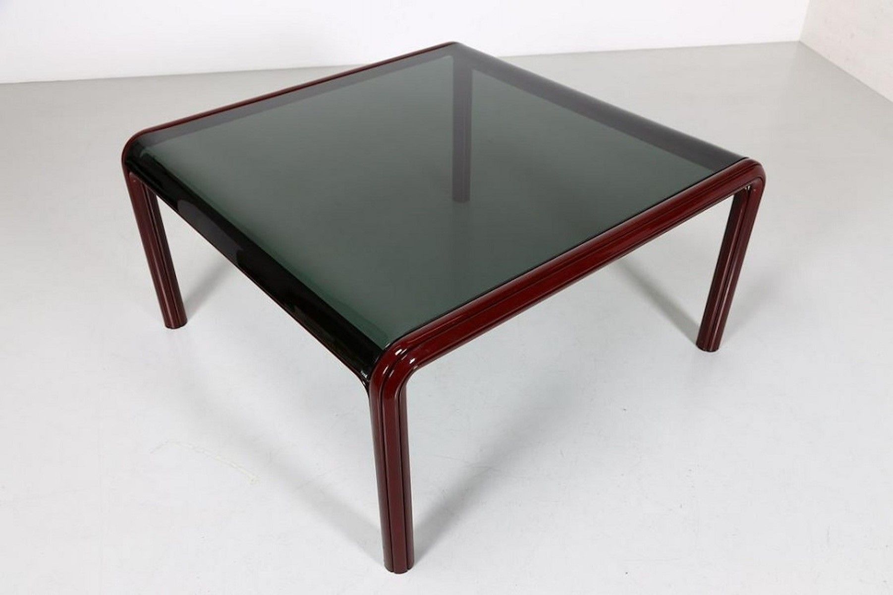 Tavolo con piano in vetro curvato. Ăˆ presente l'etichetta del marchio.