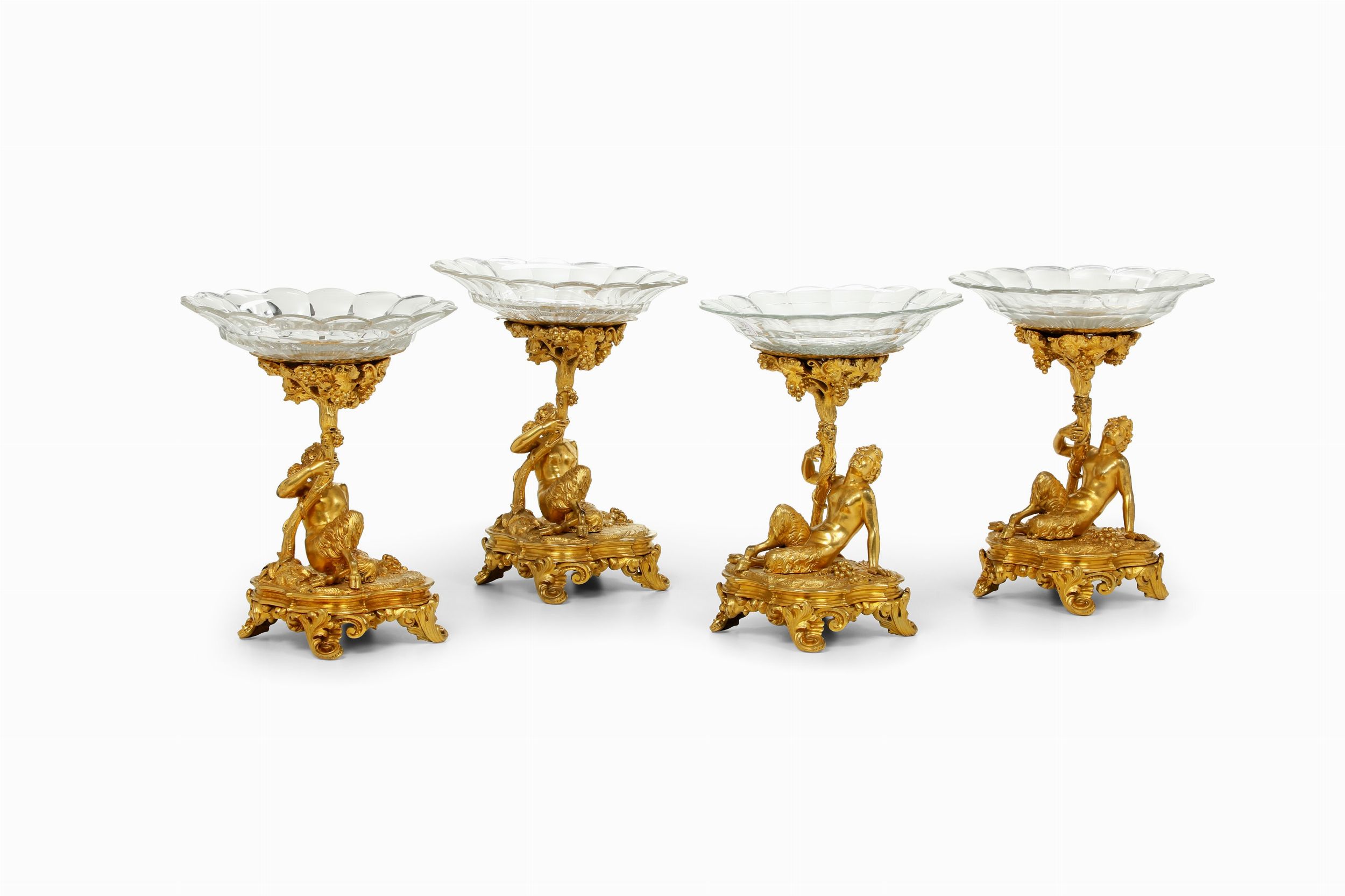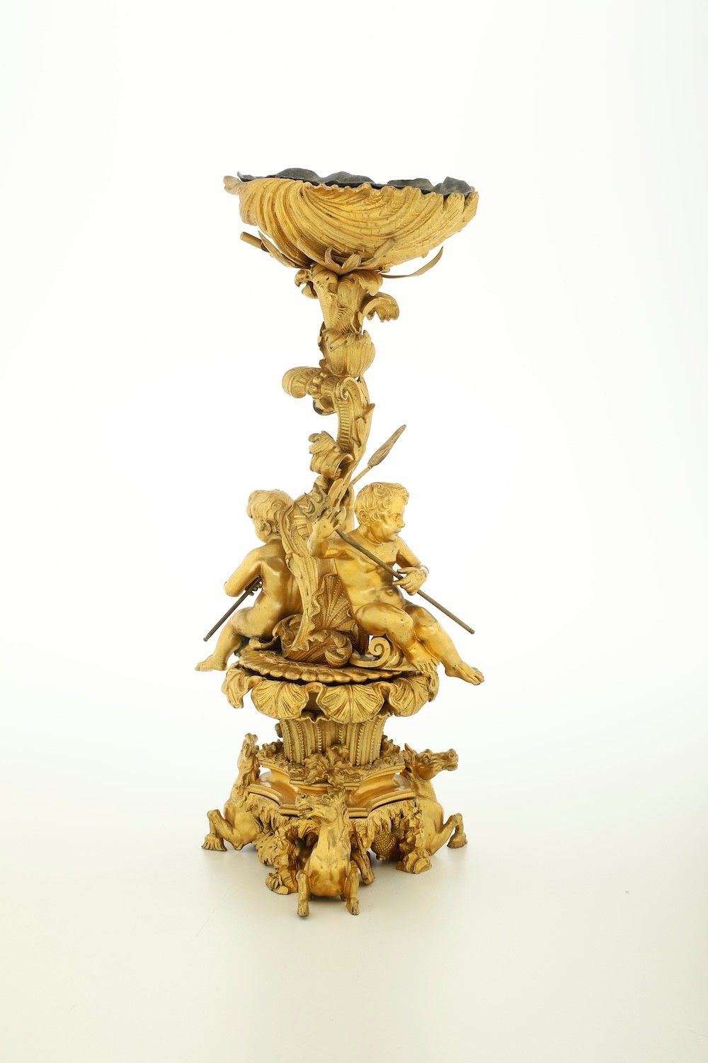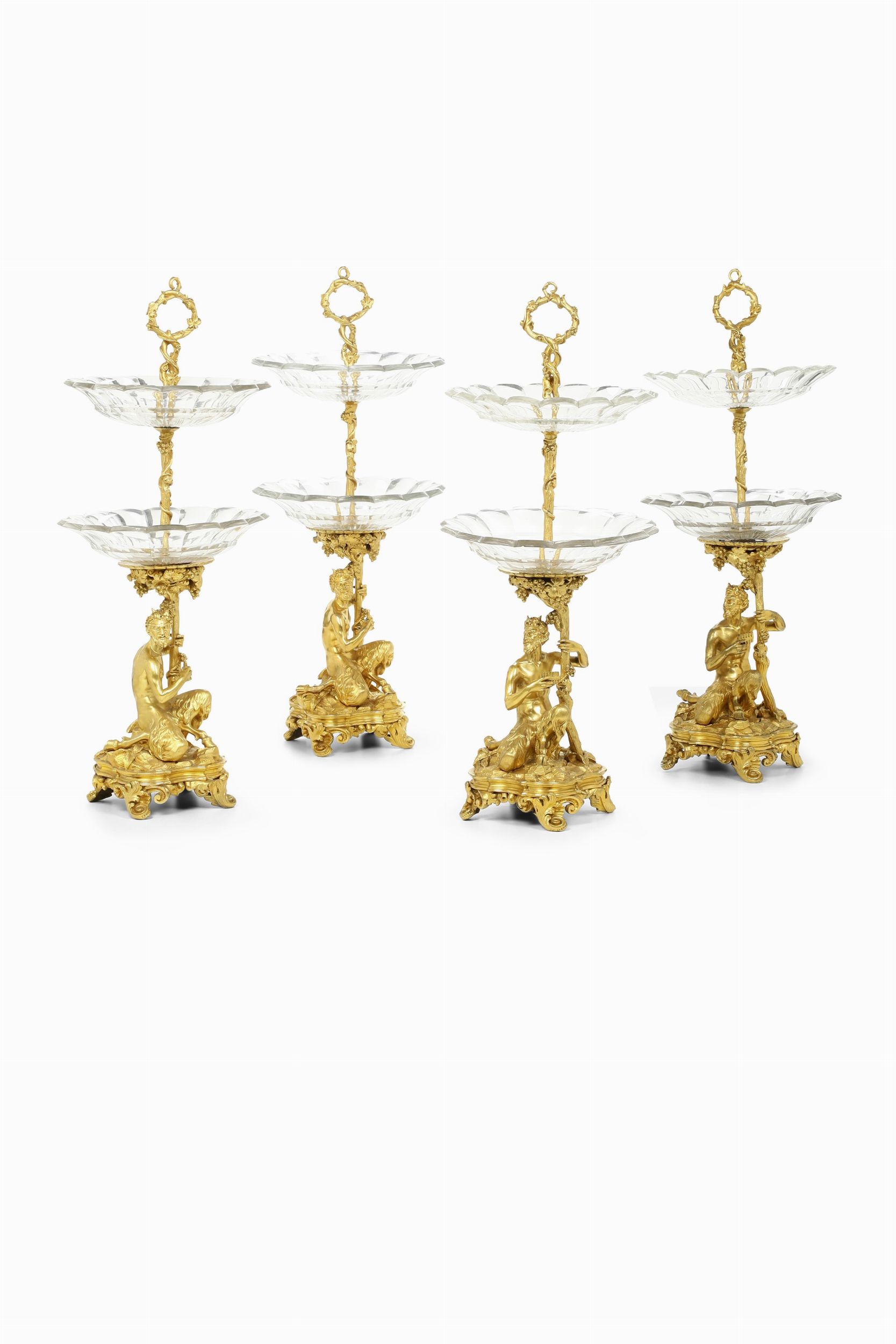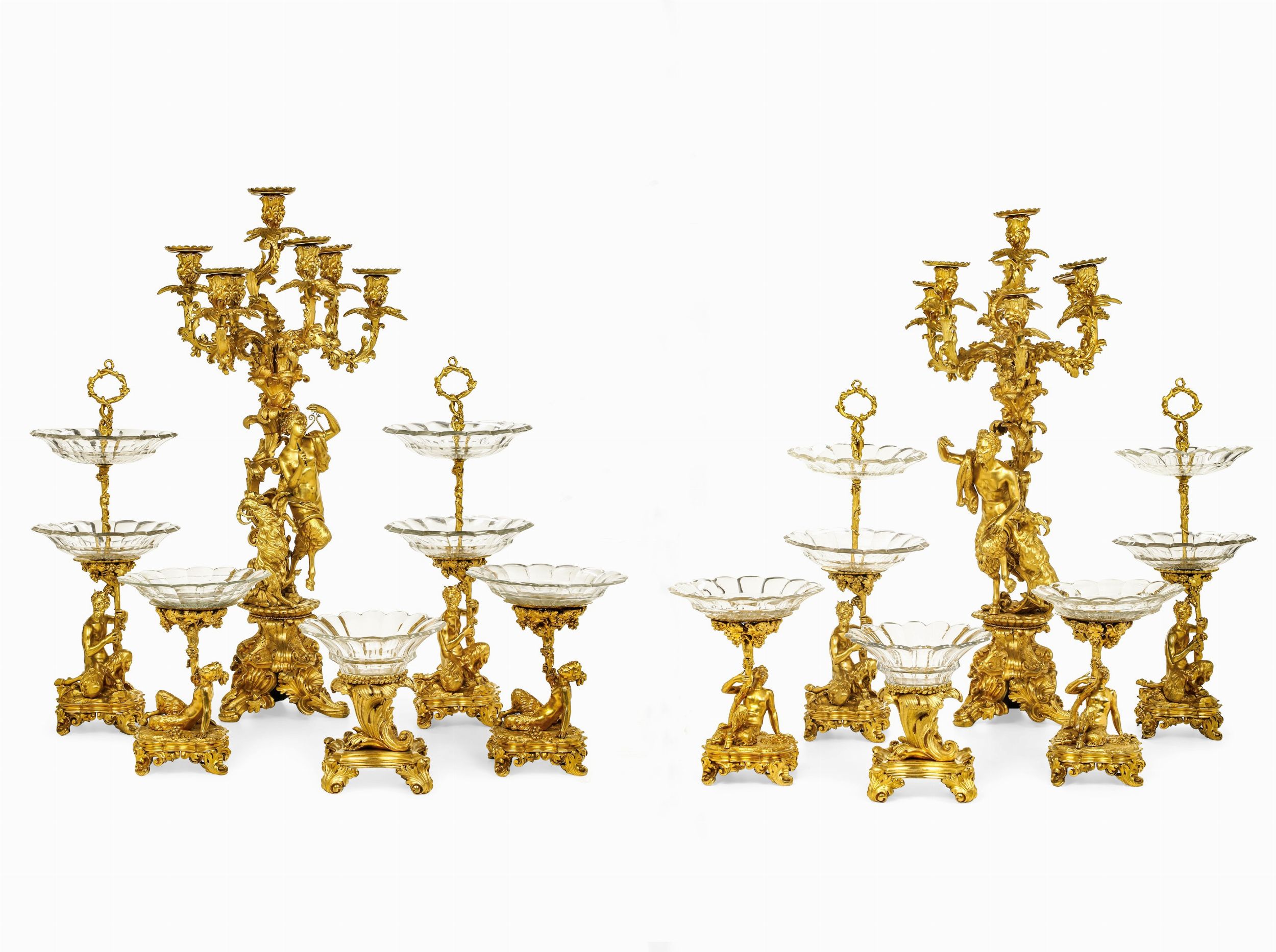 composto da una grande alzata con conchiglia sorretta da putti e coralli marini, due candelabri a sette fiamme, quattro alzate a due ripiani in cristallo molato, quattro alzate a un ripiano in cristallo molato con raffigurazioni di satiri e satiresse e tralci di vite e due alzate a un ripiano con coppe in cristallo molato e sostegni a cornucopie fogliacee. Sontuoso apparato per l’arredo della tavola, realizzato con un magnifico progetto scenografico-allegorico, ispirato ad una ideale arcadia naturalistica abitata da figure mitologiche messaggere di felicità ed abbondanza, è magistralmente eseguito negli stilemi dell’arte barocca. L’importante ensemble, raffinata commissione di una delle più importanti casate nobiliari lombarde, rappresenta per numero di componenti e per qualità esecutiva, una esplicative e preziosa testimonianza delle sfarzose composizioni per l’arredo di importanti convivi cerimoniali nel XIX secolo.