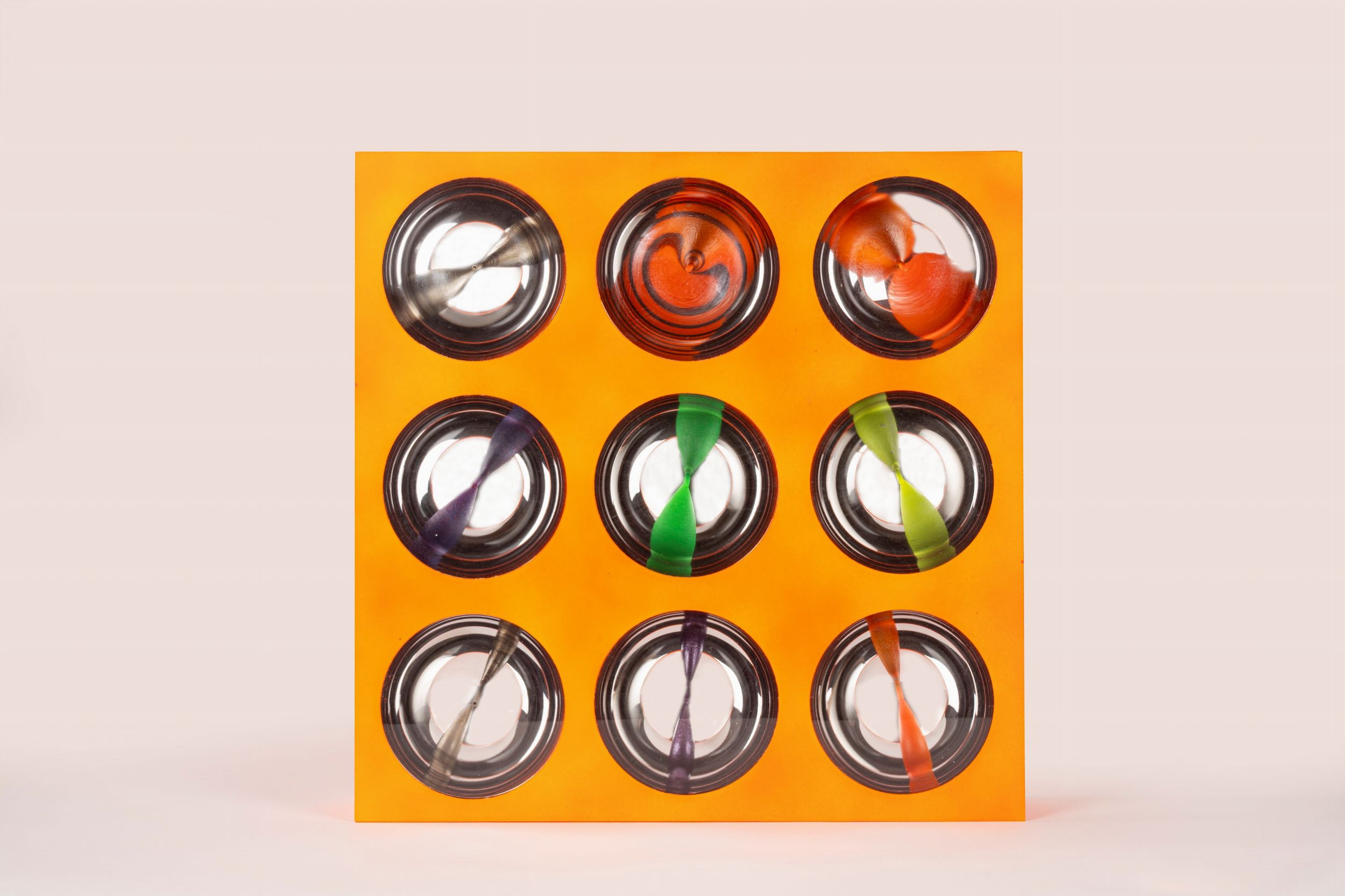 9 semisfere di metallo entro plexiglass, cm 52 x 52