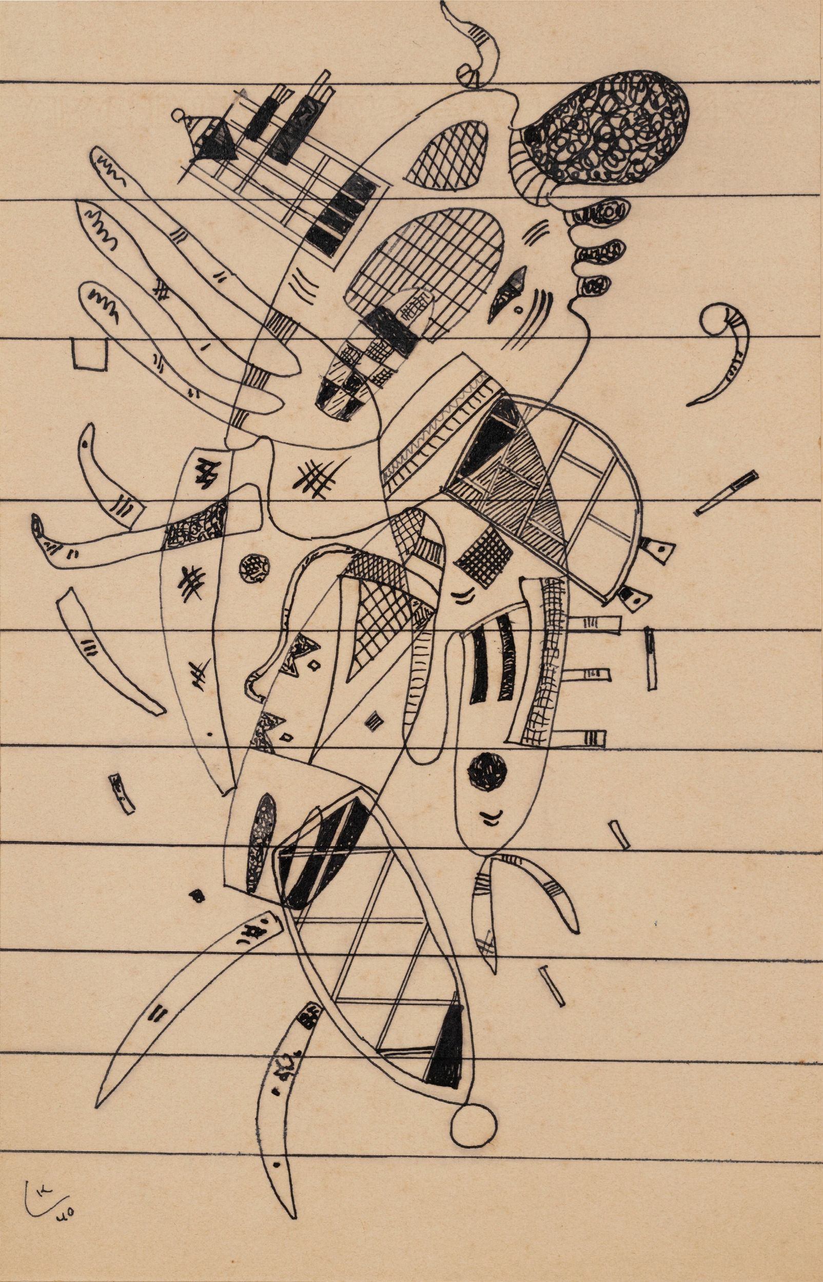 china su carta applicata su cartoncino, cm 27,5 x 17,5 1940 Siglato e datato in basso a sinistra: VK40 Al verso del cartoncino di supporto la dedica di pugno di Nina Kandinsky: En souvenir de l'exposition de Kandinsky Ă Madame Estienne firmata: N. Kandinsky e datata: 13/III/46