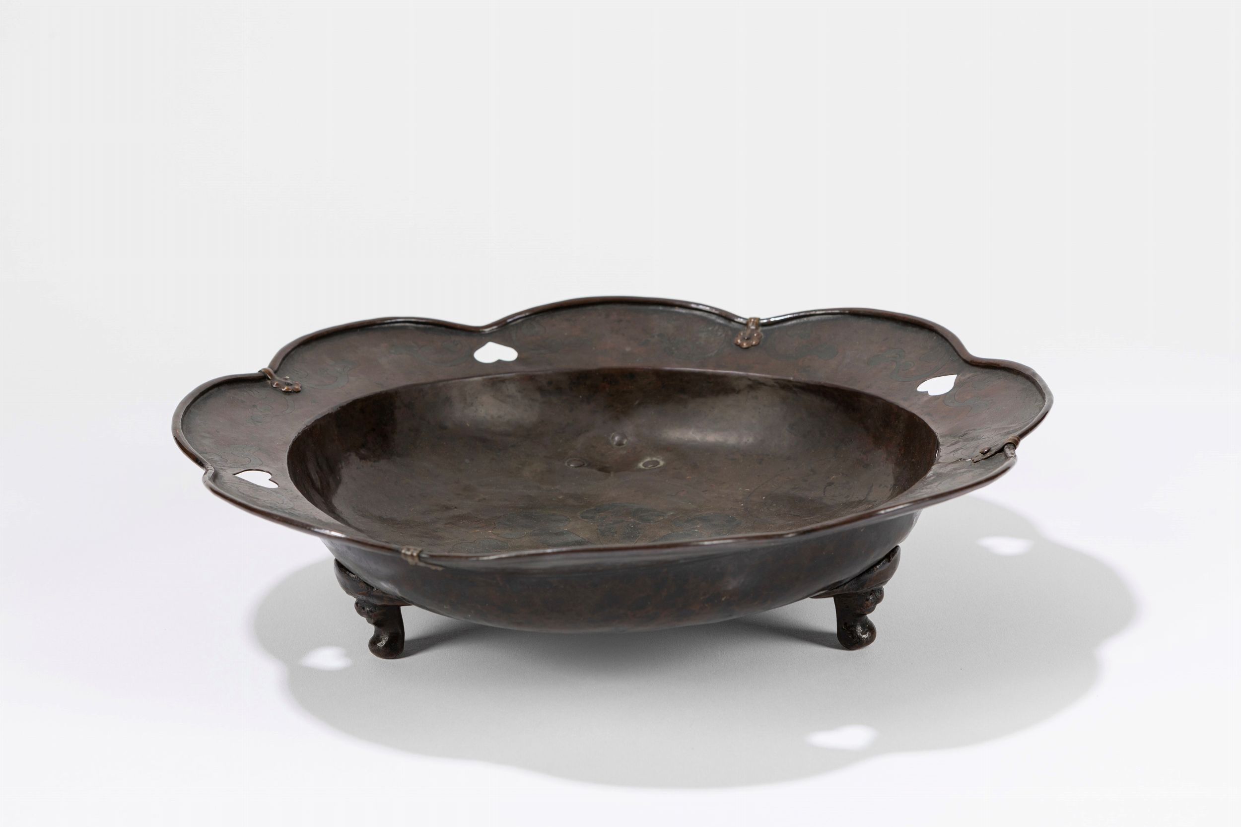 Manifattura Orientale, secolo XIX si regge su tre piedini stilizzati a guisa di mascheroni, traforato sulla tiera con motivi a cuore e inciso con motivi fogliacei; centrato da fiore tra nuvole 铜碗,东方制造,十九世纪