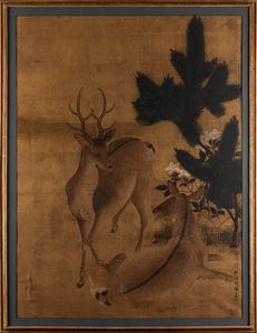h cm 136x104 Giappone, periodo Edo (1603-1868) raffigurante un cervo stante e un cerbiatto accovacciato in un [..]