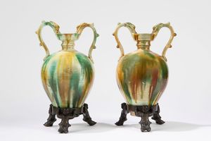 h cm 28,5 di forma ovoidale, le anse a guisa di mostro marino, su antiche basi in bronzo sorrette da tre bambini [..]