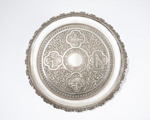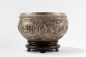 g. 2.835: d cm 39 x h 24 Birmania, fine XIX/inizi XX secolo di forma circolare, finemente sbalzata, raffigura [..]