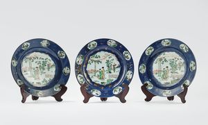 Notevole è la grande placca in porcellana famiglia rosa smaltata, firmata e datata 1928 da Wang Qi, uno dei grandi maestri cinesi del primo '900. La scena proposta rappresenta tre divinità taoiste, Magu, Shoulao e Liu Hai ed è legata alla longevità come segno di buon auspicio.