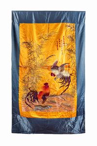 h tot cm 182 x l cm 114 Cina, 1930 ca. con iscrizione (difetti e tagli) æç»˜æ–—鸡的ä¸ç»¸ï¼Œä¸­å›½ï¼Œçº¦19 [..]