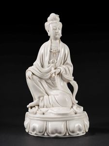 h cm 36 Cina, fine dinastia Qing raffigurante guanyin assisa su una base a fiore di loto mentre regge nella mano [..]