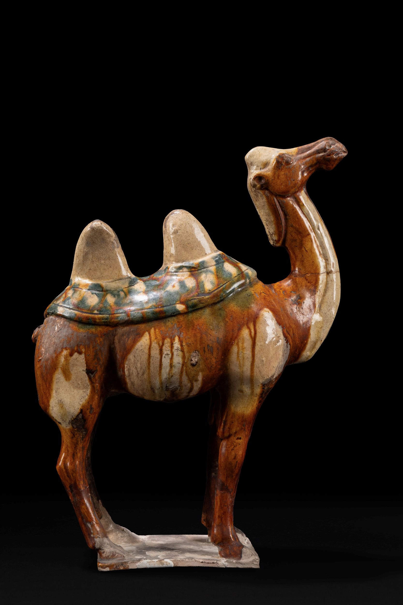 Cina, dinastia Tang (618-907) stante su base rettangolare e con il collo rivolto all'indietro (restauri) 三彩釉面陶瓷骆驼,中国,唐代(618-907)