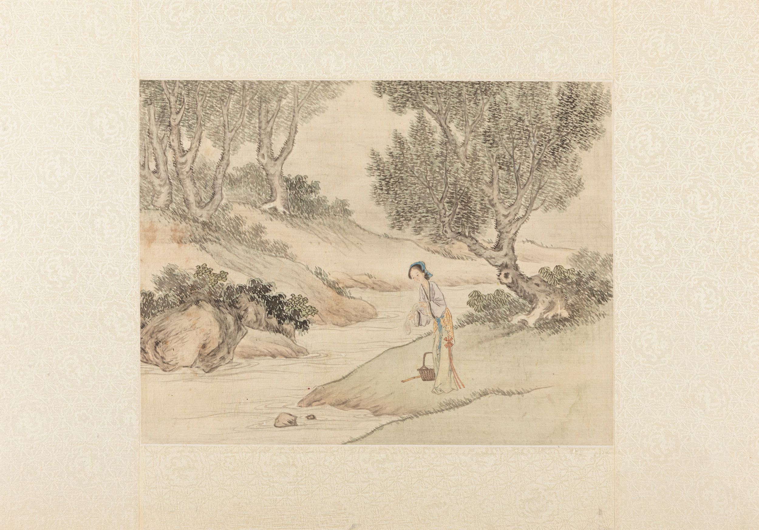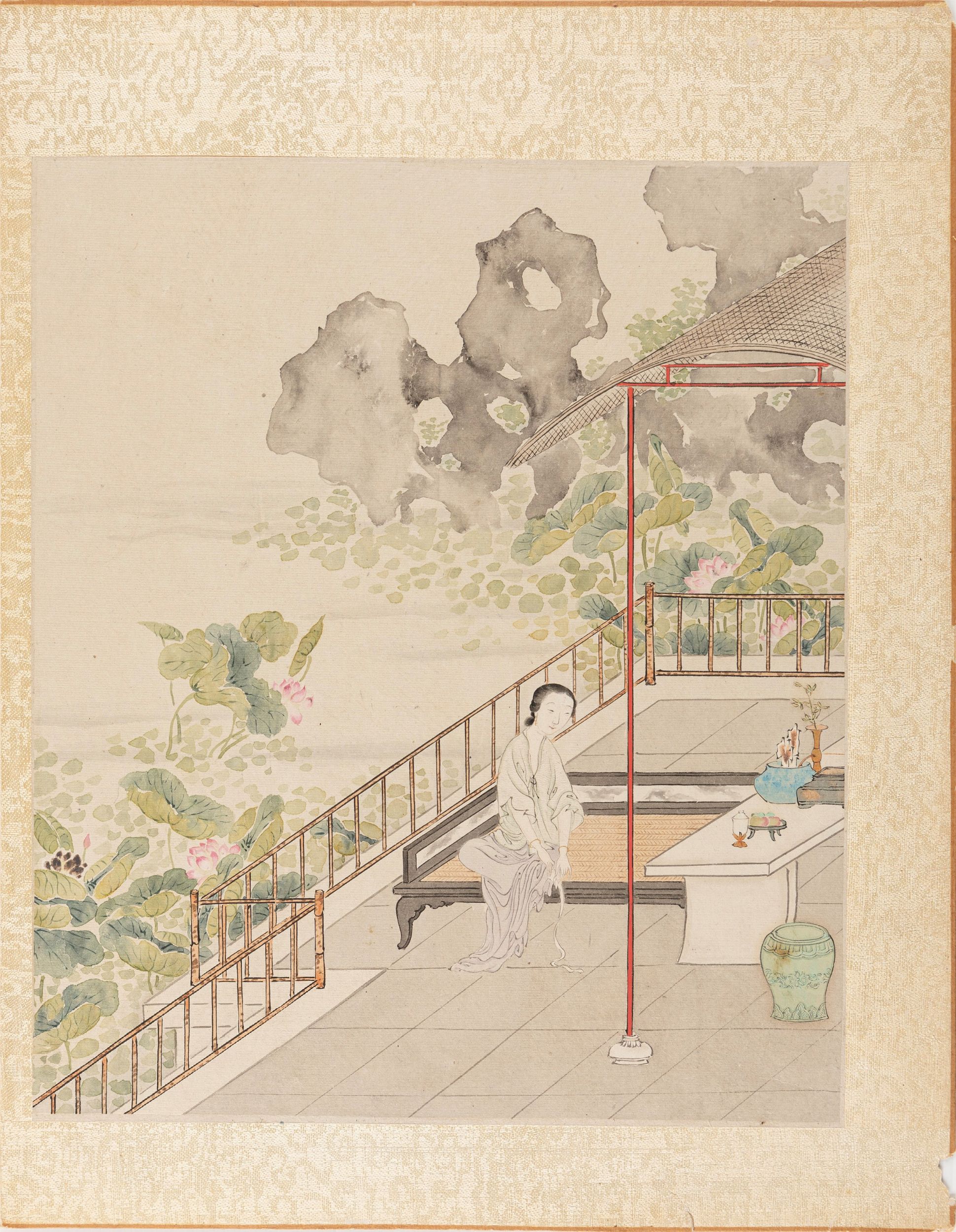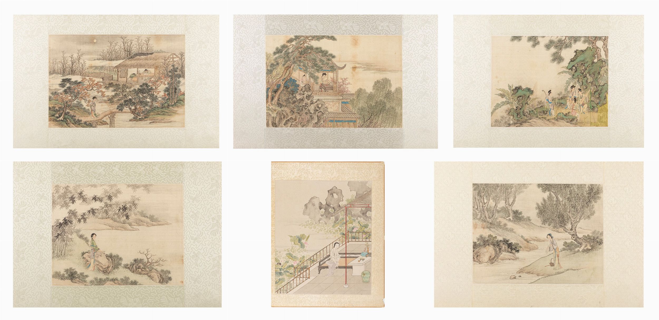 Cina, dinastia Qing (1644-1911) Raffiguranti dame dalle lunghe vesti tra paesaggi lacustri, pagode e giardini. 画作六幅,中国,清朝末期