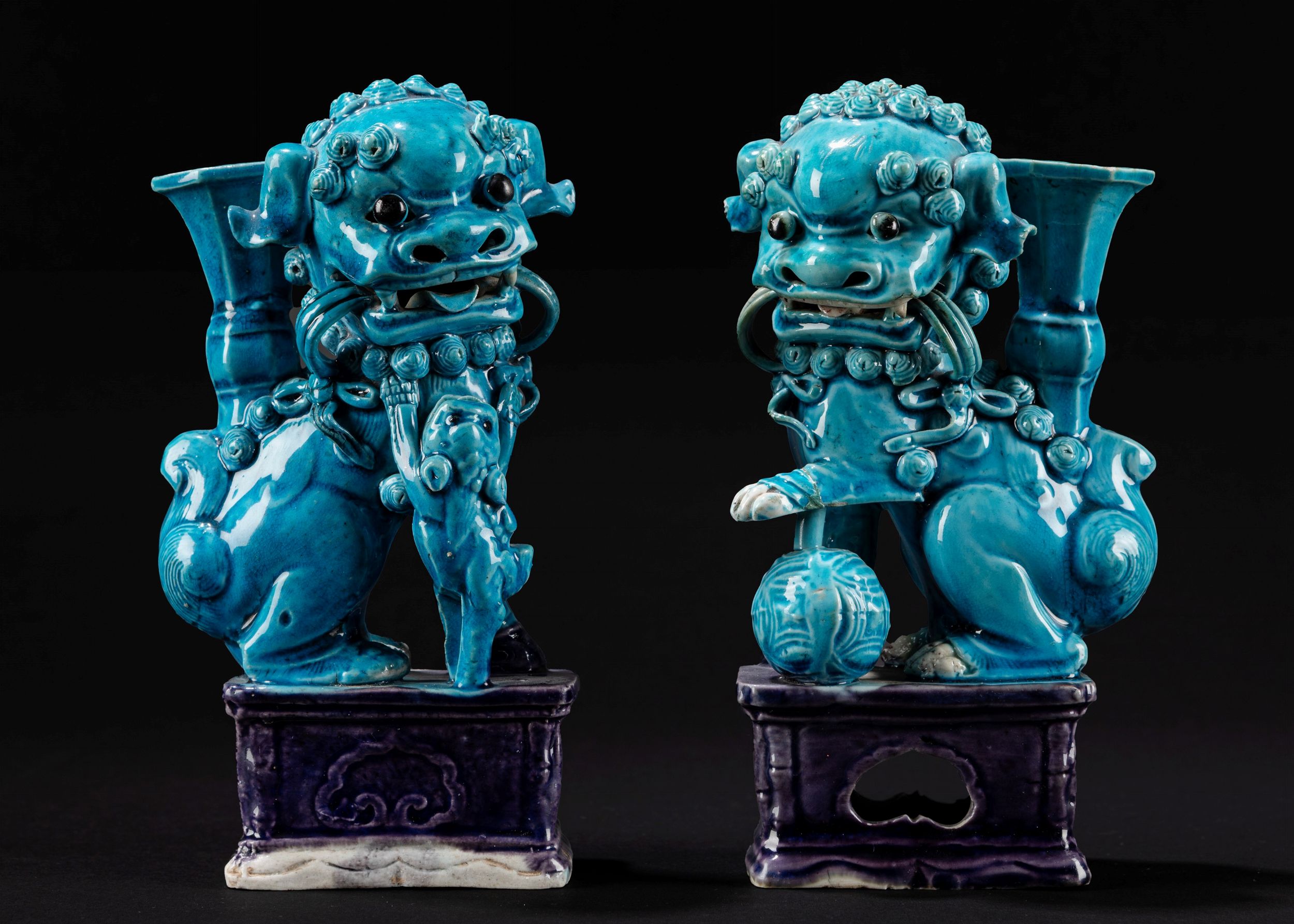 h cm 17,6 Cina, periodo Kangxi (1661-1722) entrambi seduti su un piedistallo rettangolare invetriato mentre reggono un vaso squadrato sul dorso; uno con una palla di broccato sotto la zampa sinistra, l'altro con il suo cucciolo (restauri) 绿松石釉瓷祥狮一对,中国,康熙时期(1661-1722)