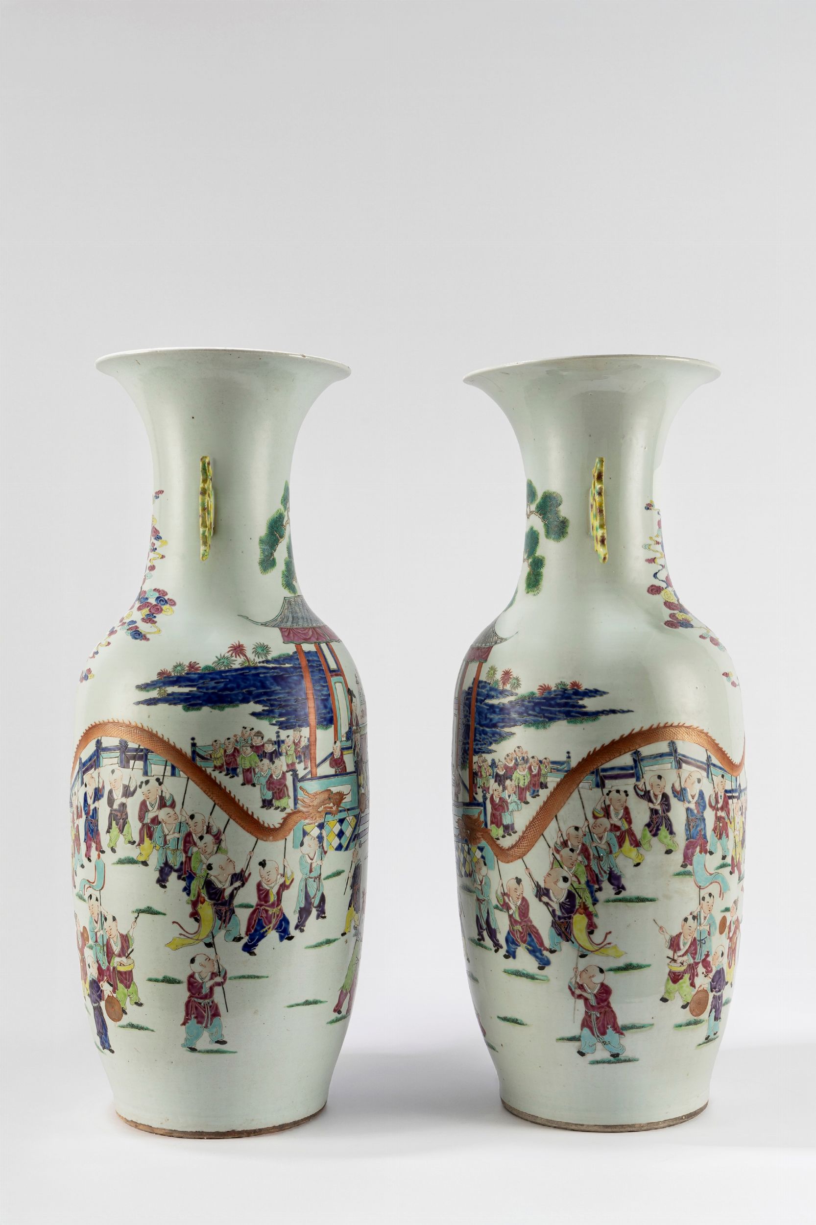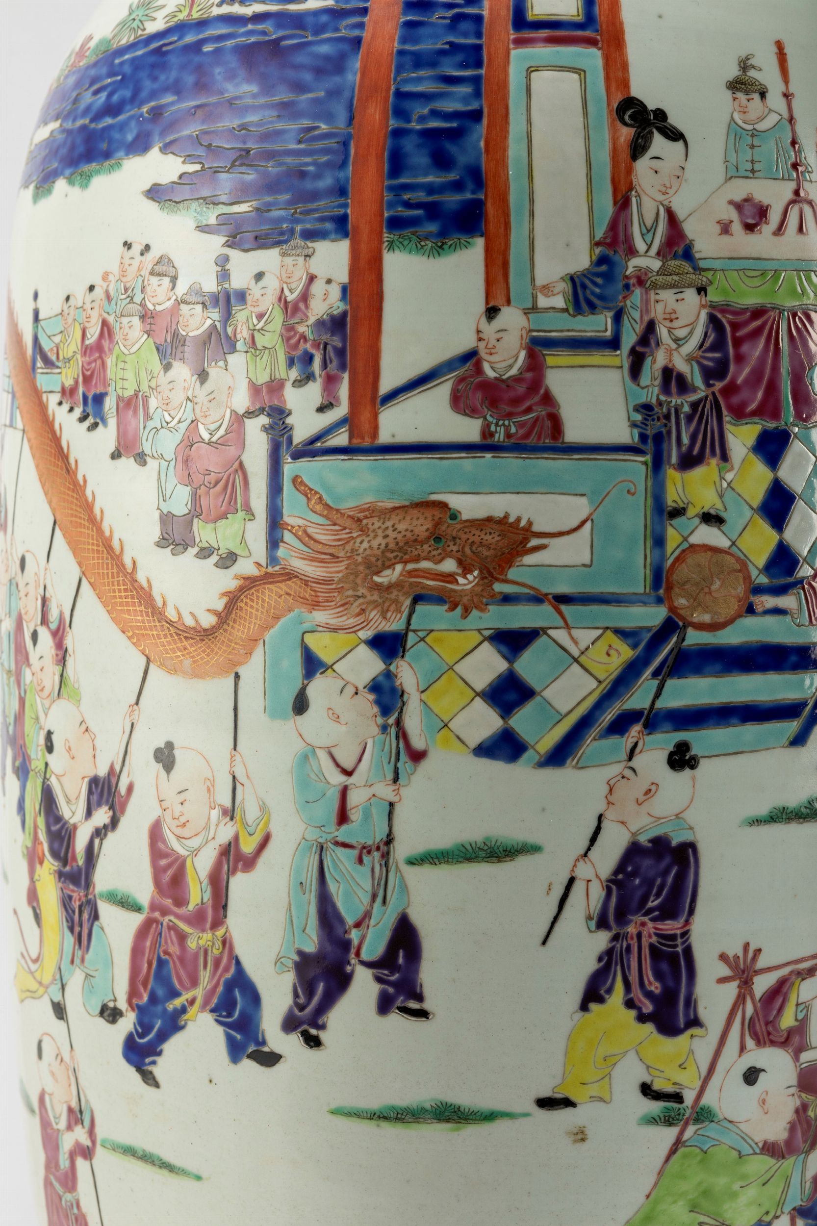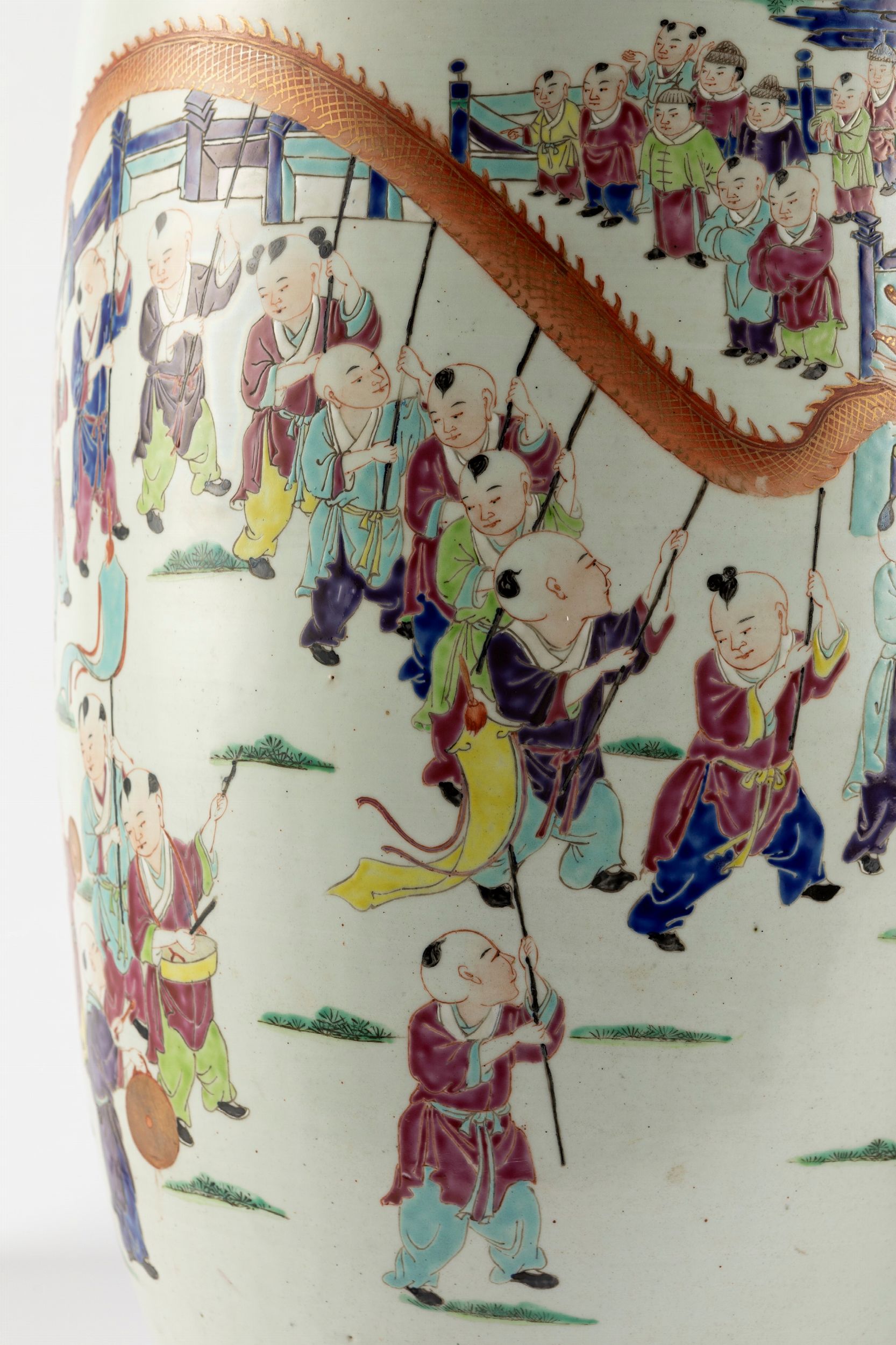 h cm 90,5 Cina, seconda metà del secolo XIX ben dipinti senza soluzione di continuità con il motivo dei ''Cento Bambini'' che giocano e reggono uno stendardo a forma di drago in un paesaggio festoso con pagode e motivi naturalistici con rocce e alberi; il collo del vaso presenta due anse stilizzate ed è decorato con figura di saggio tra nuvole e gru “百童”的大粉彩瓷花瓶,中国,十九世纪下半叶