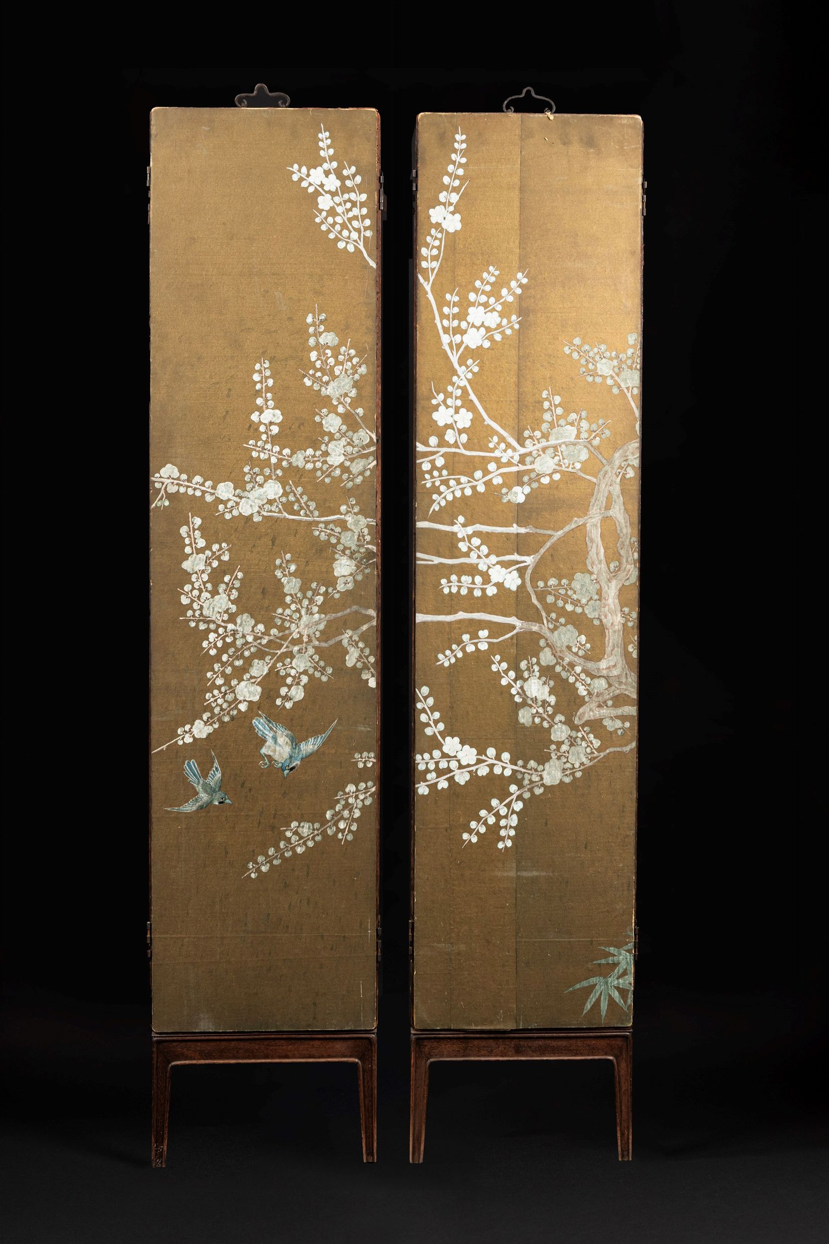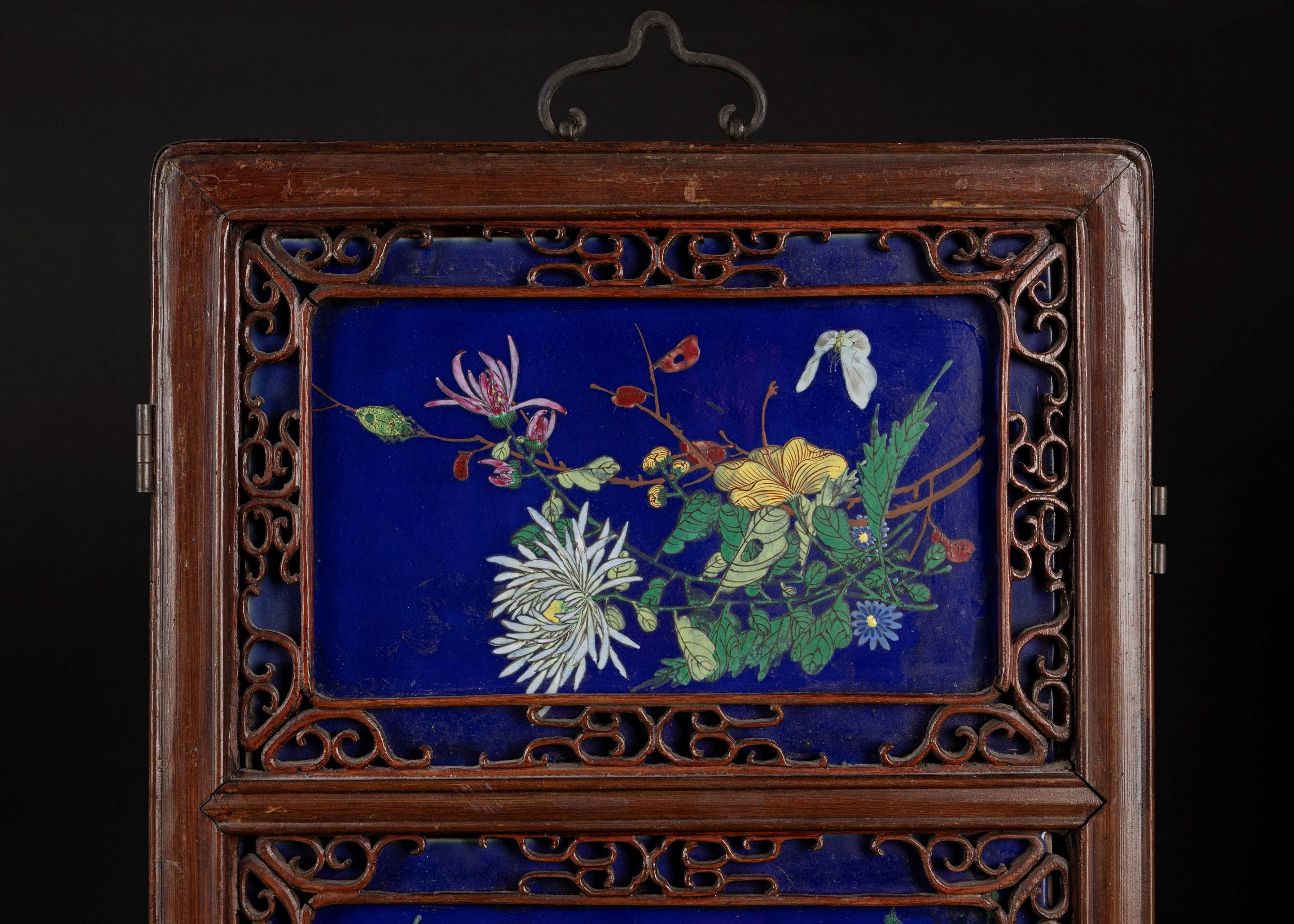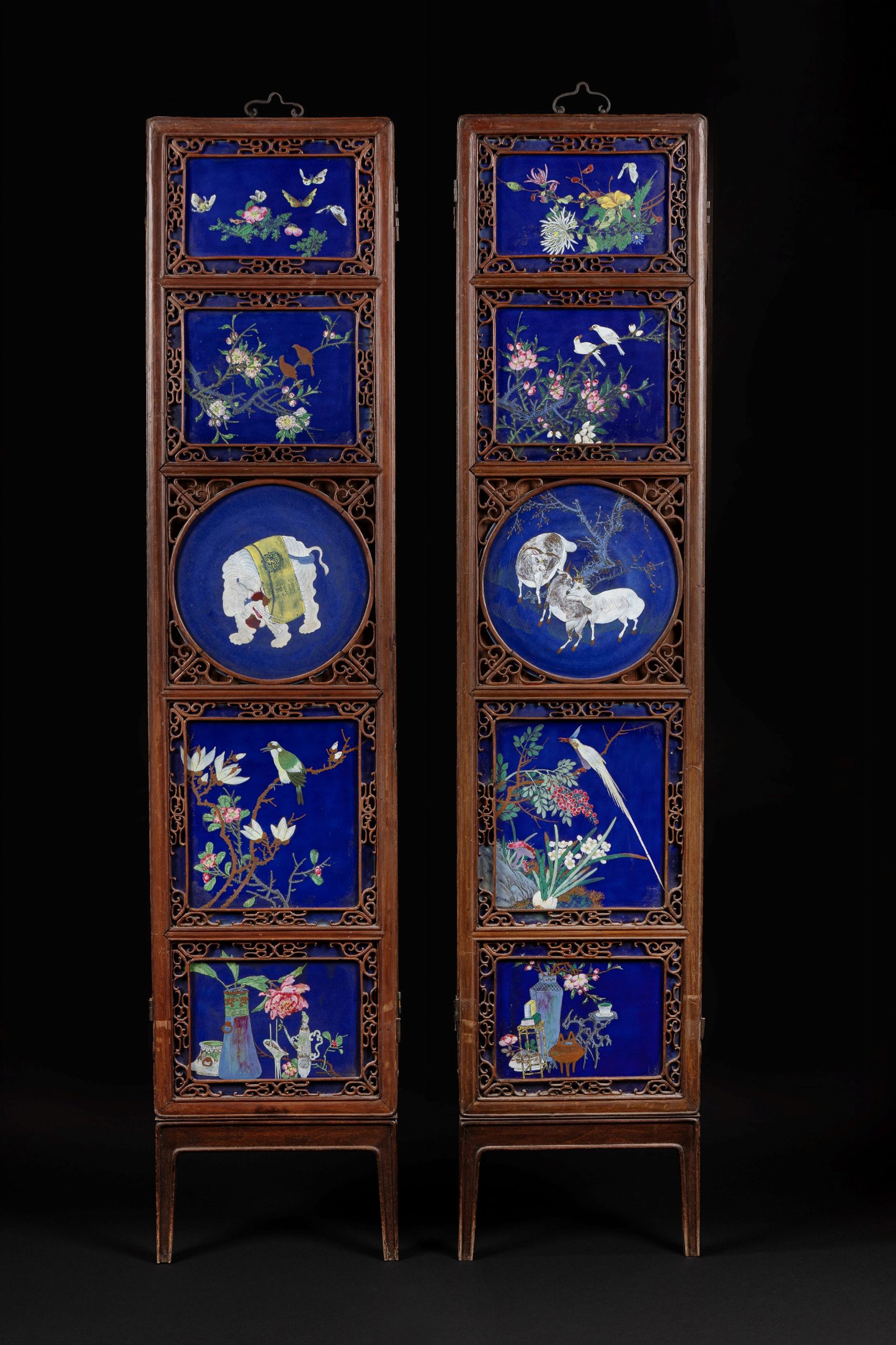 h cm 180 x l cm 39,3 Cina, periodo Guangxu (1875-1908) ben dipinte su fondo 'powder blu'; con i due pannelli composti rispettivamente da: quattro placche superiori di forma rettangolare raffiguranti un paesaggio floreale con insetti e farfalle e due rami di ciliegio con uccellini; due centrali di forma rotonda con tre caproni in un paesaggio con un albero di pruno e un elefante; le due inferiori quadrate con un grande uccello in un paesaggio floreale; le due inferiori con oggetti da letterato, fiori e antichità (peku); dipinto sul retro con rami e uccellini. 木框粉藍钱江瓷匾板一对,中国,光绪年间(1875-1908)