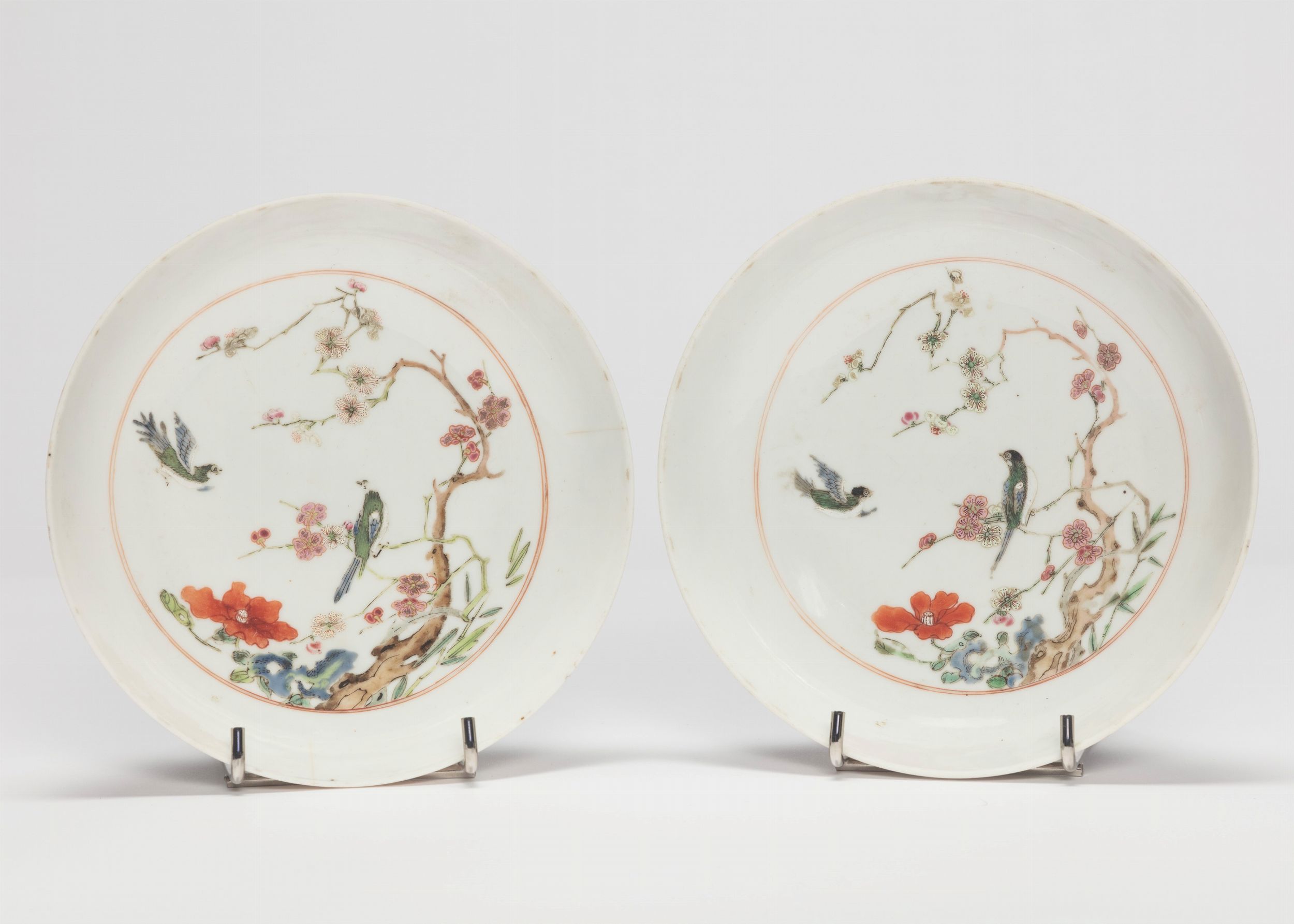 Cina, secolo XVIII ben dipinti con un paesaggio floreale e uccellini, marcati sul retro Qīng sǒu xuān zhì (清叟轩制) (difetti) 陶瓷小盘一组,中国,十八世纪