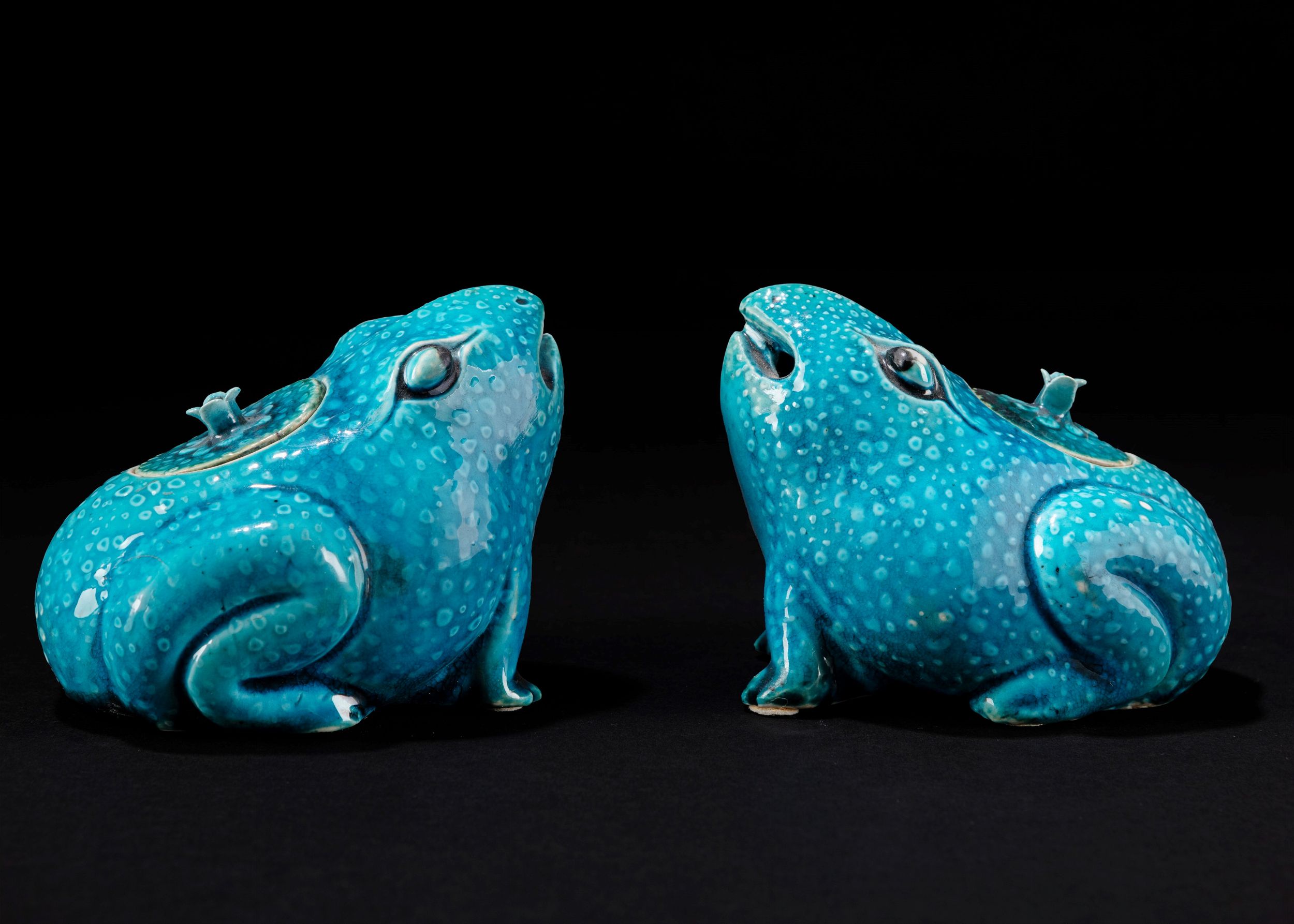 Cina, periodo Kangxi (1661-1722) entrambe con la testa alzata e la bocca aperta, il coperchio sormontato da fiore 绿松石釉带盖瓷青蛙一对,中国,康熙时期(1661-1722)