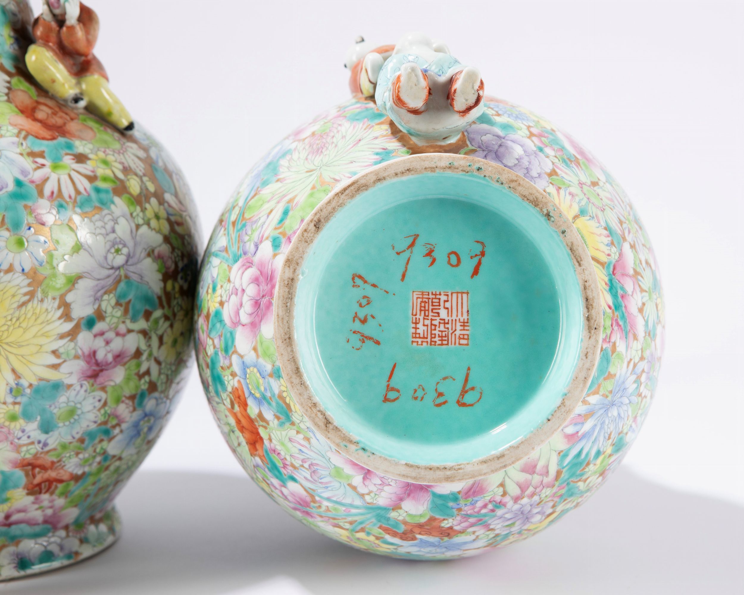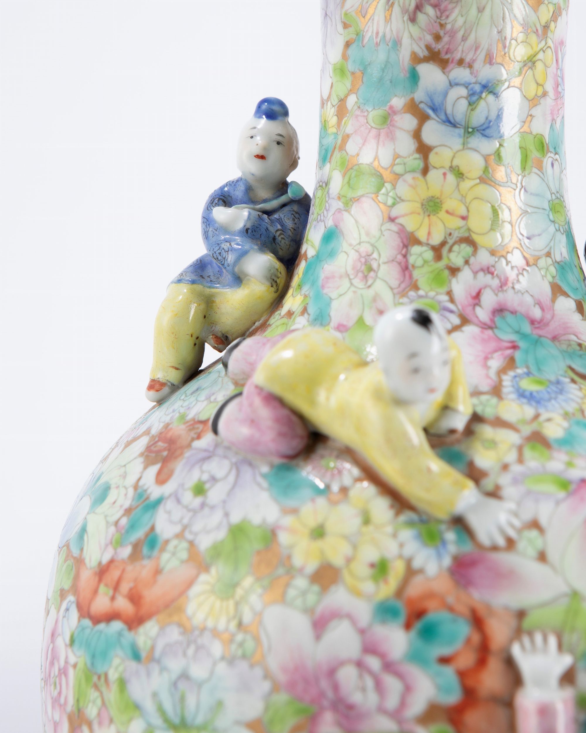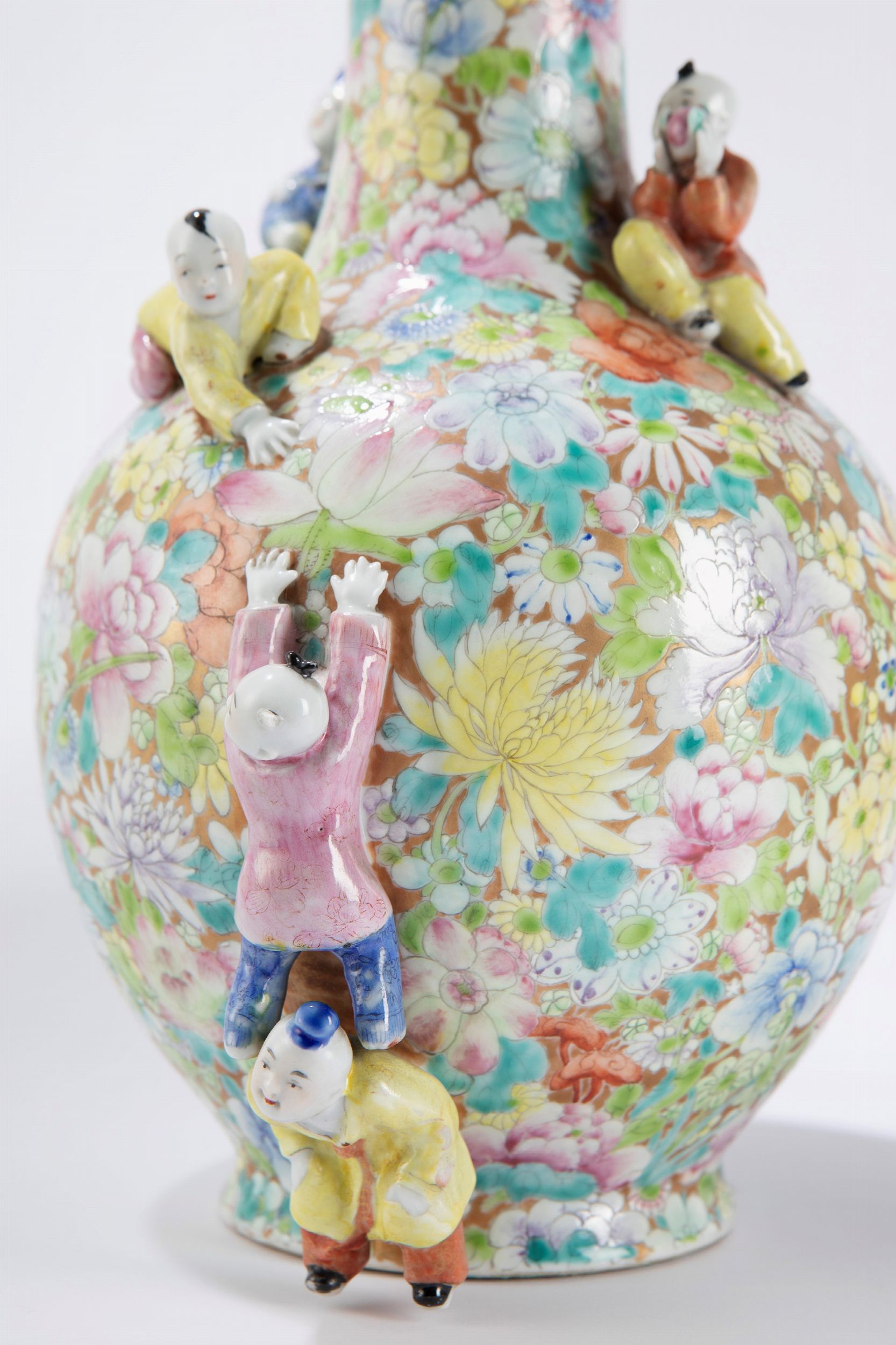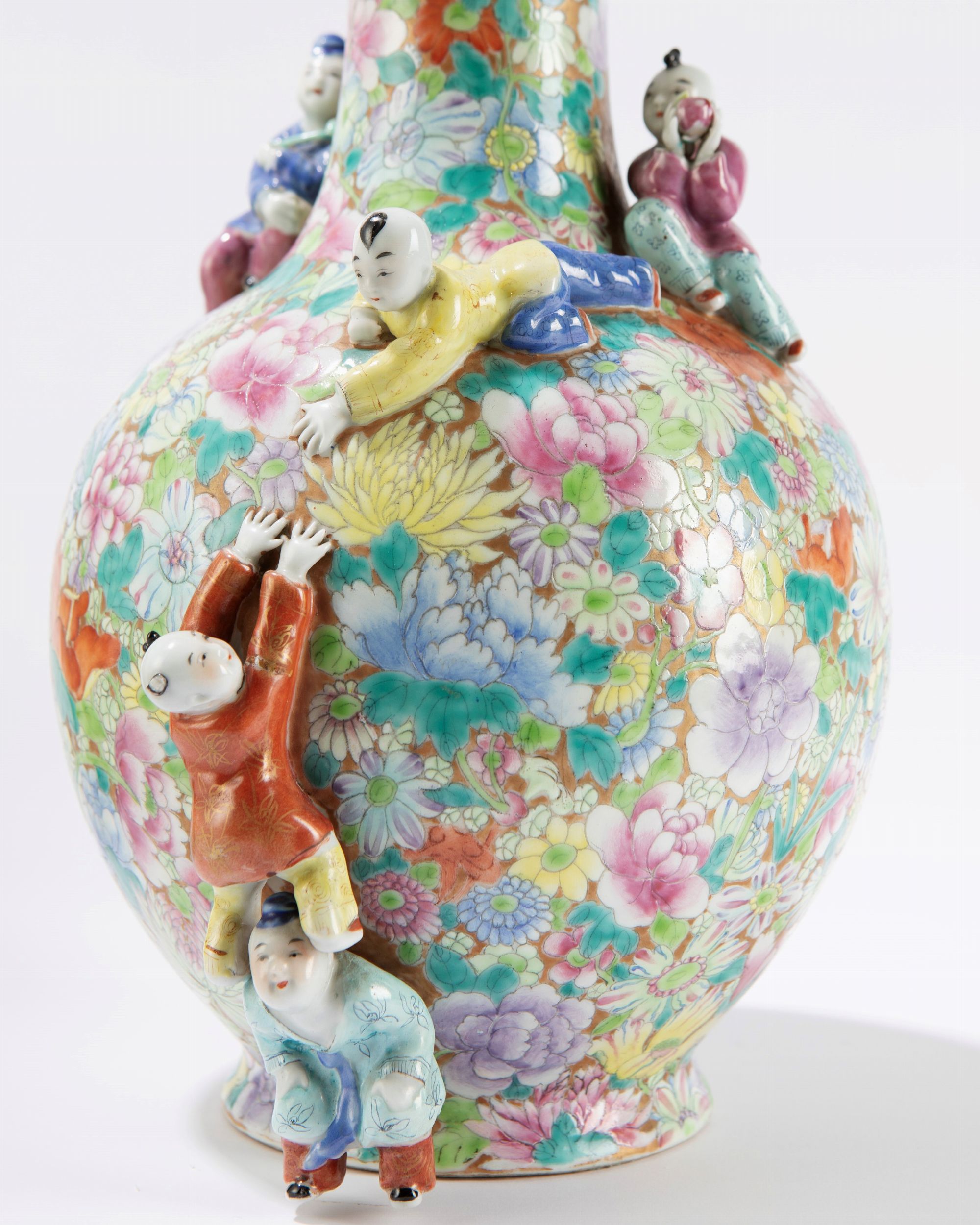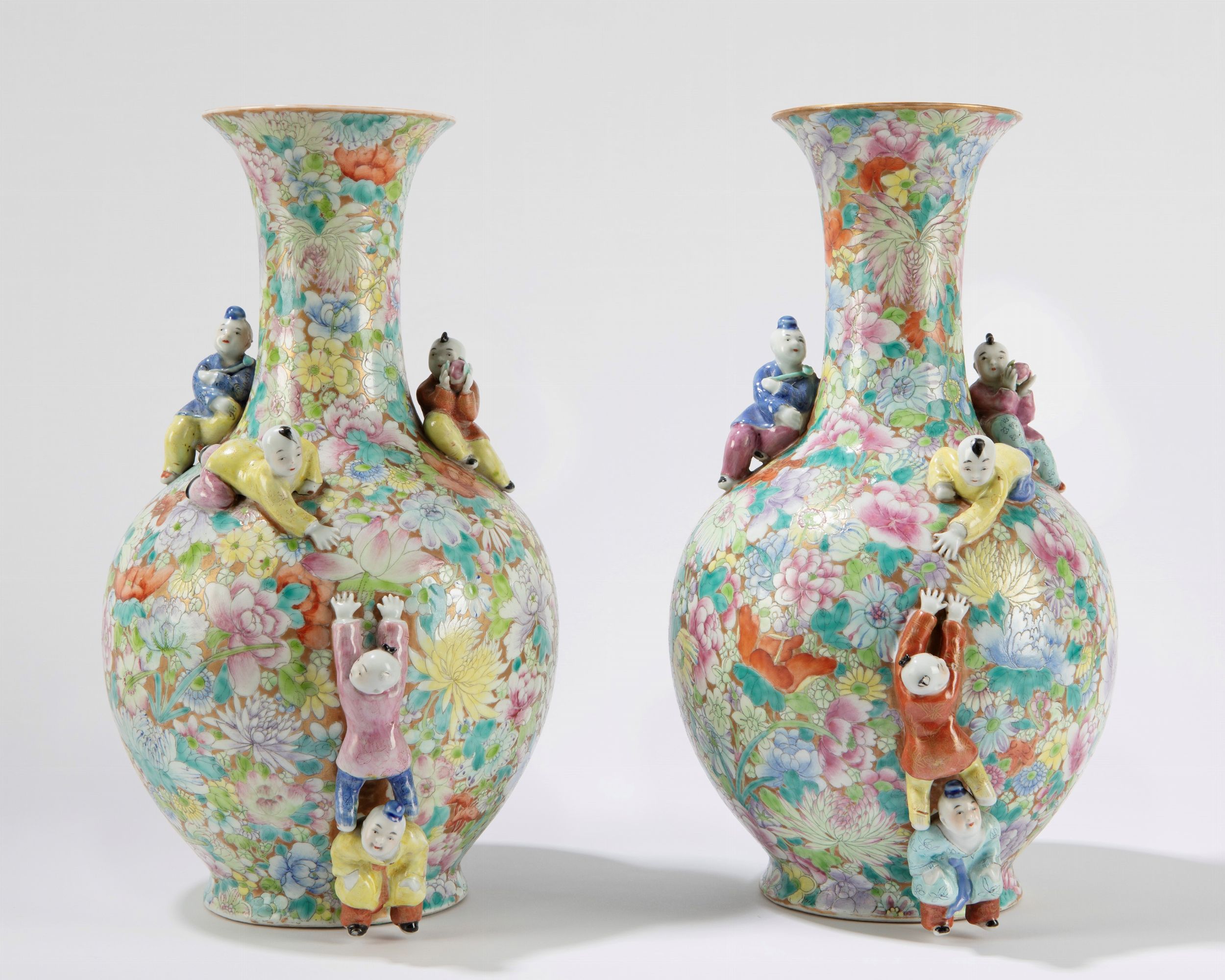 h cm 33,1 Cina, periodo della Repubblica (1912-1949) decorati a rilievo con figure di bambini che si arrampicano e giocano, alla base recano marchio apocrifo Qianlong (lievi difetti) 'Mille Fleur”千花粉彩瓷花瓶一对,中国,民国时期(1912-1949)