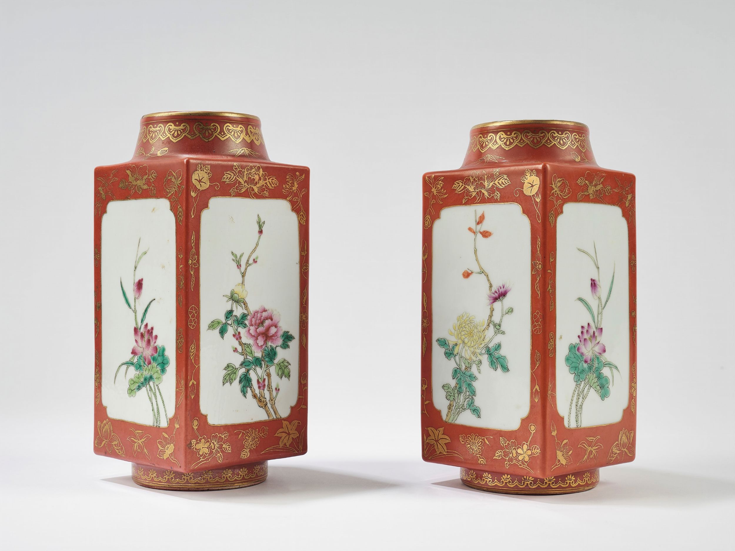 Cina, periodo della Repubblica (1912-1949) di forma squadrata con decoro oro su fondo rosso corallo, decorati con riserve contenente motivi floreali, alla base recano marchio apocrifo Qianlong 珊瑚色底陶瓷花瓶一对,中国,民国时期 (1912-1949)