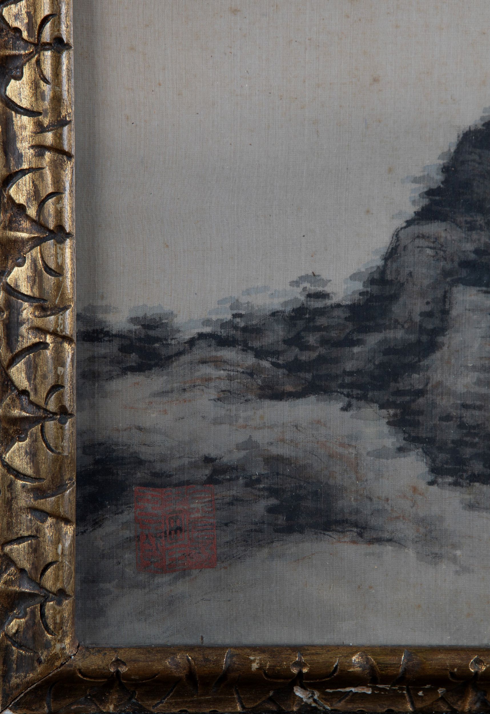 Cina, secolo XIX raffigurante paesaggio montano con alberi, pagode e pescatore; con iscrizione in alto a destra e marchio nella parte inferiore (difetti) 絲綢山水画,中国,十九世纪