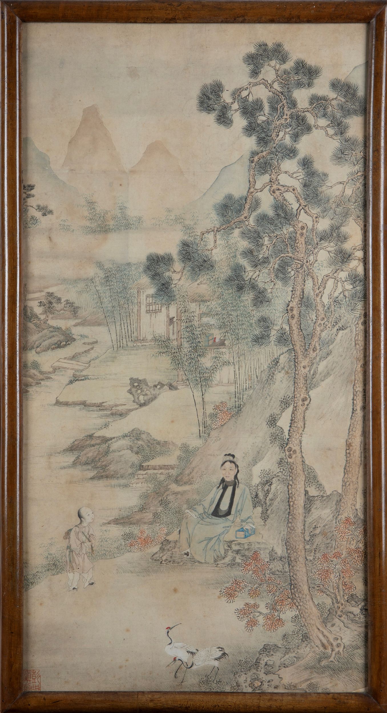 h cm 84 x l cm 44,5 Cina, secolo XIX raffigurante paesaggio montano con alberi e rocce, una pagoda che si affaccia su un fiume dove riposano delle gru; in primo piano una dama elegantemente vestita con una mano su un libro e il suo allievo; sigillo in basso a sinistra 繪有仕女及童子絲綢画,中国,十九世纪