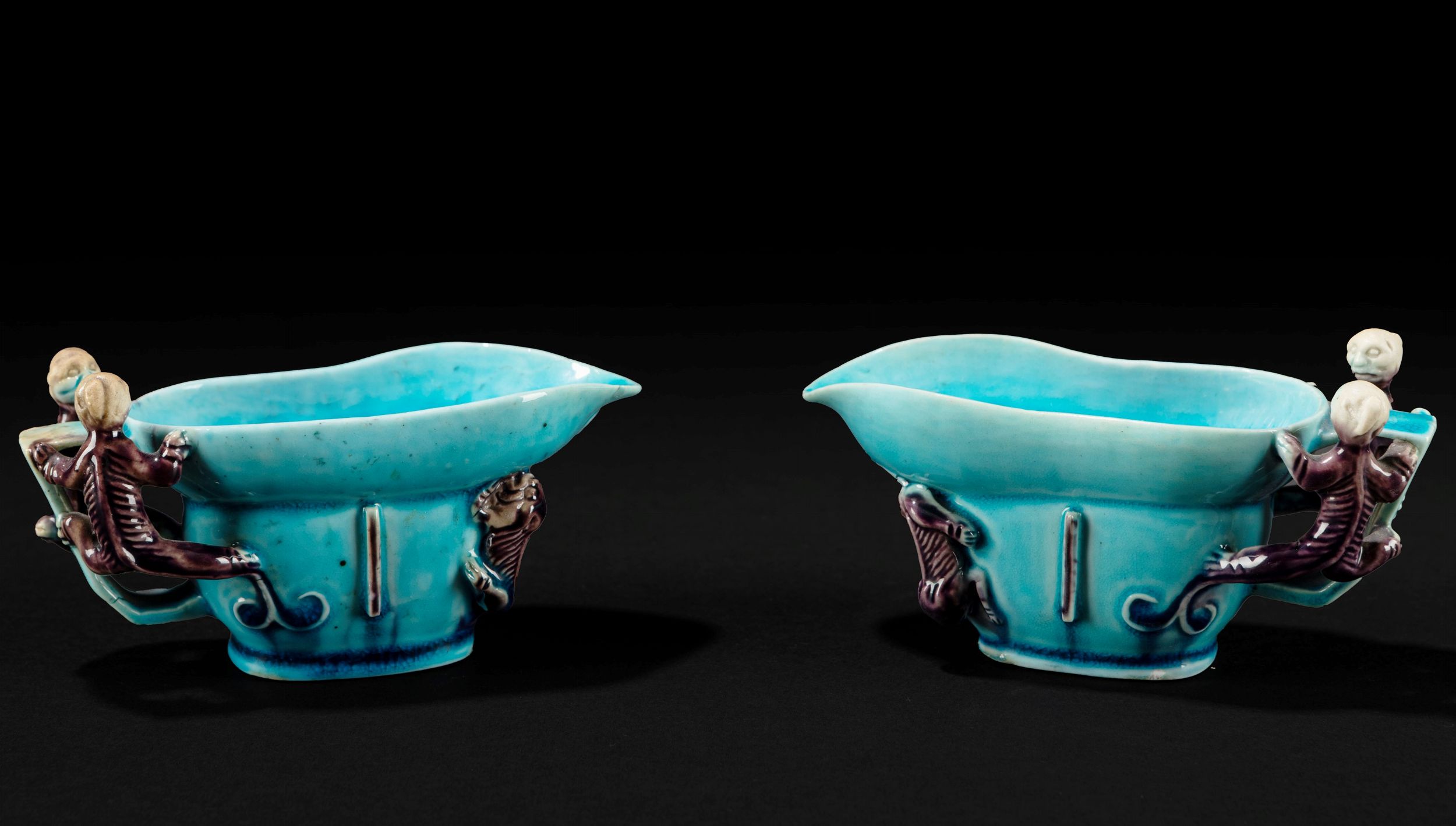 l cm 12 x h 4,5 Cina, periodo Kangxi (1661-1722) con manico sorretto da due scimmiette in porcellana invetriata melanzana e decorato a rilievo con ramage fogliacei e bestie mitologiche (difetti) 绿松石茄紫釉瓷祭酒杯两个,中国,康熙时期(1661-1722)