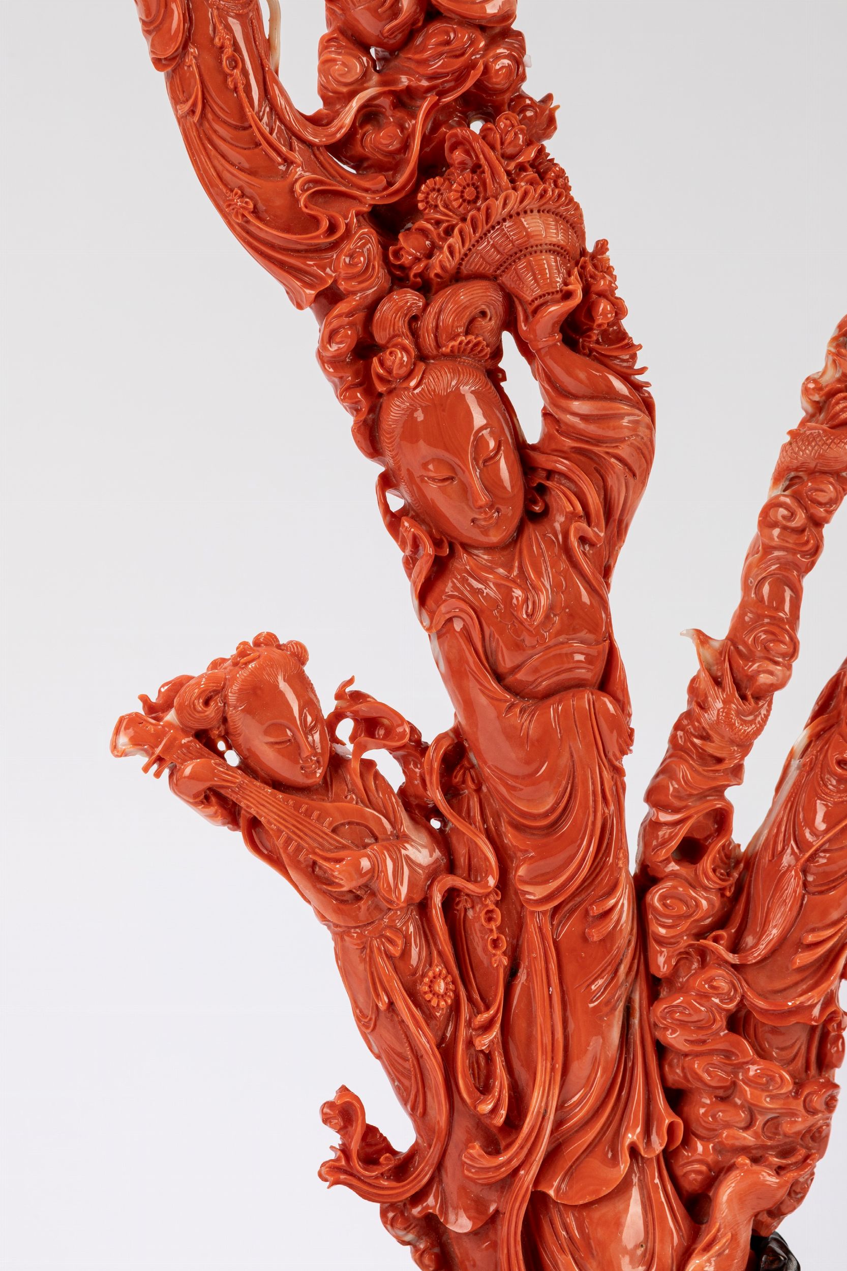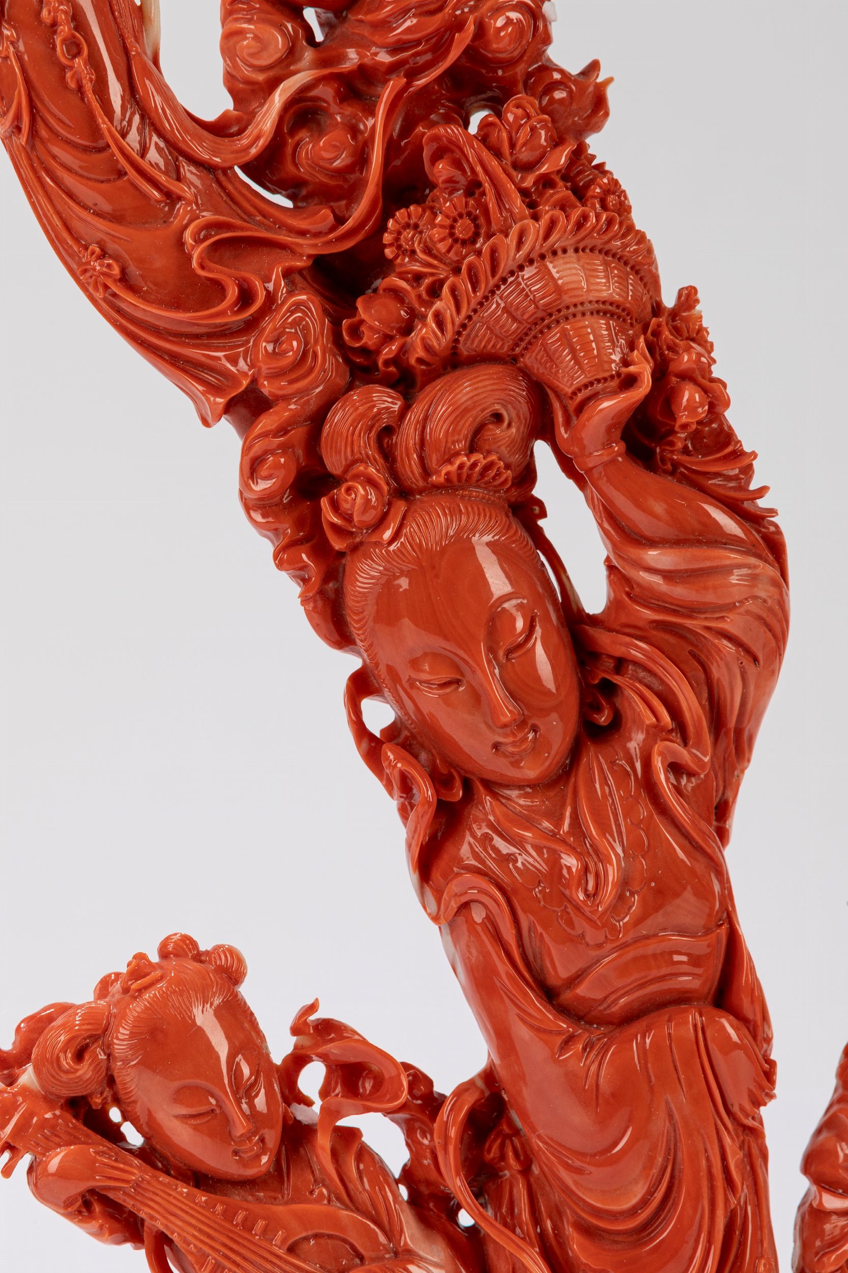 Cina, inizio secolo XX finemente intagliato e raffigurante sei dame tra nuvole, elegantemente vestite mentre reggono cesti di fiori o suonano strumenti musicali; e un drago attorcigliato tra nuvole e onde (base in legno) ☼大型红珊瑚凋像,中国,二十世纪初